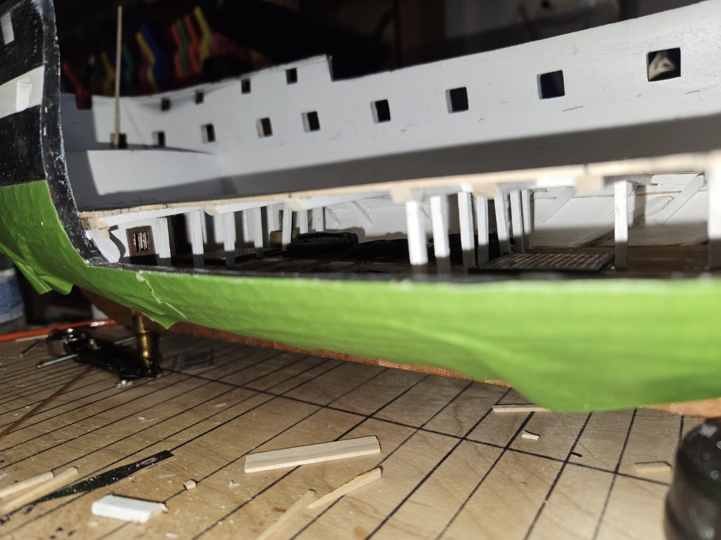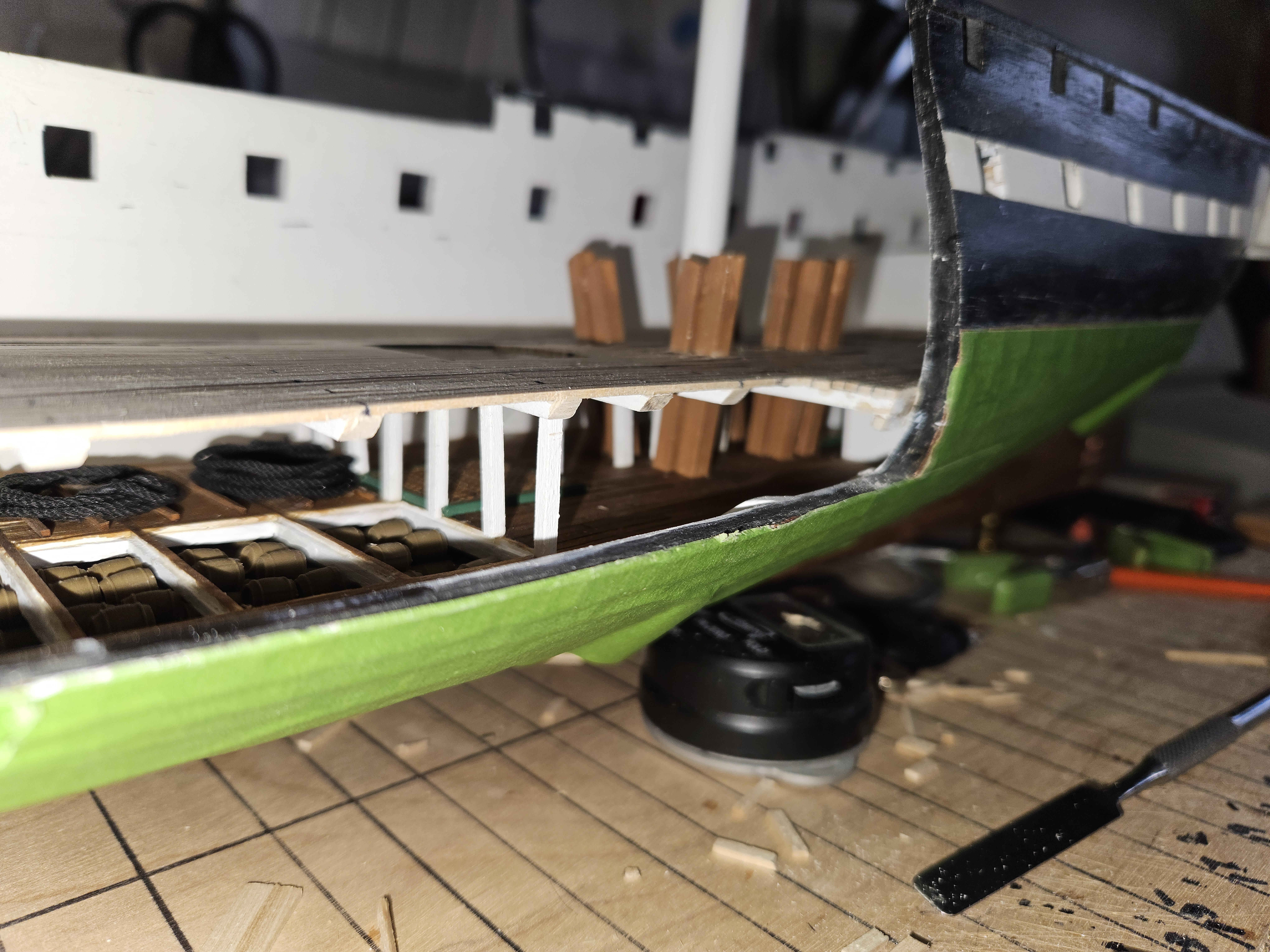 It has been awhile since I posted an update. The inner and outer hull is completely planked, the gunports are finished and I have started on the bow stem. Here are pics of the finished gunports. After completing the gunports, I pressed in between the planking a mixture of wood glue, water and fine saw dust and sanded back to smooth. After filled in the fine spaces with wood filler and then sanded smooth again. In the picture, you will notice the cap rail installed (just got a little ahead of myself there). Satisfied with the hull I then proceeded to the stem installation. This is where it became a little difficult. Using the template on 16 of the instruction book, I cut out the stem and knee, sanded the knee tapering from the stem to 1/8" at the leading edge of the knee. I then cut the slot for the bowsprit gammoning (which was not easy) and then installed the stem and knee as per the instructions. It fit perfectly, which led me to the conclusion, the 3D printed hull form came out dang close to the plan. The following day, after the glue dried (used wood glue to allow for minor adjustments before setting), to validate the knee and fit, I picked up in the instructions where it recommends to test fit the photoetched brass bow grating. It did not fit well at all. The edge of the grating against the hull needs to have a notch cut to fit around the stem. If I did not cut the notch, the grating would be too high covering the access ports. I cut a notch out of the grating edge that goes against the hull and then test fit again. What I noticed this time is the slope of the grating (will address this next). If you look at Figure 26, Section B, you will notice that the grating is on each side of the stem, not continuous line across the section. This indicates a notch is cut to fit around the stem. Additionally, from the USS CONSTITUTION website, this drawing also depicts a notch in the grating around the stem. Back to the slope of the grating, it was too great, almost to the point of being ridiculous. Looking at the knee and comparing to the profile drawings in the book, in Marquet's and the multitude of plans from the Navy, it was too high. If you look at Photo 9 on page 24 of the instruction book, you will notice that the knee is high. If you were to take a straight edge and place it on the cap rail at the forward rail where the hull is cut out on the spar deck and then place the straight edge on the rail at the bow, it will then intersect just at the notch behind the top of the knee. This is further reinforced by Figure 26 on page 48. Here is what I mean by a straight line from the railing to the notch in the aft of the knee. Also, I felt it necessary to test fit the britannia metal piece for the knee, and it fits perfectly. So, how much fore-aft slope is there in the grating? There, as far as I can find, no cross-sectional drawing that show this. Using the drawing from the museum, you will notice the slope by looking at the head against the gammoning. Using that drawing, I estimate the slope to be approximately 11 - 12 degrees. Next steps, painting of the hull, inside and out. After that is completed, I am going to jump a little ahead (again) and copper the underwater hull. With the significant number of plates to adhere to the hull, that should take a good while. Cheers, Brian