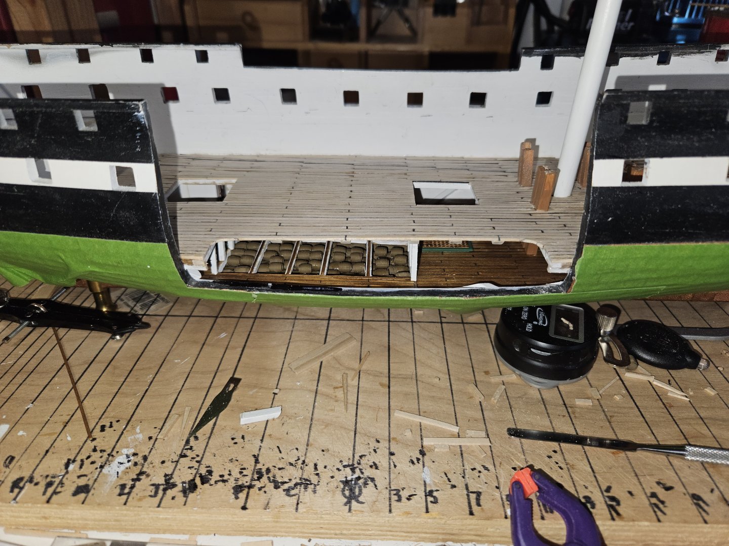 From the last pic to the current, I did make progress - just failed to document here. Using the method I described above (November 28th post), I was able to install all cross beams and hatches. Prior to laying the deck, I outfitted her with a full complement of stores. The casks are 3D printed (could not find the correct sizes) casks. Here is a picture of the different types. And with all beams and casks in place: Using .03in thick by .06in wide white pine, I commenced planking the Orlop deck. The black between the planks is permanent marker. The section amidships is the cable tier. I researched and researched how that was in 1812 and found nothing, or scarcely nothing. So, I suspect that stores were in the hold below the cable tier deck and those sections could be removed for access to the hold. I installed the cable tier deck on the starboard side and left the larboard side open to the hold. The small section against the hull is the carpenters walk, which will be planked as the rest of the deck. And this is the finished Orlop deck looking forward and aft: After completing the deck, the next step was to install the coamings and gratings for the hold access. Because the BJ kit does not include the parts for the Orlop (only Gun and Spar decks), I researched other model parts providers and found 1:72 scale gratings at drydockmodelsandparts.com. Their actual thickness is .03in, which comes to 3 inches at 1:96 scale. I really do not think anyone will be able to see a .01 difference. Here is the forward hold coaming and grating: After installing all coamings and gratings, I am at a decision point. Should I move onto the Berth deck framing, or continue with the Orlop deck knowing that what I install may have to be adjusted due to the Berth deck beams. I moved onto the Berth Deck beams and will install the finishing touches (figurines (still debating this one), bulkheads, doors, anchor cable, spare anchor, etc.). So, moving forward, I installed the aft and forward most beams. Using basically the same method for installing the Orlop beams, I placed a stringer (?) forward to aft to guide me in the installation. Here is where I am today: The cross beams will go on top of the stringers along the starboard and larboard sides and under the centerline stringer. Cheers, Brian