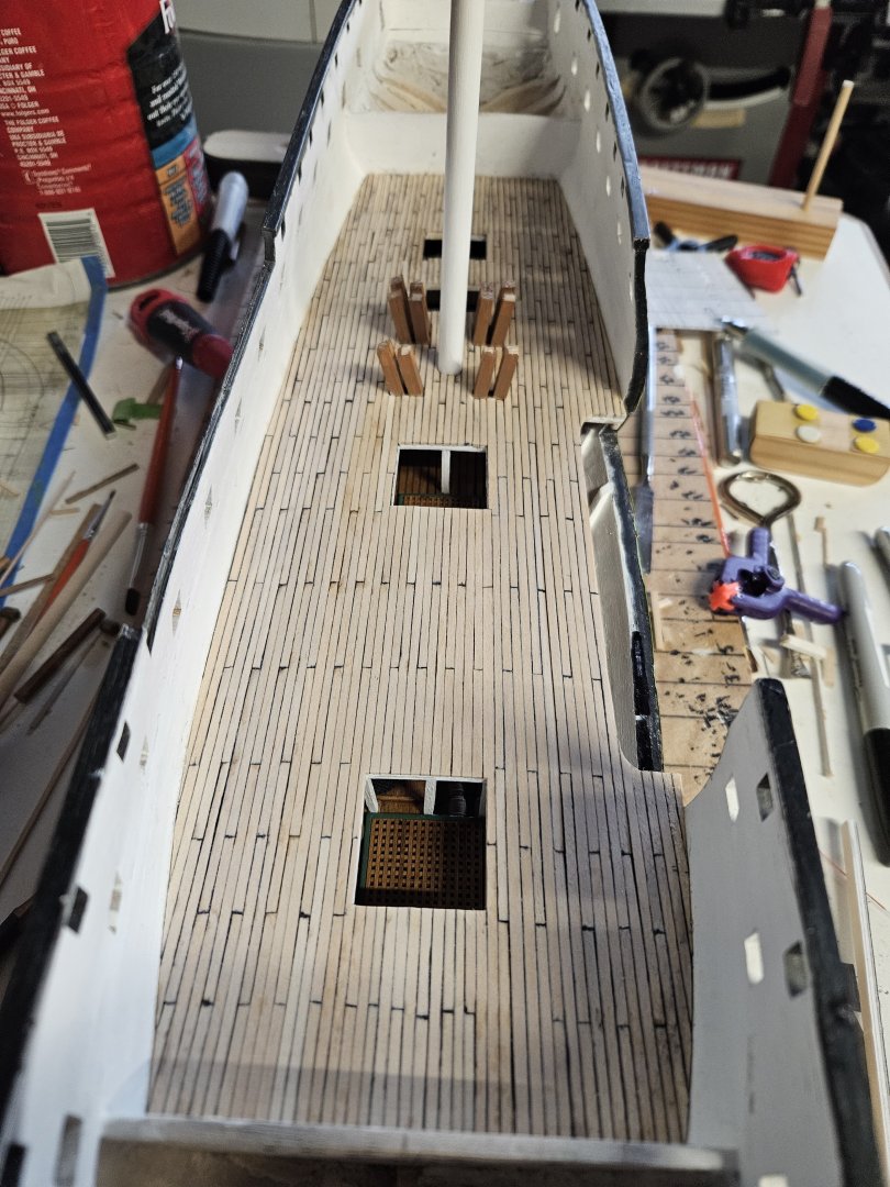 The Berth Deck decking is installed (still need to stain and varnish). For the port side opening, once I planked to just beyond the cable tier stanchions. Once the glue dried, I cut away the remaining beams and stringer. This opened up the viewing of the Orlop Deck. Next steps are to stain and varnish the deck. After that, move onto the hatch coamings and gratings, then install the ladders to the Orlop deck.