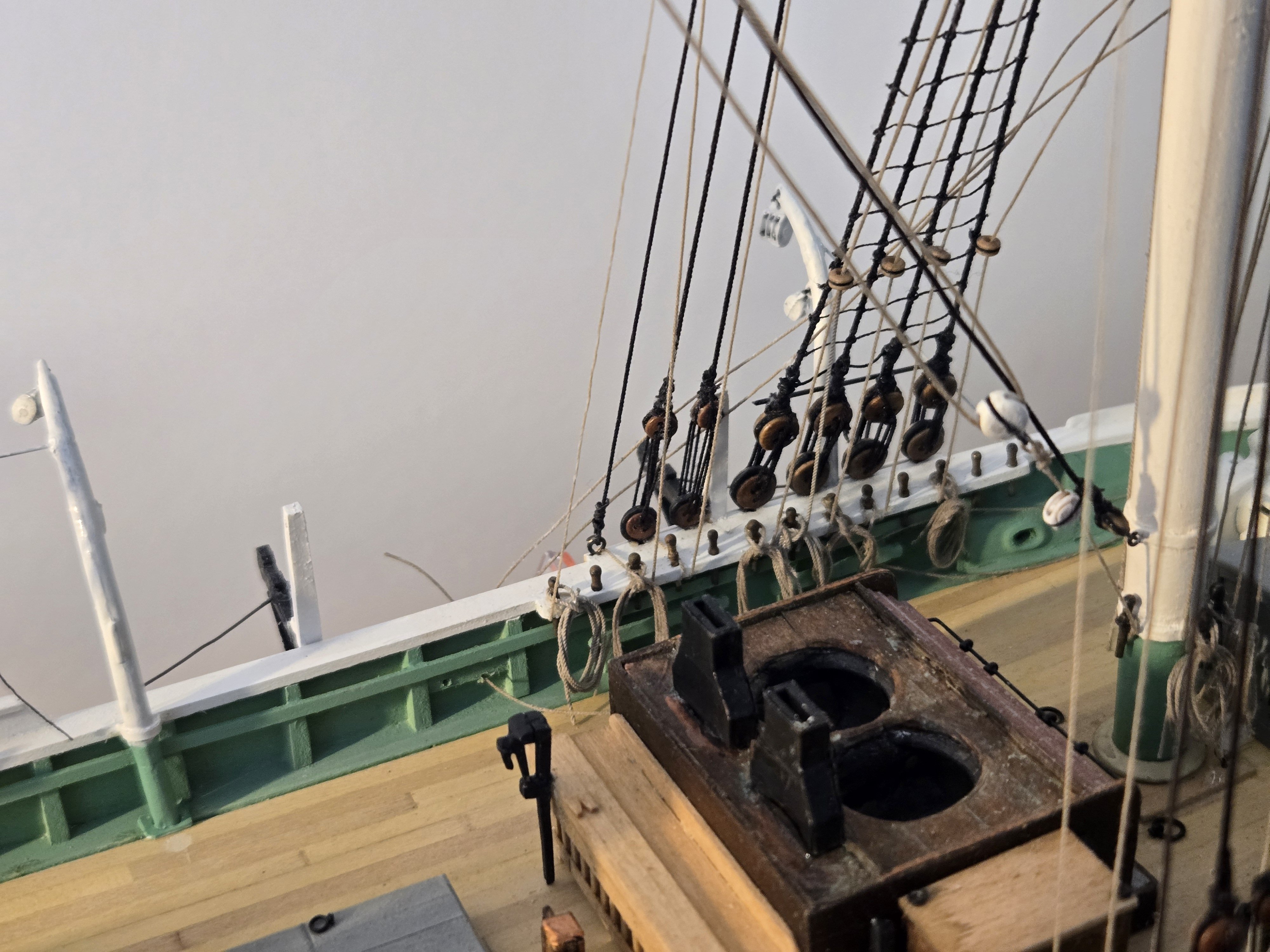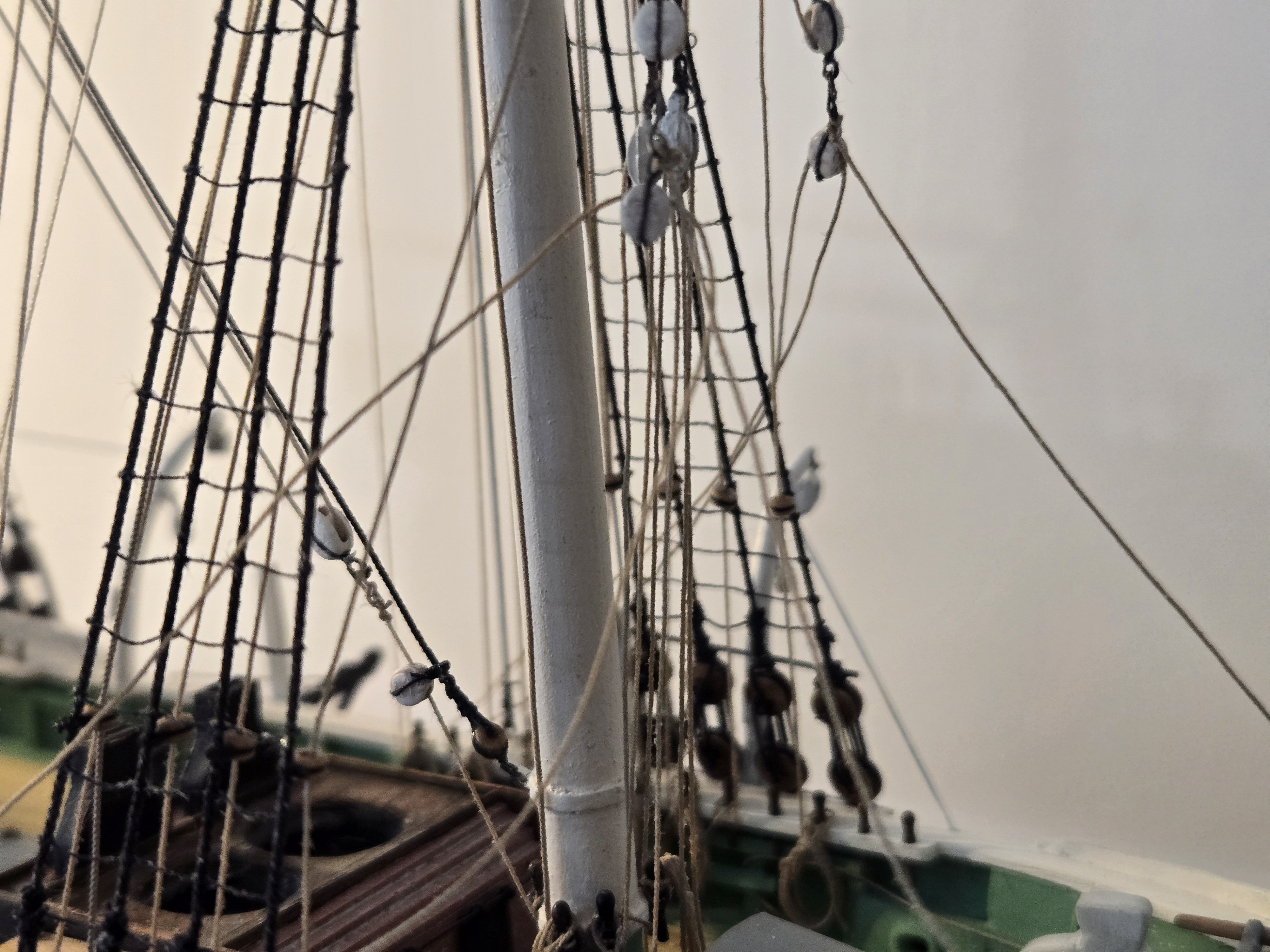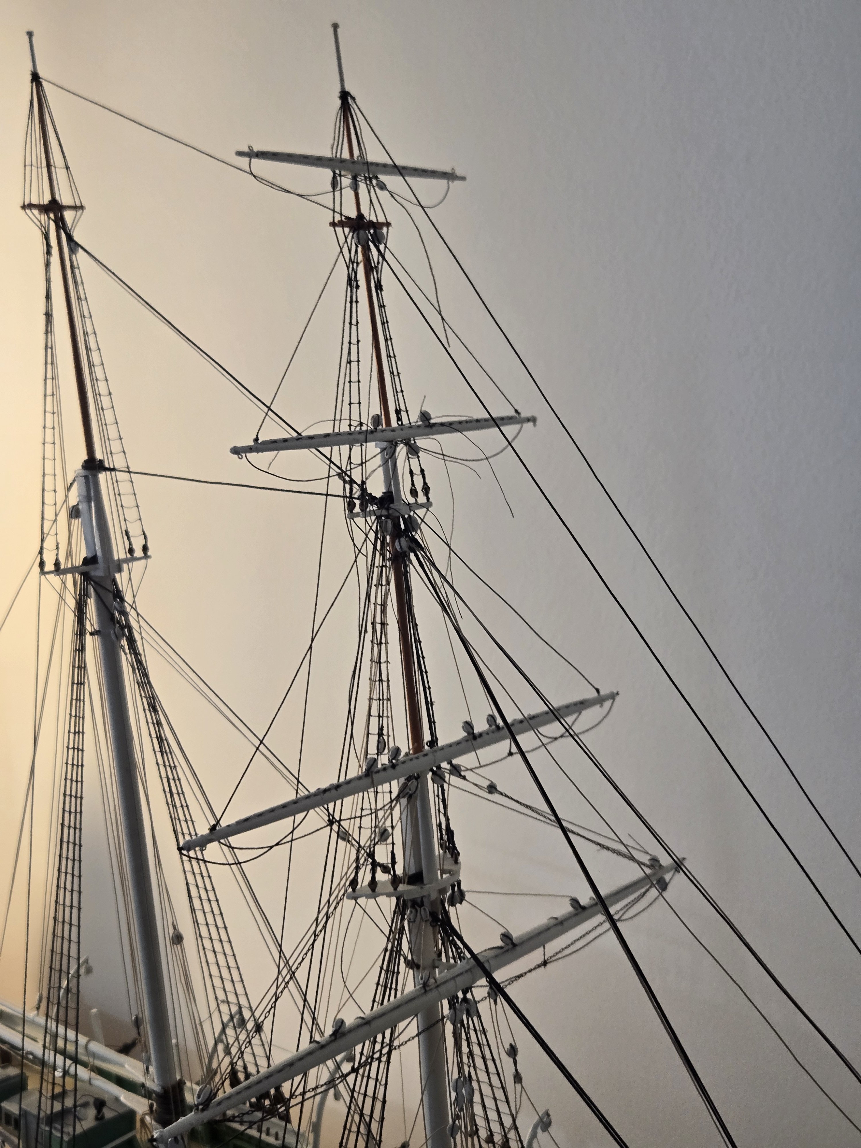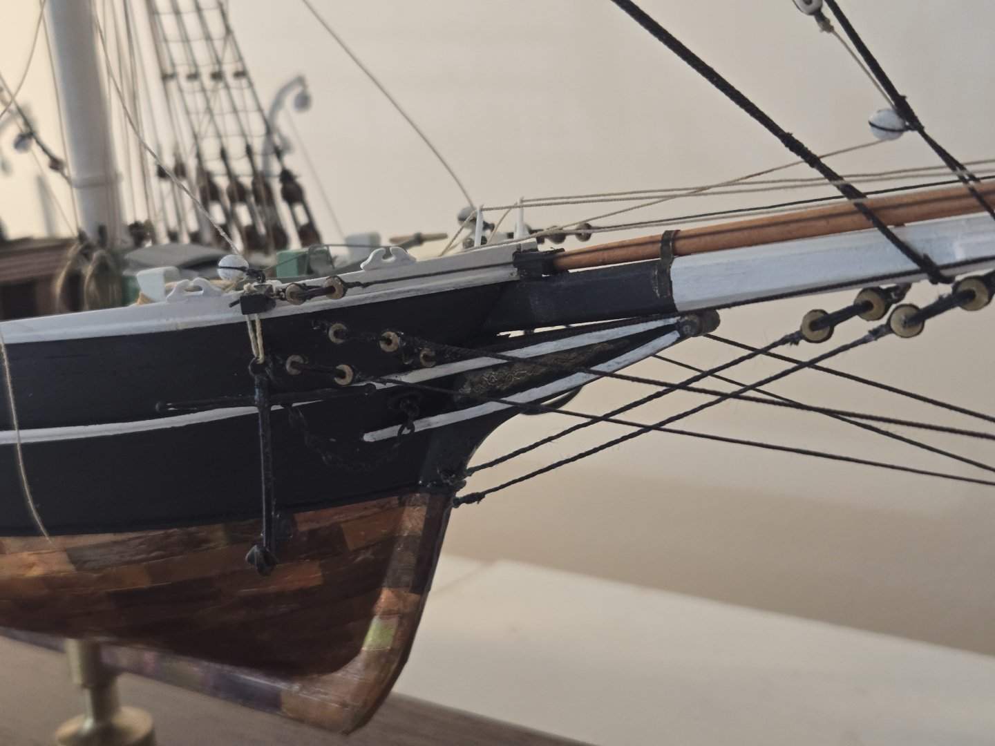 Finishing the standing rigging, next step is the ratlines! Not one of my favorite steps. Decided to stage the whaleboats and am really pleased with the alignment. I've decided to add them last, thinking it would be easier to finish the running rigging without working around them. At this stage I plan on methodically going over the build and doing any touchup and cleaning before the ratlines. Fortunately, I already had finished the yards and boom. So, running rigging should move quickly. Will also start working on the display case. I love this build!!!!!!