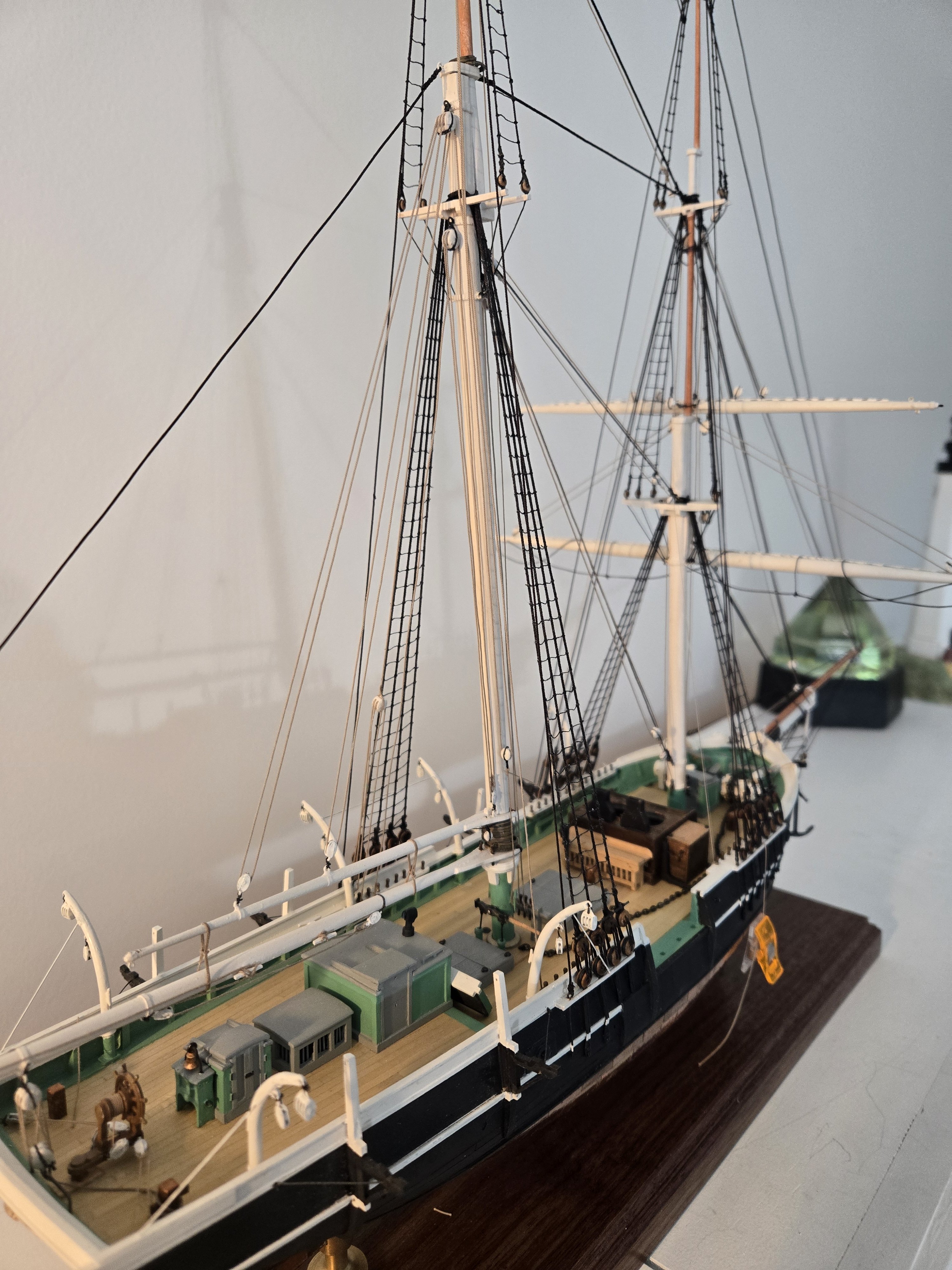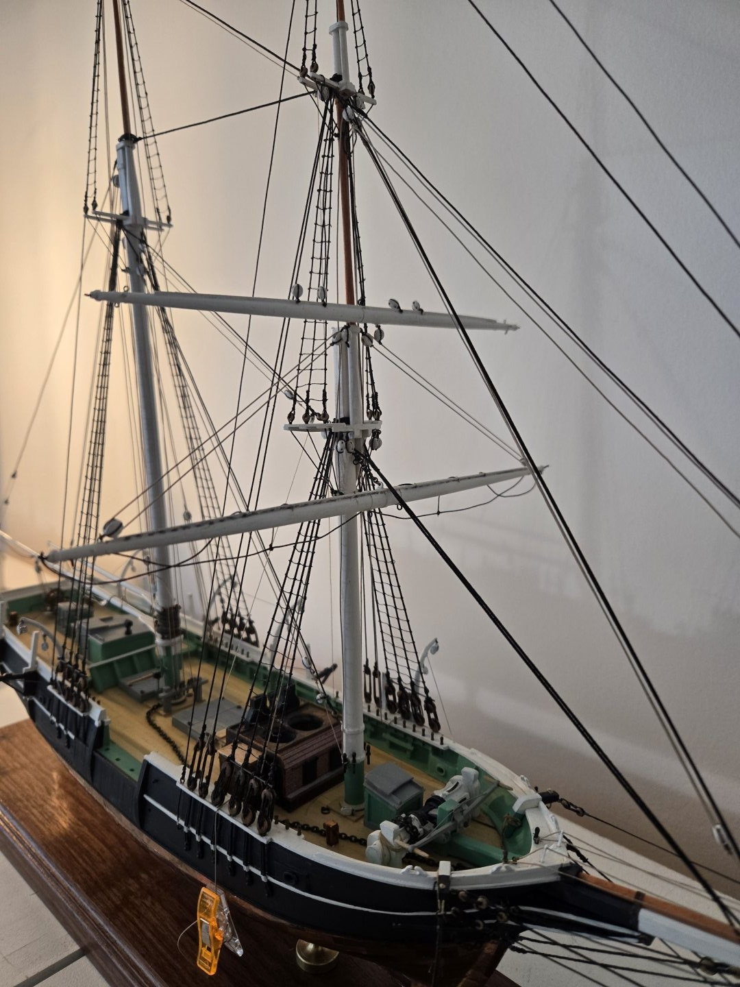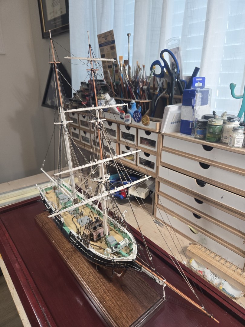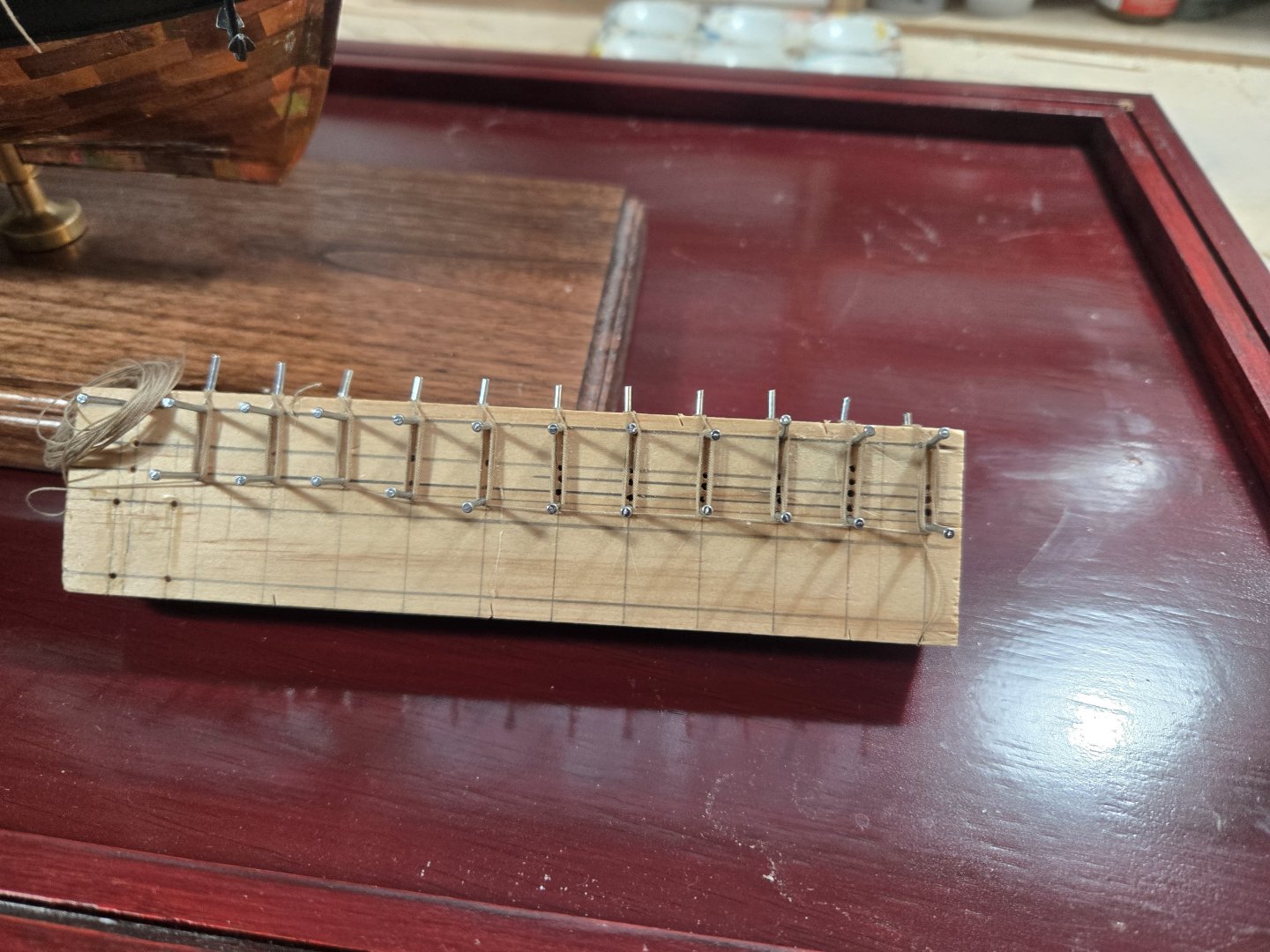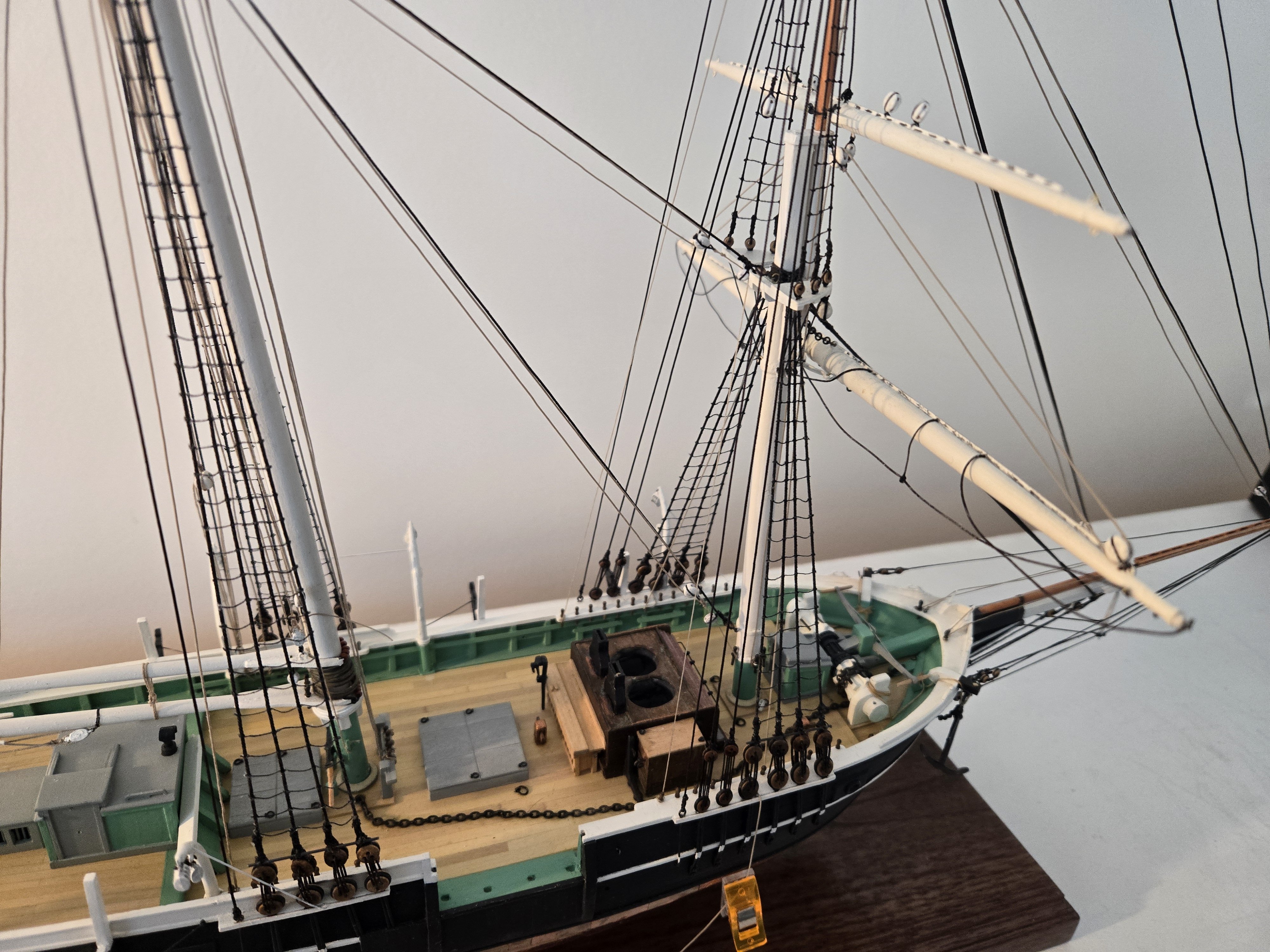 Finishing the standing rigging, next step is the ratlines! Not one of my favorite steps. Decided to stage the whaleboats and am really pleased with the alignment. I've decided to add them last, thinking it would be easier to finish the running rigging without working around them. At this stage I plan on methodically going over the build and doing any touchup and cleaning before the ratlines. Fortunately, I already had finished the yards and boom. So, running rigging should move quickly. Will also start working on the display case. I love this build!!!!!!