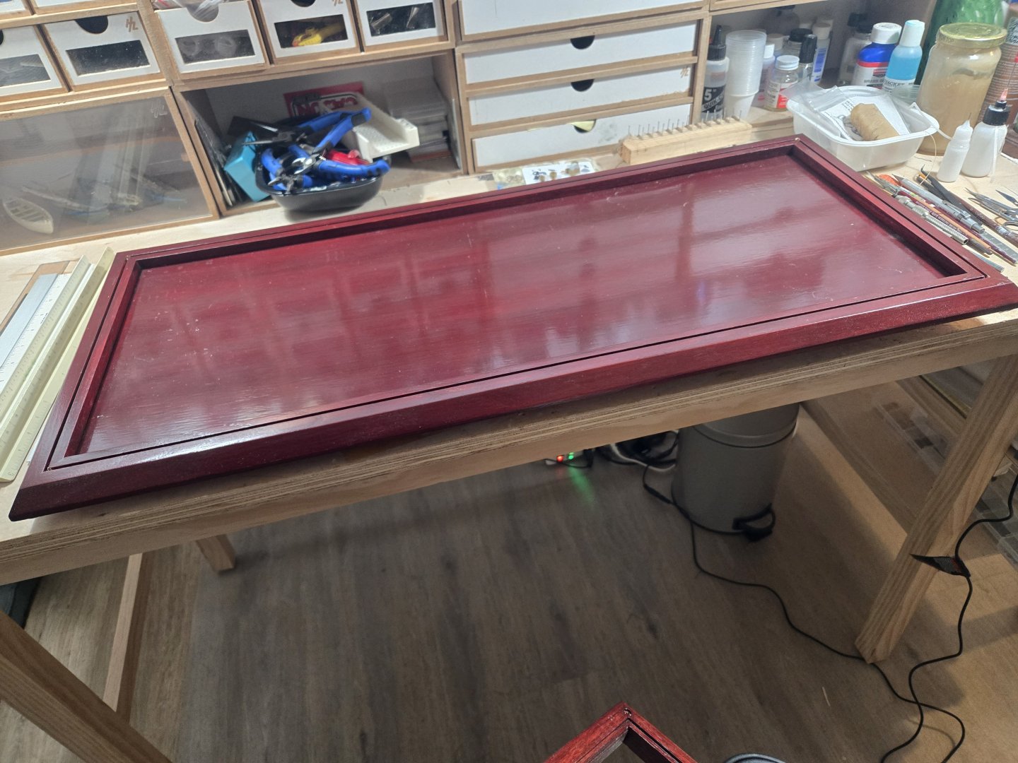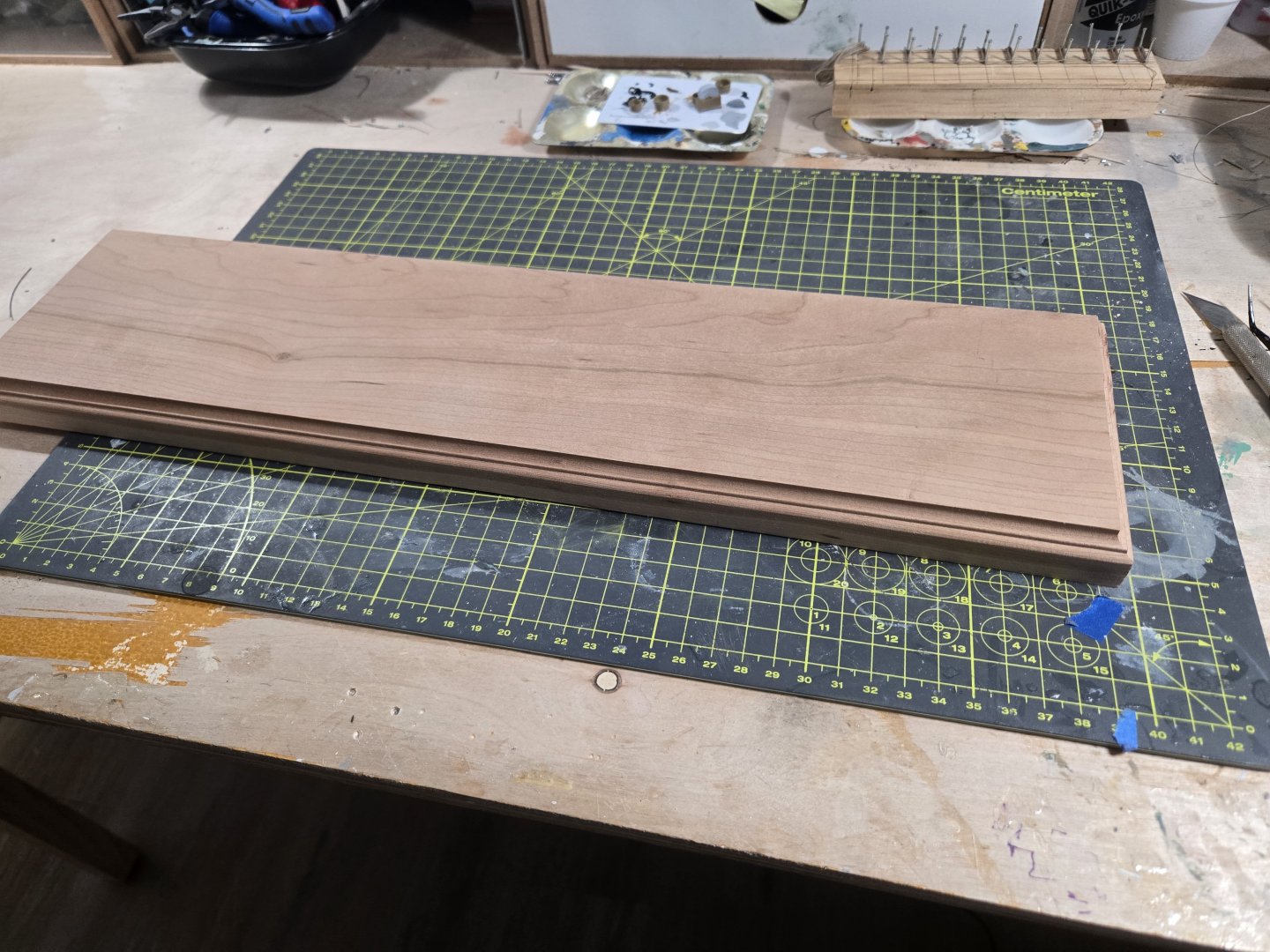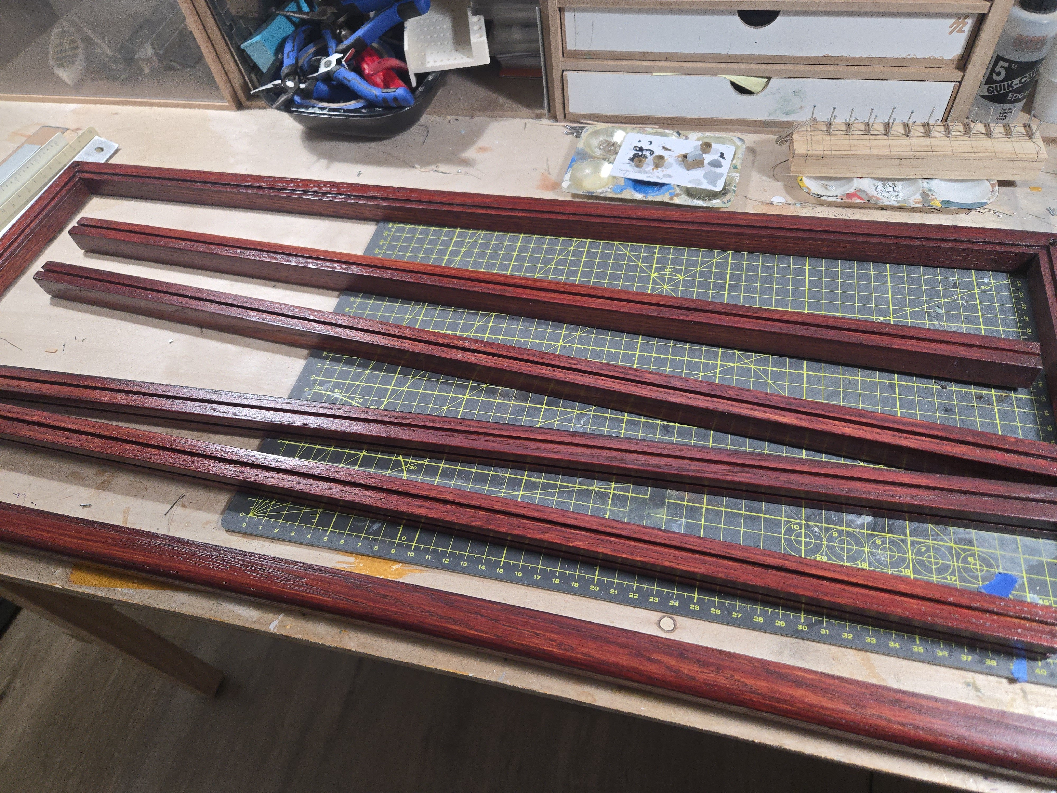 Added the Fore Royal Yard which completes the Fore Mast and finishing the rigging. I substituted 1/8" bullseyes for the fairlead blocks, instead of deadeyes, seized to the shrouds, found they were easier to work with. Without sails, not all the rigging is necessary but I'm adding as much as practical, looks better. One of the tougher rigging issues I had was adding the topsail sheet chain. First, finding the correct scale and one that works through the blocks. Consistent with the museum plans I've used a mix of iron stropped and wood blocks. For the sheet chain tackle I used 3/16" iron stopped. I'll also use these for the Yard braces. While I had some breaks waiting for glue to dry, worked on the hanks/rope coils using a jig I found on YouTube. After countless tries they seem to be looking like "hanks". The issue was finding a glue that works best. Found CA to be the worst, too stiff, not flexible enough. Settled on Elmers Clear, diluted. In the photo are a few I placed on the rail to check sizes. Still experimenting with different sizes. This is a relatively small-scale build 3/16", sometimes it's hard-to-get crisp detail. × Worked on the display case, just some finish work at this point. The original case I was building was made of Walnut but I wasn't happy with how it matched with the model (it will go better with my Skipjack). So made another out of select pine with Traditional Cherry finish. Now need to make a new base for the model to match the case. Regarding the Cutting Tackle, there are a couple of options. A document Richvee sent me, by Erik Ronnberg Jr. noted "Cutting tackles were customarily stowed down until whales were taken, although the tackle pendants were usually rigged aloft early in the voyage and seized to the main shrouds, starboard side, until needed". You could also rig the Cutting Tackle as noted in the kit plans. At this point I'm inclined to stow the cutting tackle on deck. Ratlines. While reviewing the document by Ronnberg, Rigging Specifications and Color Scheme, I noted a ratline variation not included in the kit plans. As an alternative to ratlines crossing all four shrouds, only the forward three need to be crossed, with every sixth ratline extending aft to the fourth shroud. This applies to the main mast as well. As crazy as it sounds, I may change over to this variation if it doesn't require much effort.