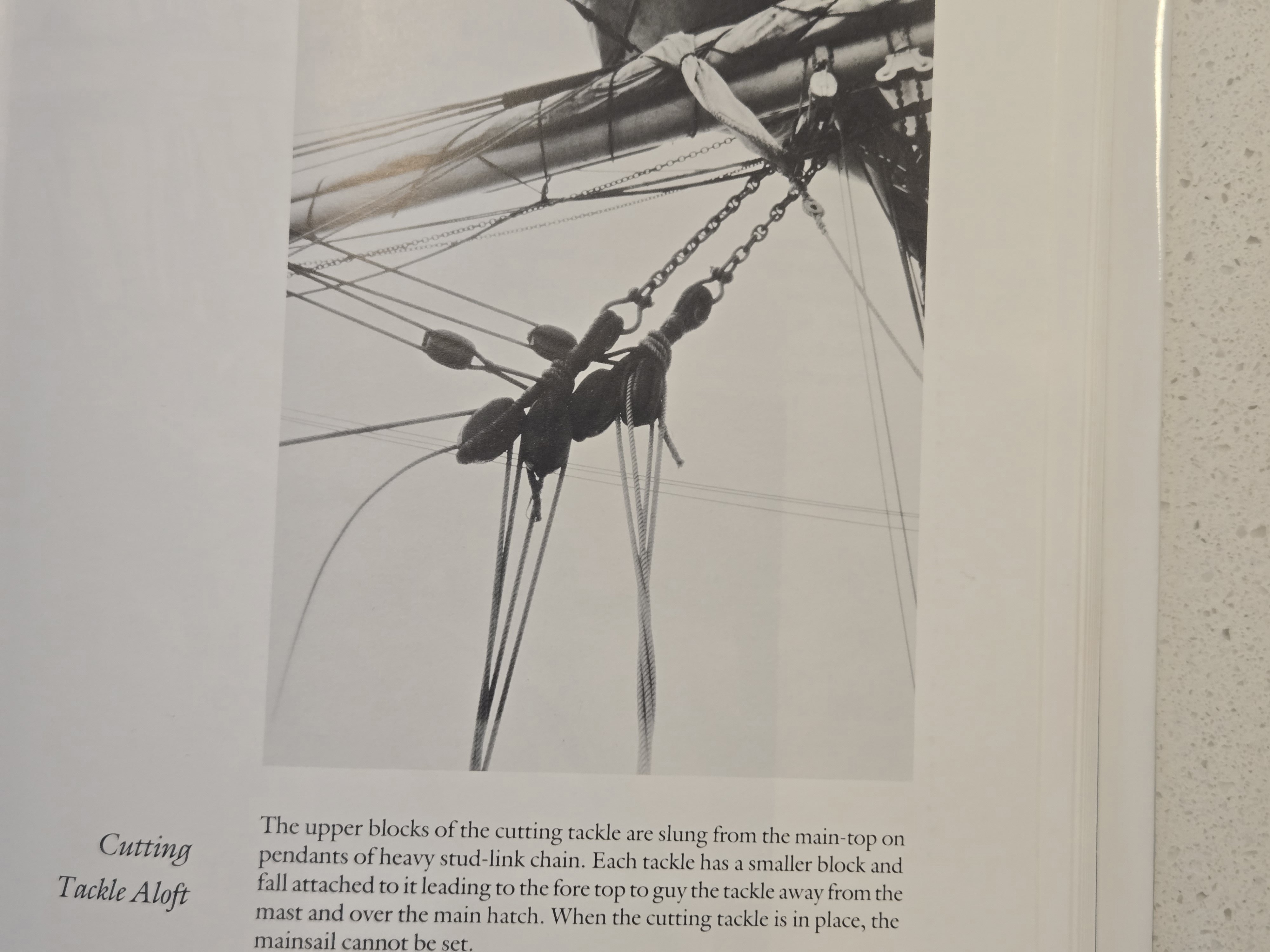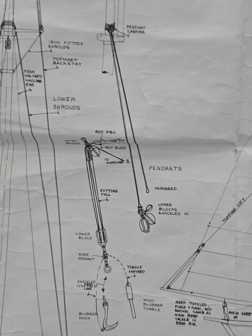 I've finished approximately 95% of the rigging and need to resolve the Cutting Tackle before mounting the whaleboats. Rigging the Cutting Tackle aloft doesn't seem practical. Regardless, I can't find any documentation on how it attaches to the windless! So, the easiest solution is to stow it on deck. Other than what is noted in the kit plans I found some other reference material which I feel should be enough for me to piece together something reasonably accurate. If anyone has any other info to share, it would be appreciated.