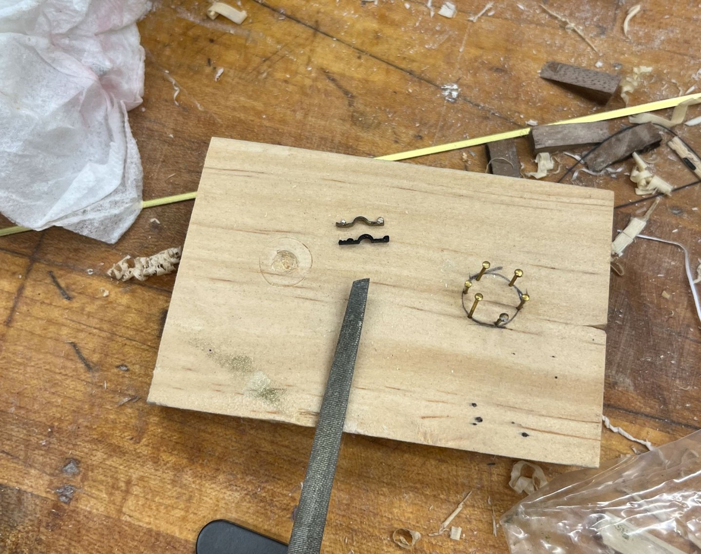 Good Evening MSW. Here in Delaware the weather has turned sweatpants and long sleeve plaid. First off I attended the last, or possibly the last so far until Chuck takes it over, Admiralty Workshops, held in beautiful Niagara on the Lake. This is a touristy town on the southern great lakes about 1 hr north of Niagara Falls. We were there off-season so it was quiet and not crowded. I flew but in hindsight should have driven. Stupid job time constraints getting in the way of my ship modeling. I landed in Toronto which was fine, got my rental car, and headed to the Art Gallery of Ontario which is about 20 minutes away with no traffic, haha. Parking was a struggle; eventually I used one of the kiosks on the side of the street and got the 3 hrs max which turned out to be plenty. If I was towing my family and kids probably not though. The floor I wanted was the Thomson Collection, a donated ship collection . All the exhibits are in flowing glass display cases. There are a lot of ships here, about half more modern metal ones, a quarter bone ships, and a quarter 17th-18th century. I always feel its a worthwhile trip if one thing speaks to you; here I really really liked the 24 gun navy board style Nightingale, 1:48. One i could see (someday far in the future) attempting to build. The Surly was there, I believe a close cousin to Cheerful. The rest of the museum is devoted to non-ship objects. The first floor has an incredible section of carved ivory and 17-18th century carved miniature wooden objects that defy belief. Many are carved on the inside; ie hollowed out balls with a level of detail and miniature-ism I would not have thought humanly possible. So don't go to this museum if you are a carver; you will leave depressed. The workshop itself was 2 days of comradery and socializing with fellow inmates. Chuck provided laser cut sections of futtocks that we glued together, then faired. One side was admiralty-style, the other side natural. Below is 2 of my sections being glued up; the final section had 4 "ribs." Here's a view during my 10:30am coffee break. Thank you Toni for letting me repeatedly borrow your scalpel. On the second day David gave some presentations on techniques. I had asked Chuck about how he formed the tiny hooks and eyebolts and rings on the Battlestation and this led to a demo. Chuck conveniently brought his Speedwell model and each time I look at it I see something new and challenging to replicate I missed the last time. Here's the cannons: David made some super-tiny rings from brass wire that I needed glasses to even see. I realized some purchases were in order. Clearly if I used the same tools as David I would magically achieve the same skill level. Here's what I wanted to do - make hooks that were proportional to the blocks Chuck supplied with the kit. To me the hooks look smaller than the blocks; ludicrously tiny. The pictures are deceptively magnified and I had spent some quality time before the workshop happily making giant-sized hooks. Once I got my new tools things were better. Purchases were: 1) teborg 46.9590 round nose pliers 5-1/2" long. Tips are a hair bigger than 1/64" diameter. My old set the tips were 3/64". 2) parallel jaw pliers, from Amazon. Very helpful squeezing rings shut and making bent wire flat. Generic made-in-pakistan. 3) Lindstrom flush cutting cutters #8147. My old ones were not flush and left a "beak" on all the wires I cut Below are my attempts to make hooks, left to right. I had tried my original round nosed pliers; huge hooks, then wrapping the wire around progressively smaller drill shafts which was very awkward and still were too big. With the new pliers I finally got a hook smaller than the block; Huzzay! I also ordered some smaller brass wire, 28 and 30g, which Chuck said will make it easier to form small parts. And thats where things stand tonight. Now I need to re-make my giant eyebolts and rings to a proper smaller dimension and then finally on to rigging the cannon. Thanks for reading Cisco