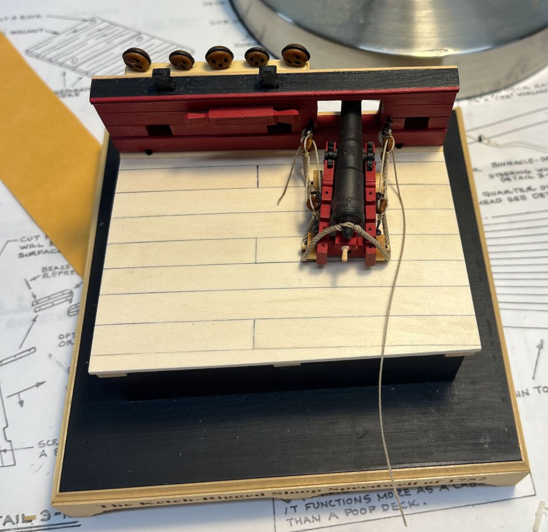 Last I posted was October. Playing catch-up today. I have been working on the cannon and associated rigging. All the first time for me. Here's the various brass bits that I thoroughly messed up blackening on and had to resort to paint. I used 24 and 28g brass wire. Rings were soldered which in hindsight was unnecessary. 9 A first effort attaching block to Syren rope. I haven't seized them yet in the below pic but I did them as per Chuck's instructions using med viscosity superglue. Jason (JLong) said they looked acceptable so good deal. I worked on the carriage and quoin as well; here is my attempt at the handle done in a dremel with needle files. Worked fine. Its easy to get the handle not in scale; I kept having to make it smaller. I also made the breech rope seizings. I couldn't make it work without the Extra Hands. I found it cumbersome to try and glue in the breech rope anchors while the cannon was attached to the carriage. So I tried it without the carriage. Definitely easier. And thats where it all stands. I should be better about posting now that the holidays are over. thanks for reading Cisco