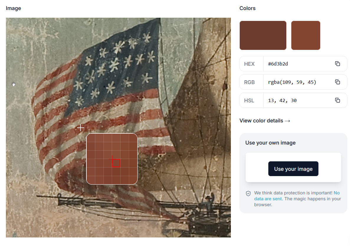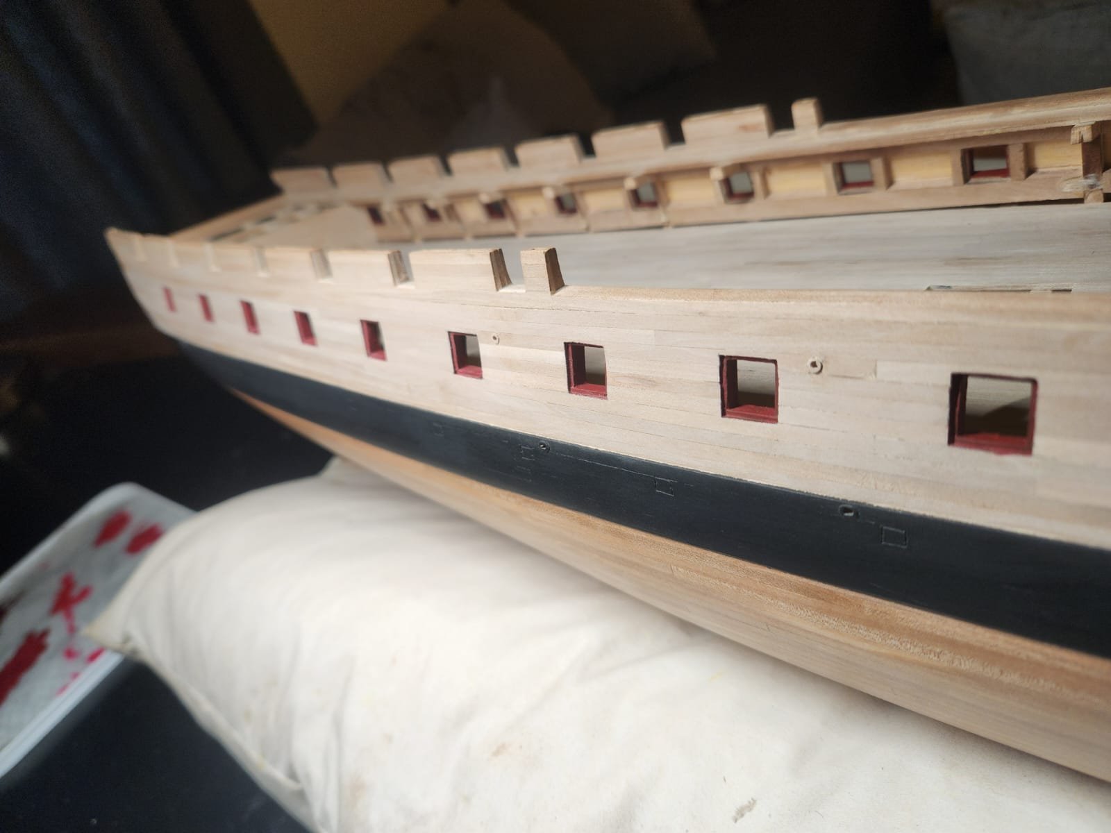 Hello everyone. Largely due to a very busy week, I didn't do a whole lot on Constitution except for some repairs to the gun deck(lessons learned will be shared in my spar deck post if I ever get there), a bit of tinkering on a stand to replace the pillow I'm currently using and a bit of research and execution on gun port painting. This was not the world's most complex process but it was a fairly agonising decision to make. Various rips records refer to "red" paint being part of the ship's supplies as mentioned in "Close up": Aug 1803 -- Paint pigments in ship's stores included 305# black, 3 cwt white lead, 3 cwt yellow, 50# green ("verdigris"), and 28# red ("vermilion"). [Receipt for John Osborn, 1 Aug 1803, Samuel Brown Papers, MHS.] 11 Jan 1804 -- Received 15 kegs of yellow ochre, 2 of red paint, 7 small ones of black paint, and 50 gallons of black varnish. [Ship's log, DNA.] This obviously does not tell us anything at all about where the paint was used or infact what exactly was meant by "red" It is fairly safe to assume that the colour that they are referring to is red ochre, a shade of red with a fair amount of brown in it. Below is an example of a building restored to its appearance at the time of the constitution launch showing just one of many shades of red ochre. This leaves us with 4 paintings by Roux and Corne to find evidence for the colour we need. My approach began by selecting a portion of each painting where the colour of the gun port lining can be seen and putting it into an online colour analysis. The smaller square of colour in the upper right corner indicates what the actual colour of the specific selected pixel is:(I realise the many flaws in this method but it gives us an indication....all rather brown After some discussion with good old Marcus we agreed that the colour shown on the painting may be wrong for 2 reasons. Firstly, the artist wished for the viewer to experience a certain colour, depending on lighting etc that may require use of a brown to show a reddish colour. In addition and arguably more importantly we don't know how paint colours deteriorated over the 200 odd years since these were painted. That then led me to the next step of the investigation: to pull the colour from the American flags which would all have been a fairly standardised bright red colour as can be seen in this example which flew on the Constitution around 1816 This resulted in surprisingly brown colour samples for something which is known to be red: This colour deterioration clearly showed that the colour of the gun port lining was meant to be closer to red than brown. The next logical step was to feed AI all the data I had from all the paintings and tell ChatGPT to do a colour correction for the gun ports based on the known colour deterioration of the flag. The result was surprisingly pleasing. Without any other prompting it gave me one value, HEX #A3050F: This seemed like the perfect balance between a modern and historical red. The application of this chosen colour was achieved as follows: 1. masked off the hull completely and applied a spray-painted layer of rustoleum matt black primer 2. Applied a thin coat of Vallejo "Red"(70.926) with a tiny tiny amount of Vallejo "Black"(70.950 and a drop of Vallejo "Cavalry brown"(70.982) with a single drop of paint retarder. Exact ratios are hard to describe but it's mostly red, a smidgen of black and a drop of brown) 3. I then applied another thin coat over this of "Red" with a small drop of Vallejo "Carmine Red"(70.908) 4. I finally finished this with a drybrushing of pure "carmine red to highlight the edges and to give the ports a bit more of a natural look. This recipe is by no means perfect but it worked for me. Now unless anyone has a warning of some sort for me I believe my next step is to begin the Quarter Galleries. Have a great evening Cheers Haiko
