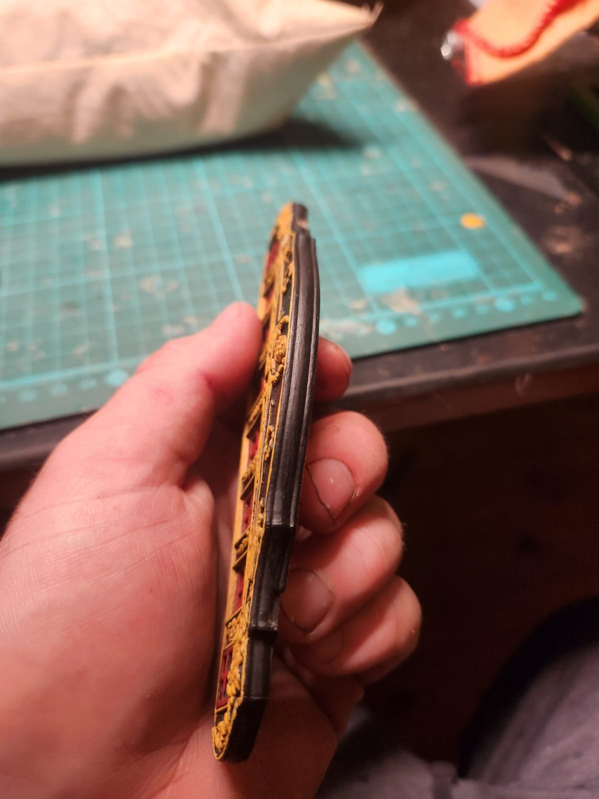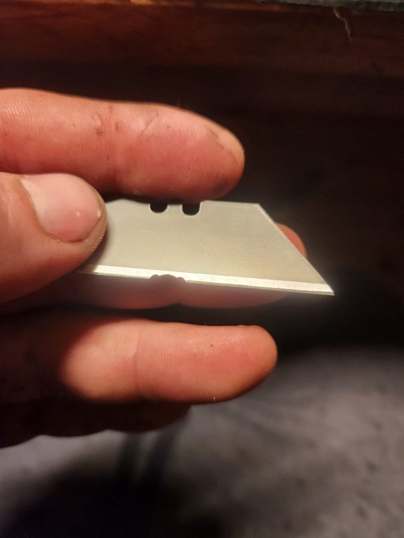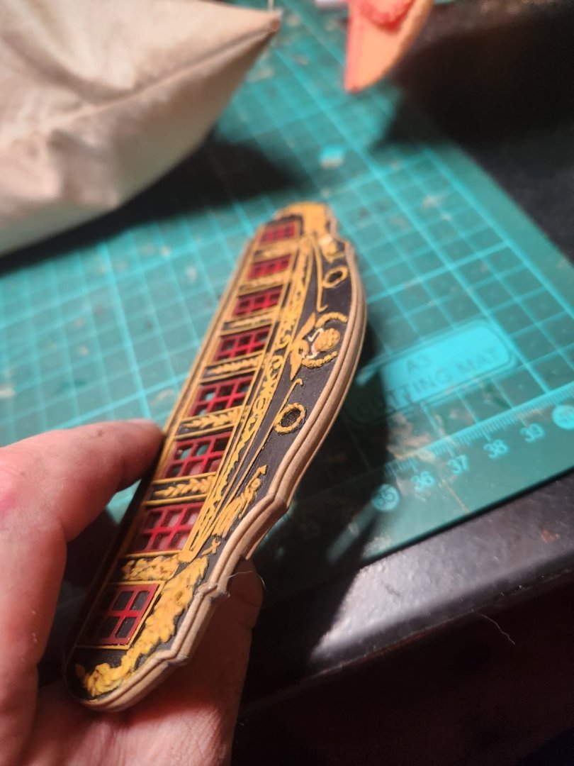 Just a quick one this evening, we are in the middle of our harvest and everything is insisting on breaking leaving very little time for the hobby. After living in denial for some time I realised that I would have to after all do some form of moulding on the transom(If this is the incorrect term please correct me). The only specific evidence for this which I can find is in the close up photo taken of the Isaac Hull Model by @Force9(thank you for these great photos they have been a huge help) here we can see some moulding around the Quarter gallery portions. Unfortunately the stern was closed in the 1812 configuration so there is no example of how the upper transom would have looked but I decided this was good enough for me to try and copy. As I am writing this I am beginning to wonder if this was a mistake but that ship has sailed...if you will To get this result I filed a profile into a sacrificial box cutter blade: After a trial or two to determine a suitable profile I cut this into the transom and went over it with some steel wool to smooth things out And painted it black as well as touching up the ochre.(The notches are to allow a tight fit under the bulkheads when pressed into place) Thats it for tonight...Tomorrow(hopefully) painting gun ports! Cheers Haiko