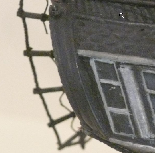 Stern Ports. The stern ports on the model are pretty simple. They appear in may contemporary paintings but interestingly do not appear on the 1812 Isaac Hull model. Here we can see them clearly in the Corne Tripoli bombardment painting. For exact placement I chose to use the design offered up by David steel for a frigate of this size. It seemed to be the best and most accurate way to position them on the stern. There is also a photo from the 1870s(I believe) which shows them, and here we can see that the sizing seems to be fairly close to the sizing shown in steel: To show the ports I just parked them in pencil and then etched their outline with a chisel and placed 2 shortened hinges left over from my Pegasus build on each hatch. At this point I stopped to do some painting and oiling but the final result was achieved after painting by drilling a hole for the retraction rope to come from and a hole for its anchor point to go into. I used 0.2mm rope and reduced the size of the eye bolt given with the kit to get the desired scale. not perfect but this is quite out the way so I can accept the result. Next up coating. Cheers Haiko