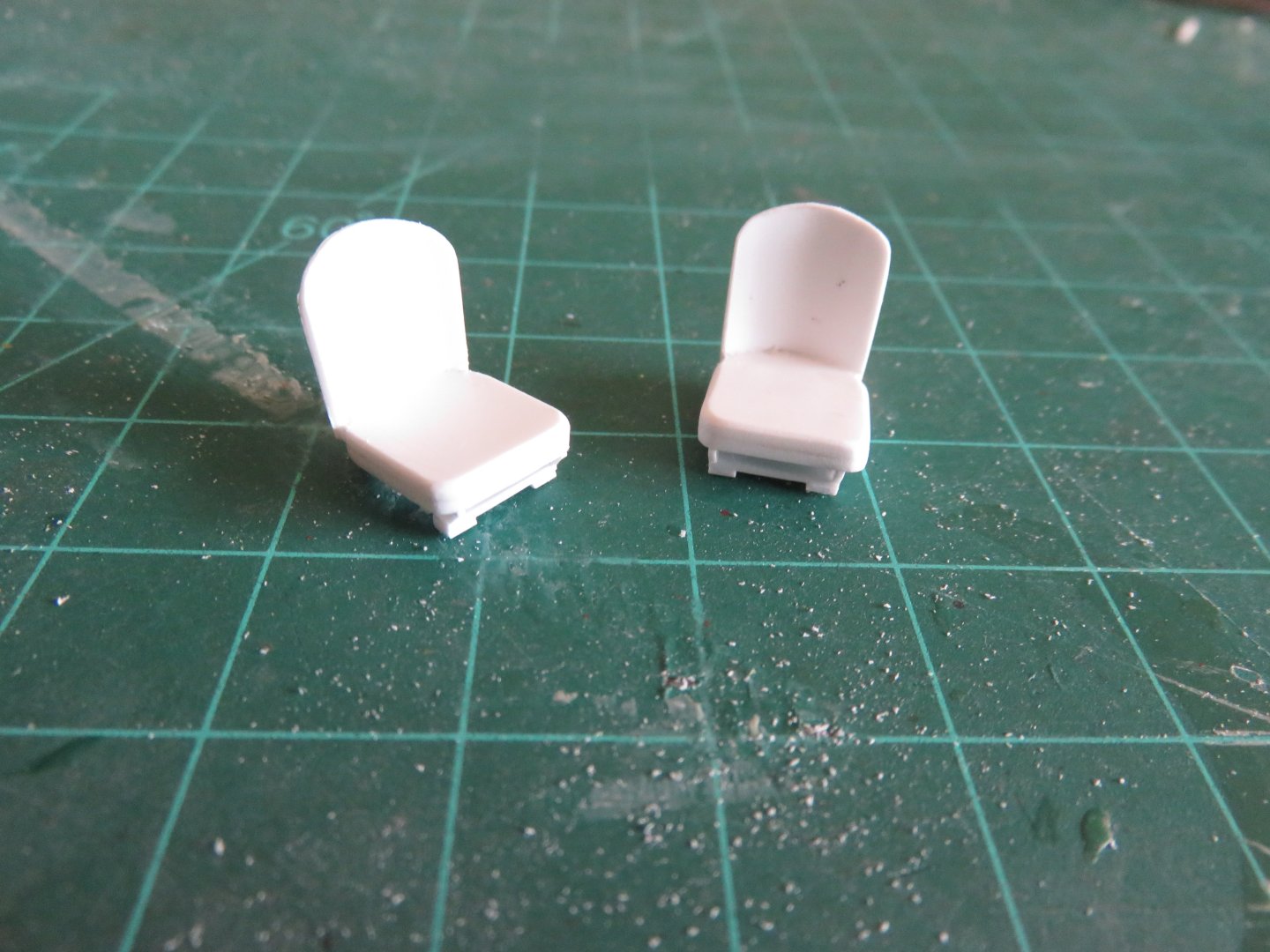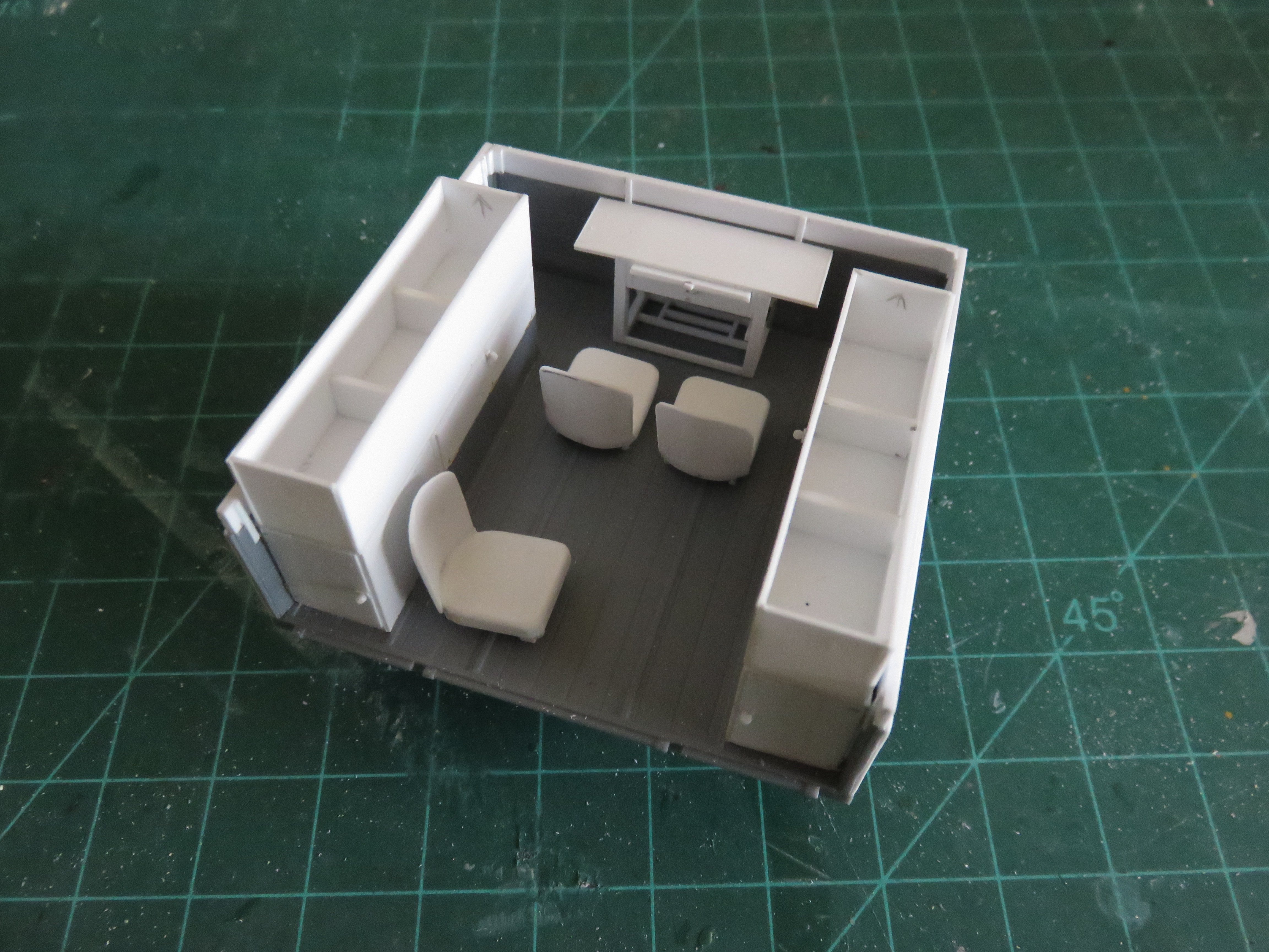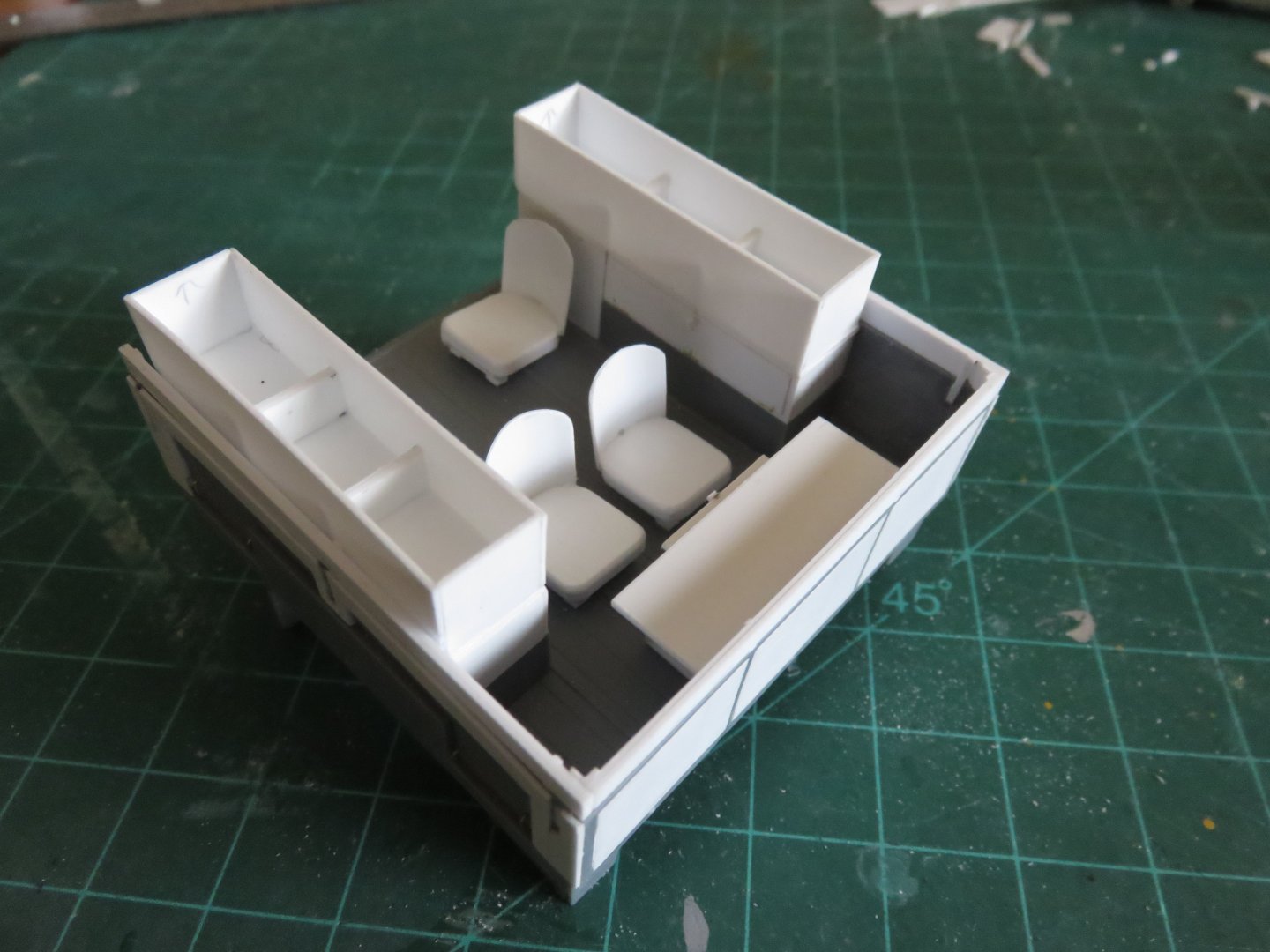 Thanks for the "likes" everyone! Some more progress to report. I've spent some time this weekend building seats. I ended up using the kit supplied cab seats as templates for the seat and backrest. They are somewhat simplified from the prototype, but they'll work for my purposes. I used two layers of 0.040" styrene sheet for the seat, and one of 0.020" styrene sheet for the back rest. The curve was imparted manually, but after gluing to the seat, the backrests seem to be holding their shape. The bases were constructed using various bits of 0.020" styrene strip, with extra height built into the forwards edge to give the seats a realistic backwards lean. Starting to get crowded in there! On the prototype, the seats could stow flat by folding the backrest down, but I'm not that ambitious! I've also had to add some bracing to the stowage bins, as the sides demonstrated a proclivity to bow inwards. I plan on putting a "canvas" cover over the bins, so the insides will not be noticeable when I'm finished. Aside from a few small details, the only major component left to add is the radio set. I've found a decent looking resin kit online, so I will be ordering that soon, along with what I hope will be the necessary decals. Andy