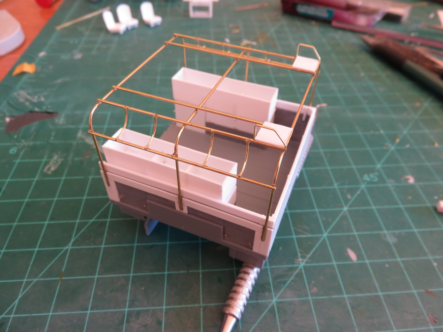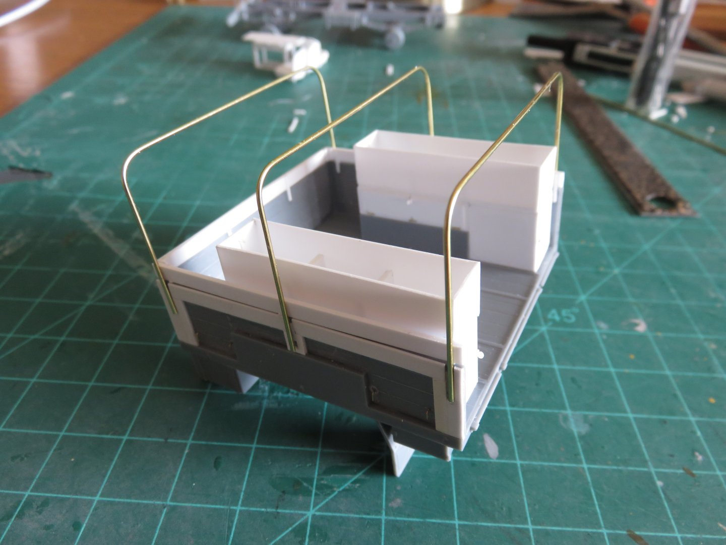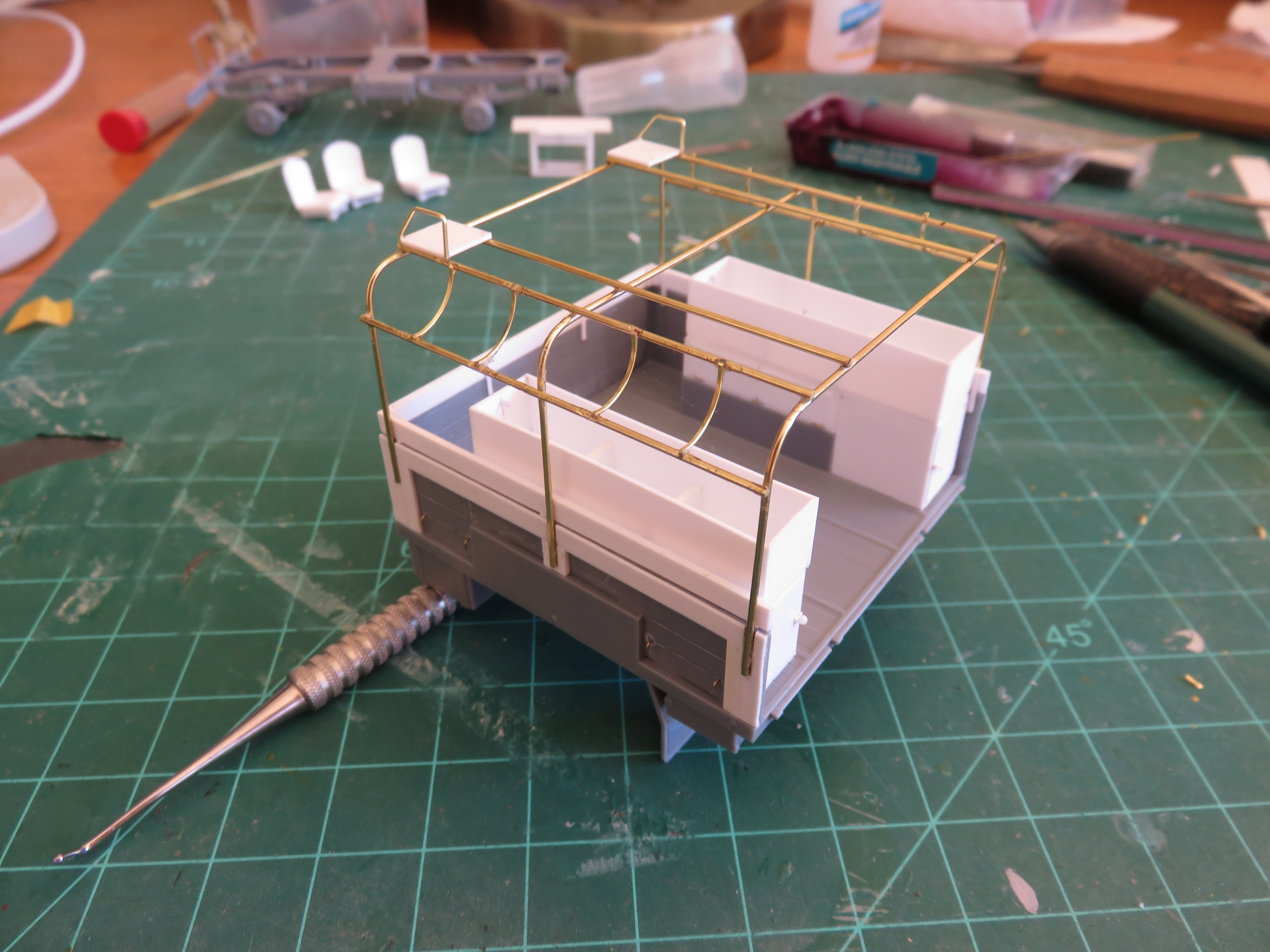 Thanks for the continued "likes"! A small midweek update on where I'm going with this project next! The postal service has resumed so perhaps a spare part from Poland will arrive sometime before the end of the year (fingers crossed). In the mean time work goes on where it can. I have ordered a radio set and decals, and while I await their arrival, I have begun work on the canvas tilt. The kit supplies some very fine plastic bows for the tilt support. I think they attempted to make them scale thickness, so they look and feel quite fragile. They also have a slightly incorrect shape. The top run of the kit applied bows has a very gentle arch to it. Looking at prototype photos, the top should be flat. There are also additional cross pieces and brackets to support the aerials and other paraphernalia. I thought this was a good opportunity to beef things up a bit, so I have mande replacement bows out of some 0.020" brass wire. Once the cross pieces are added (also out of 0.020" brass wire), I should have a solid structure, secure from any accidental rough handling. Wish me luck! Andy