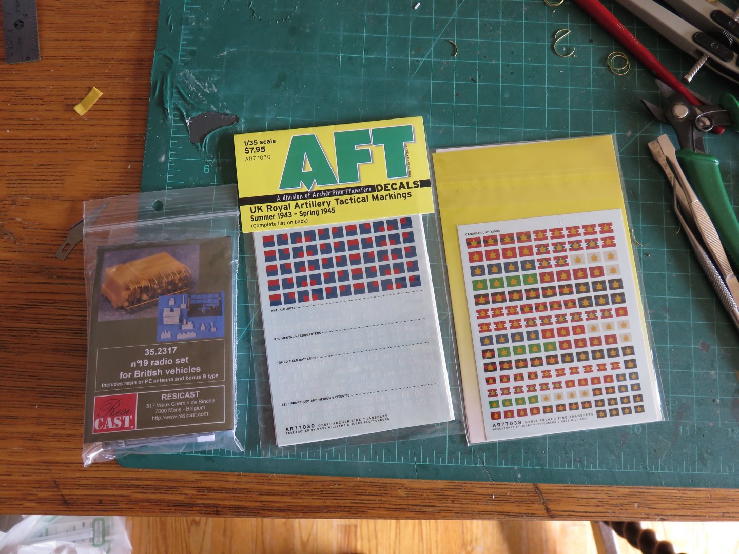 Well, the postman was on the job this week! Hooray! Some goodies arrived at lunchtime. Still waiting on the replacement part, that might still be another week or two. A nice resin No 19 Radio set from Resicast. I opted for this version as although I've heard the offering from PanzerArt is slightly better, the Resicast one includes all the various aerials that I need, as well as a headset and microphone too! The decals are by Archer, printed by Cartograph, so no trouble to be expected in that department. In the mean time, work has continued on with the bows and battens for the tilt. All told, there are six battens, three on each side. This was to accommodate additional support for the aforementioned aerials. For those eagle eyed viewers, that may notice, I have also added little brass wire securing points for the bottom of the canvas tilt. These were made out of 0.012" brass wire. Before I add the third batten (whose spacing will be determined by the size of the aerial base, which I have to make yet, but now that I have the aerials, I can guesstimate the proper size base plate), I have begun to add a series of hanging bracket which spanned the lower two battens. These were made from some flat bass strip, that was then wrapped around a suitable mandrel (in my case an appropriately sized mechanical pencil). The little springs were then cut into half circles which were in turn glued between the battens at the appropriate spacing. Once dry they were then trimmed to length. These brackets were used to hold extra aerial sections, although I'm sure other long pole like things could have conceivably been tossed up there for safe keeping if needed. As always, thanks again for the "likes"! I've still got a good amount of work to do before I have to tackle the cab, so it doesn't look like things will grind to a complete halt just yet! Andy