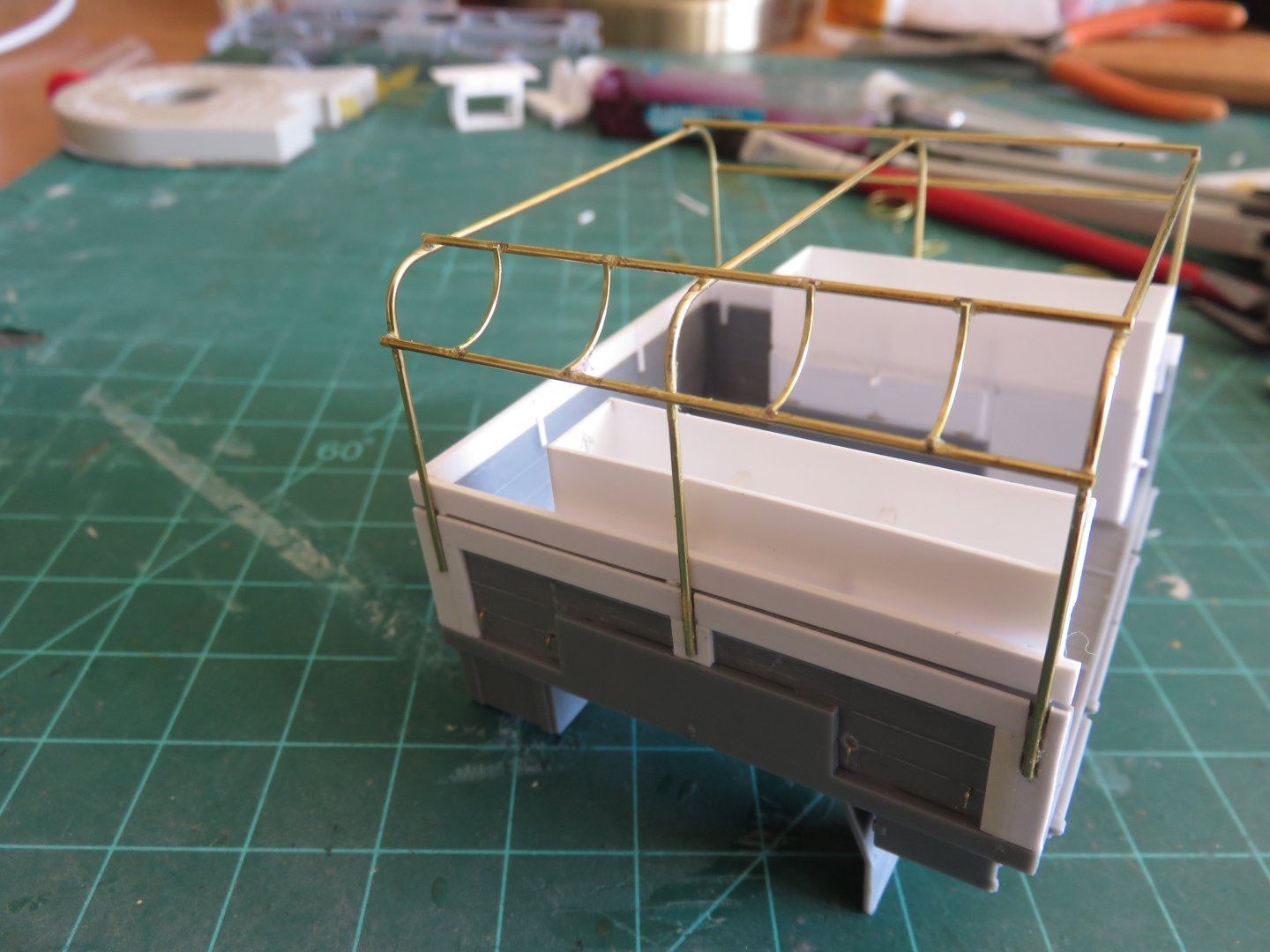 A little bit of weekend progress to report! I've managed to sort out most of the rear stowage lockers and bins for the cargo area. This required a little bit of estimation, seeing as my primary reference photos are grainy little thumbnail images, so while the measurements might not be perfectly spot on, it's close enough and resembles the prototype well enough. First up there are four storage lockers to be built. I used some 0.020" styrene sheet, reinforced with some 1/16" square stock for strength: The first two lockers were fairly easy to sue out, as they were mounted above the wheel wells, and from the looks of things, were just a hair shorter than the side sheets of the cargo bed. These had one long door, hinged on the bottom. Behind this was another set of lockers. These lockers had rear opening doors and were as tall as the wheel well lockers. It looks like they stopped just short of the tailgate. The hinges were located to the outside. In reality, all of the locker doors were recessed, but for the sake of visibility I made them stand a little bit proud. To simulate the hinges I used some short lengths of 0.015" brass wire. I will be adding the latches too, later on. After the lockers, I need to add the bed side extensions: These were made using laminated lengths of 0.020" x 0.125" styrene strip. Some 0.010" x 0.030" strip was used for the joining straps as well as a spacer between the "boards" and the bed sides. A short length of 1.5mm styrene angle was used to connect the from end and sides. Last to be added were two large bins that mount above the lockers. It took me a while to figure out how exactly they were built. Some careful study of the thumbnail photos and I realized they were open topped bins, with a canvas cover. I'm assuming they were to hold the radio batteries. These were also fabricated using 0.020" styrene sheet. Two more items remain to be built for the cargo bed. first on the front left corner there was a small panel that had some switches on it. I assume that was the control panel that connected the Johnson Chorehorse motor (on the left cab step), to the battery banks. Finally there is a table with a drawer upon which the No. 19 radio set was mounted. This sat at the forward end of the cargo bed. I think things might be improving with the postal service situation, so I may be able to order a resin radio and antenna set soon. Thanks for all the likes and kind comments! Andy