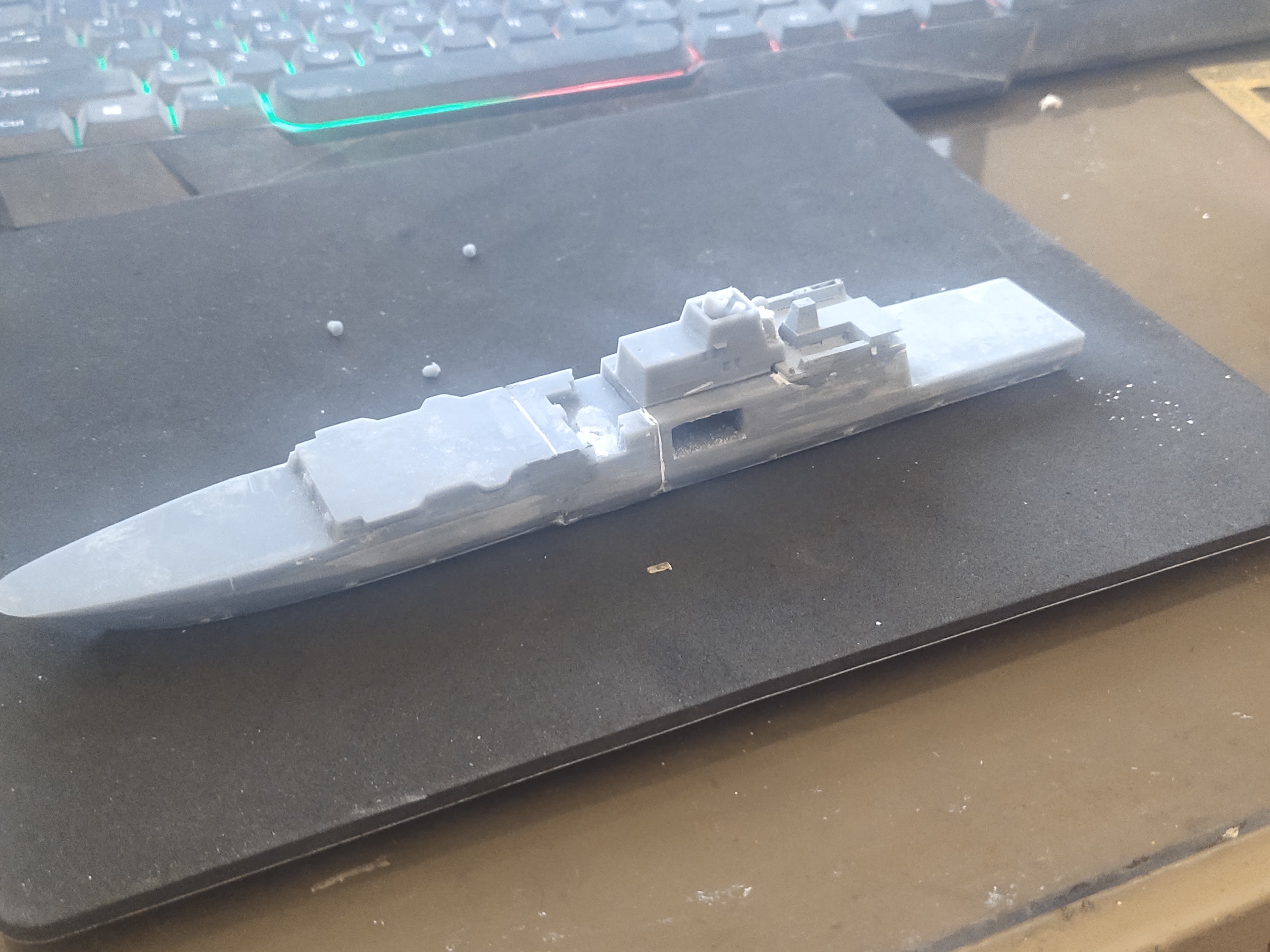 I had issues how to permanently straighten the hull. A wooden base was made, model was placed on the center and a small amount of resin was poured. It was left dry overnight. Hull sides were painted gray already. Looks like I have to cover the base before future painting. t Upon my first look at the model it was noticable how many PE pieces exists, comparing to the few resin ones. First trouble came when I start to make the missile launchers. Apart from the base the others are metal ones, a frame and the "skin", mini parts than must be folder in oval shaped and attached over the frame After struggling for 2 hours it was pretty obvious that there's not a chance I accomplish this task and even if I do result will be mediocre. So once again standars parts were used as a reference for size and I made my own launchers pack after 3 attempts. Then I only add the enchancing PEs. Since there was an option for the hatches to be left open, I made also a few missile heads. Finally the funnel was added with bit extra detailing according to pics I studied