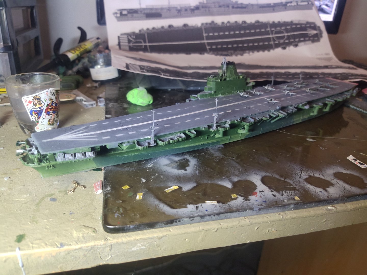 The model is made by 3 main pieces. The flight deck, the hangar area and the lower hull section. I start working on the gun platforms around the main deck. These should be all removed and replaced by correct ones. Unfortunately these are part of the hangar deck, so I had to cut them using a low rpm rotary cutter. Then sand a lot to remove the excess plastic. The fist piece installed was the bow platform set for the rocket launchers Looks like there is a lot of work to be done. I estimate this project to be done before Christmas.