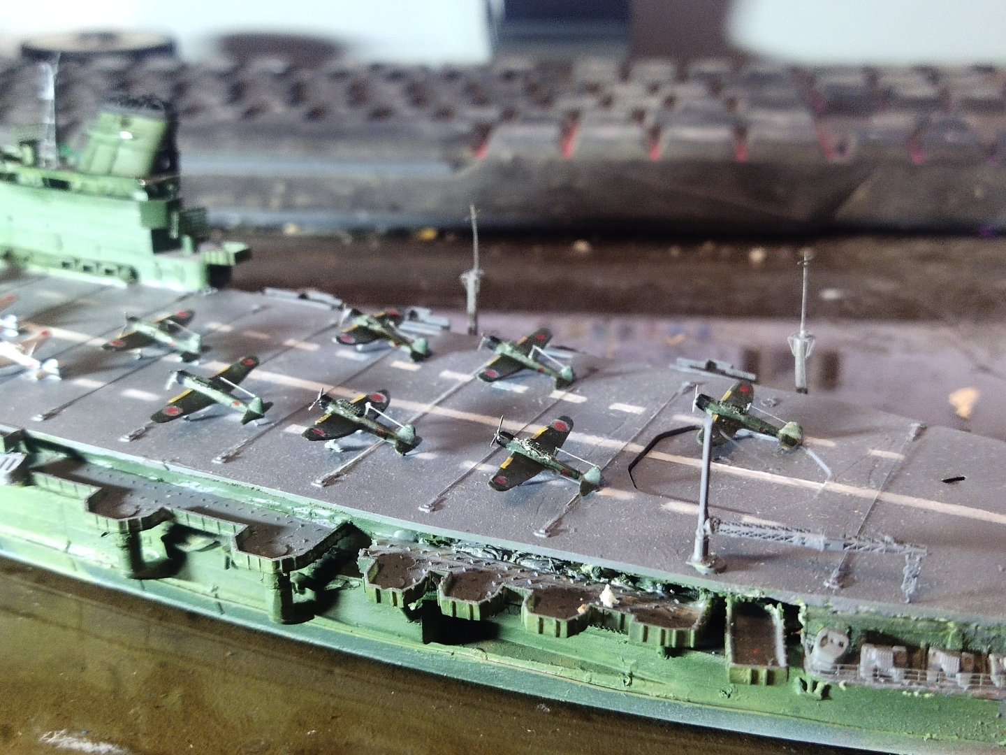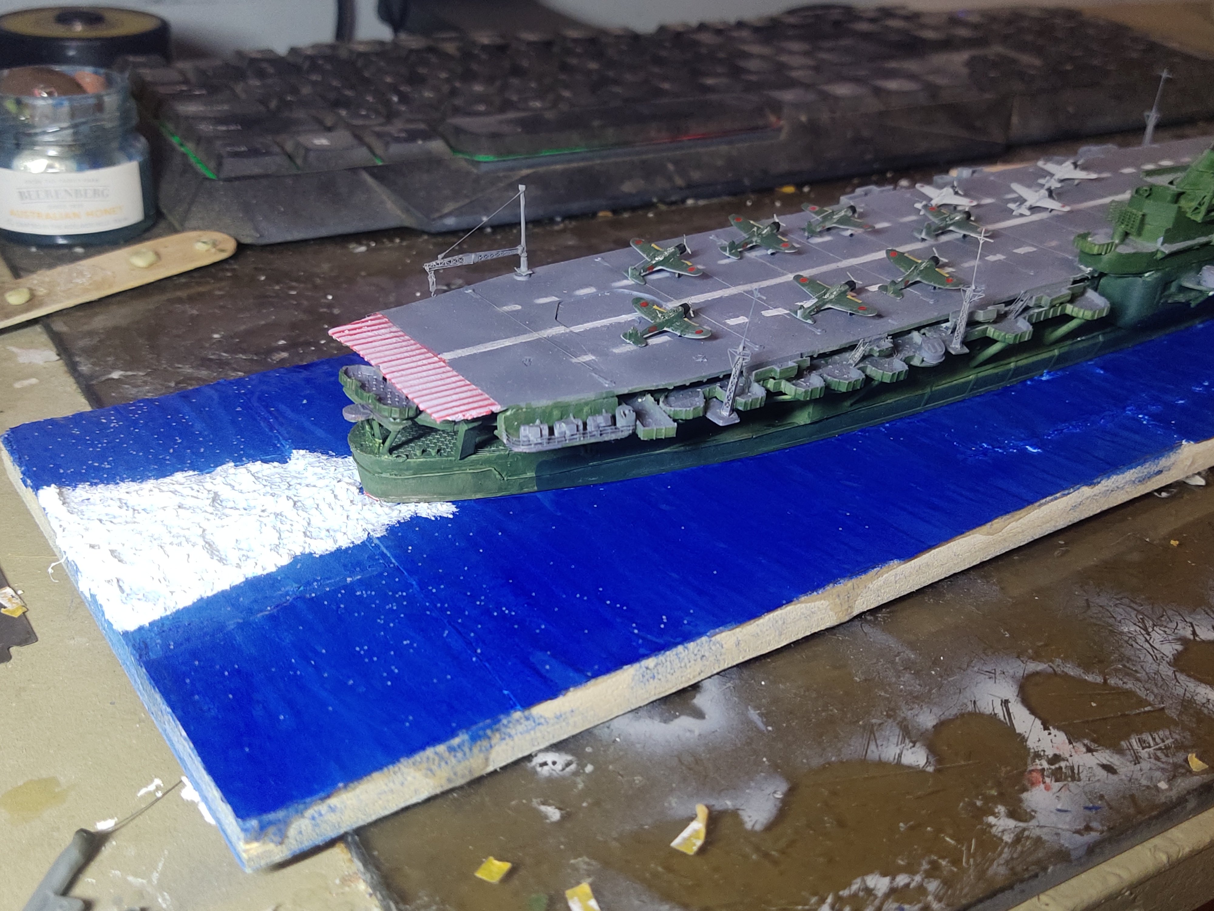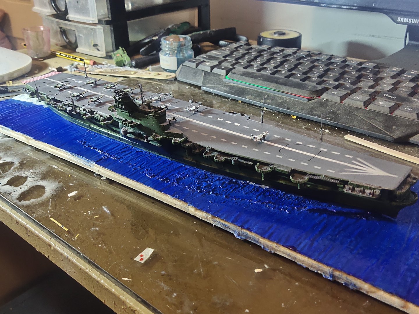 I decided to glue the planes to avoid any accidents along with the anti falling nets. I didn't have a PE part for crane so it was made by two masts glued together, like those at the sides of the ship but bit shorter. AA guns and life boats need to be added but my printer needs to be fixed so while the parts are on their way I spent time making the sea base