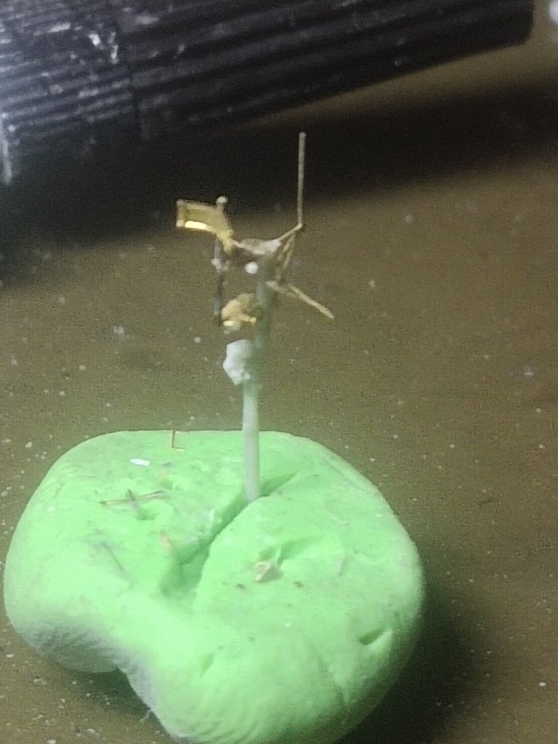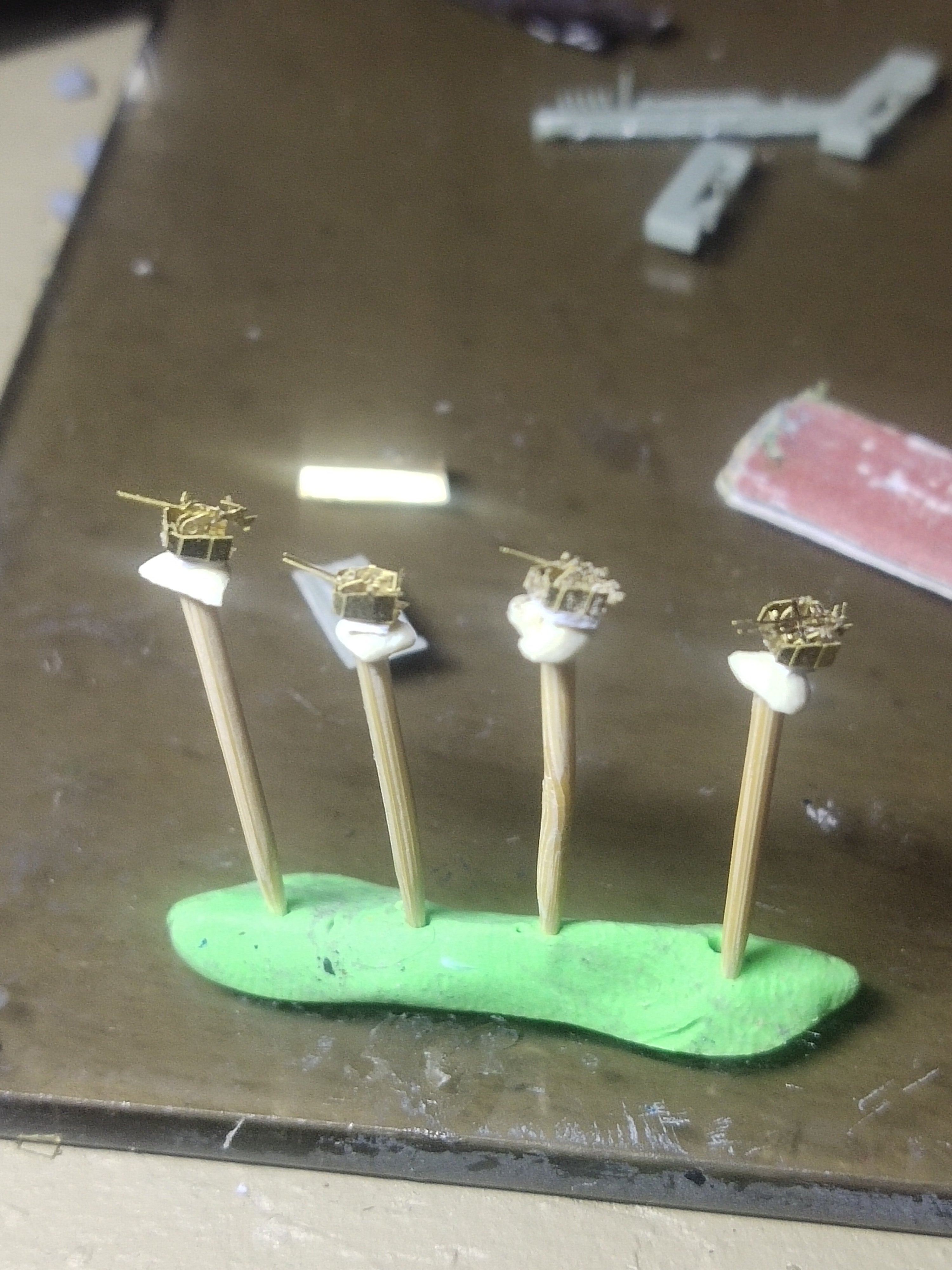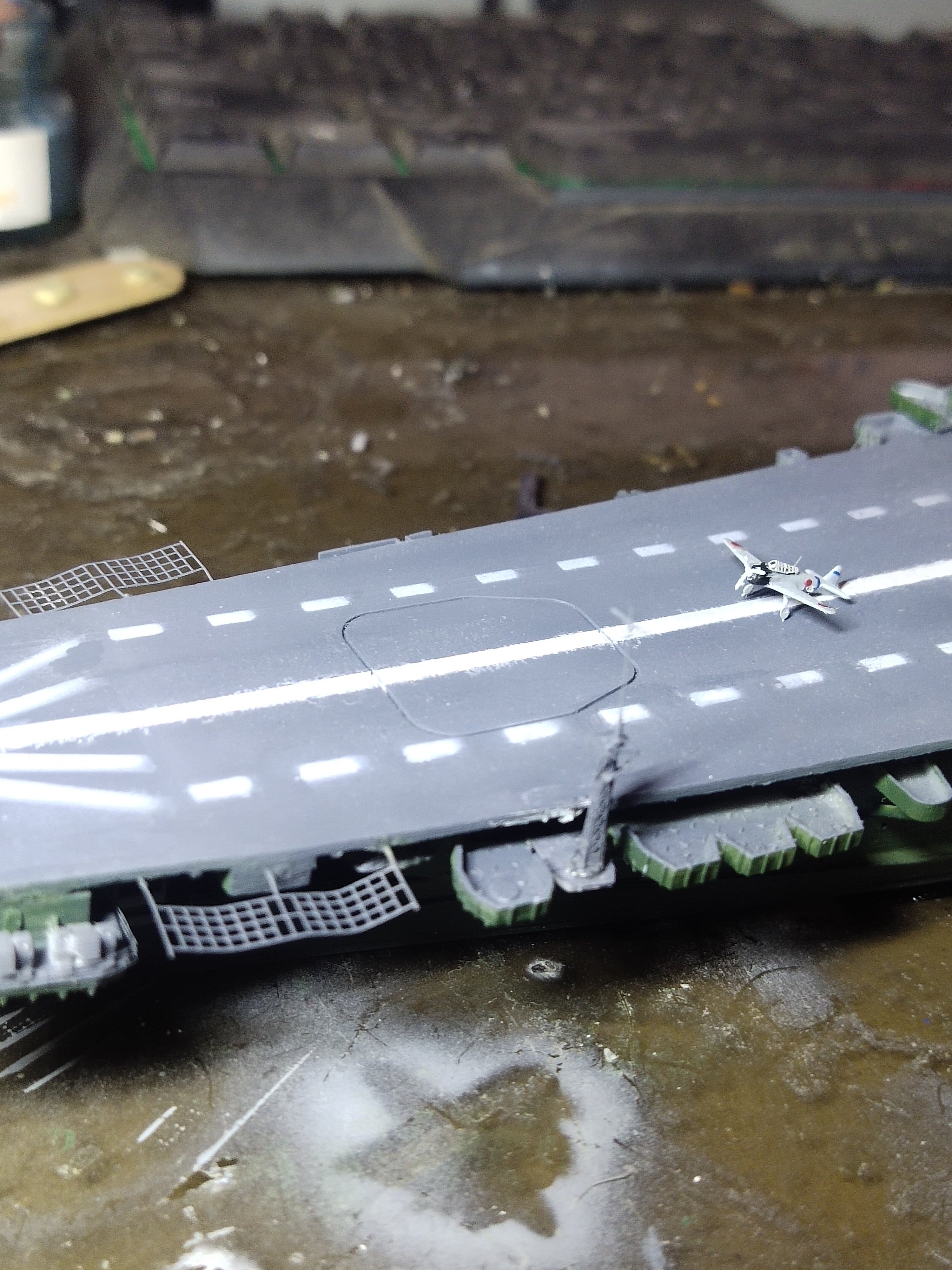 I decided to glue the planes to avoid any accidents along with the anti falling nets. I didn't have a PE part for crane so it was made by two masts glued together, like those at the sides of the ship but bit shorter. AA guns and life boats need to be added but my printer needs to be fixed so while the parts are on their way I spent time making the sea base