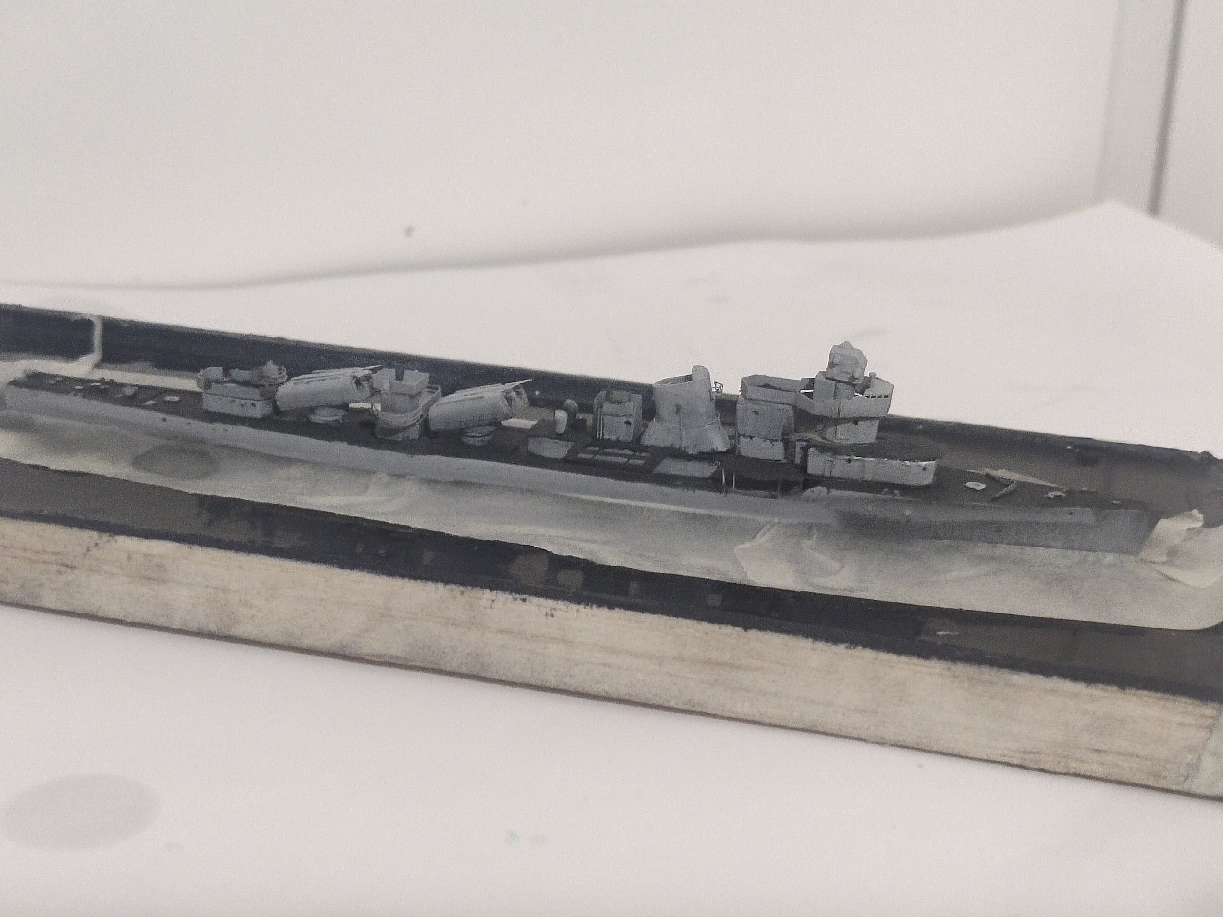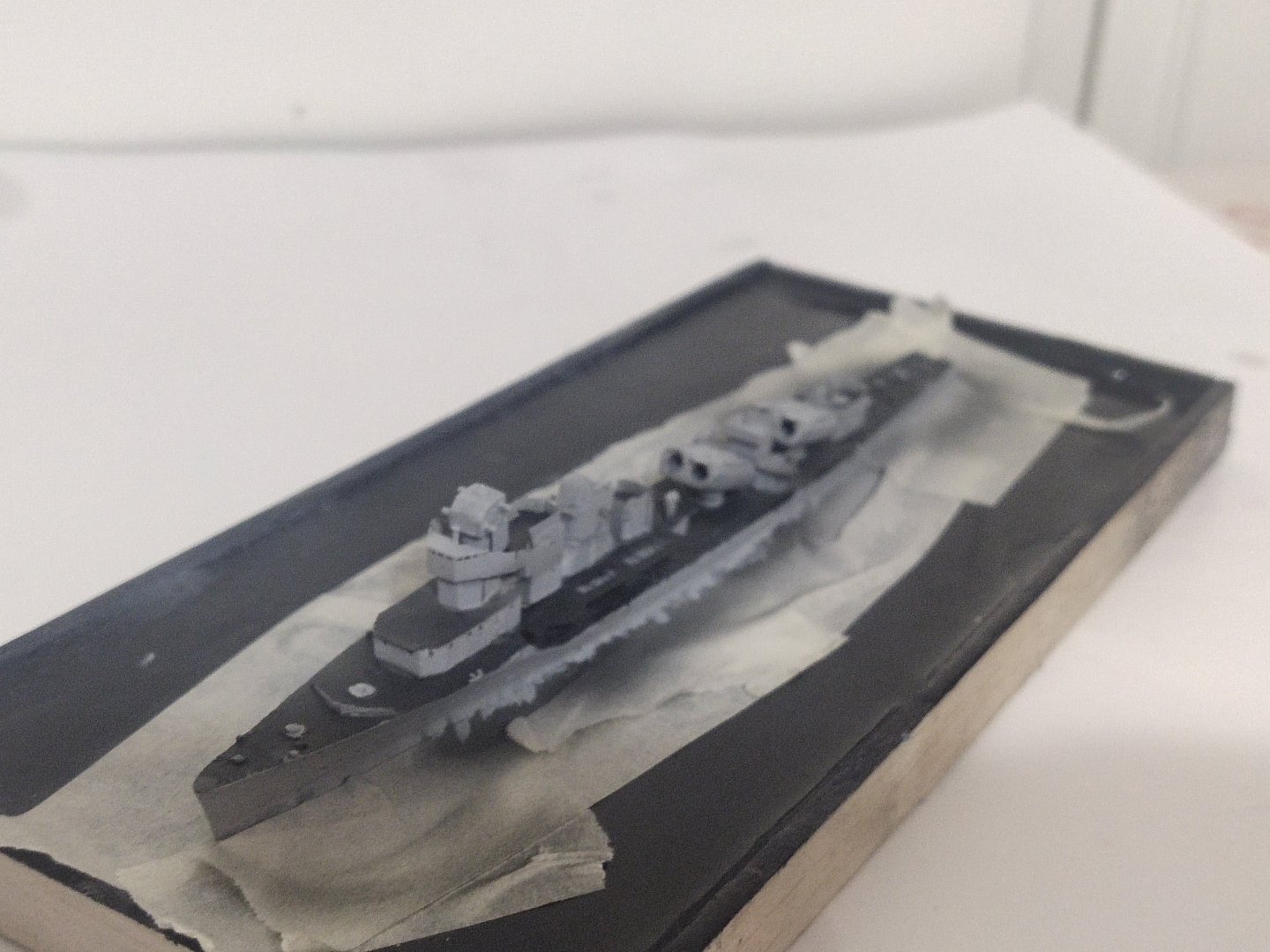 I added the remaining AA guns. They gave noticeable details. Some single 25mm added as well. Some darkening with black oil and a basic rigging. As the ship had a very short life no weathering is required. Seabed is also done. It looks well apart from the wakes close to the stern. They shouldn't follow the hull shape. The decision of using a narrow base led me to this mistake. But need to move on, can't spend time to make a 3rd base.