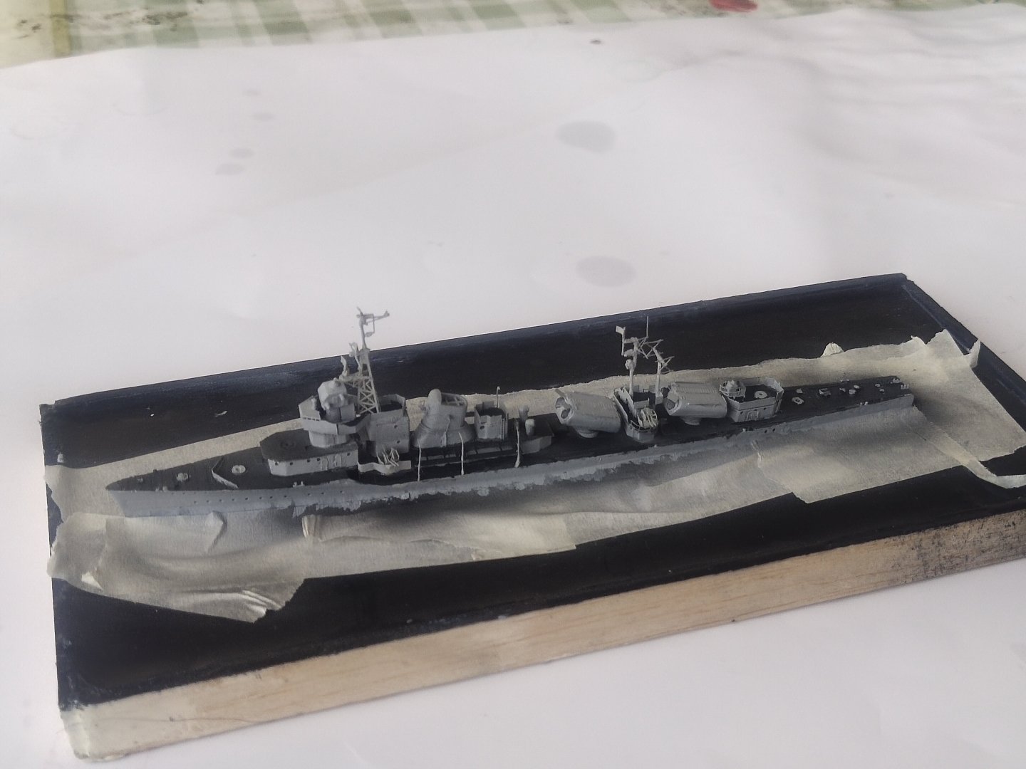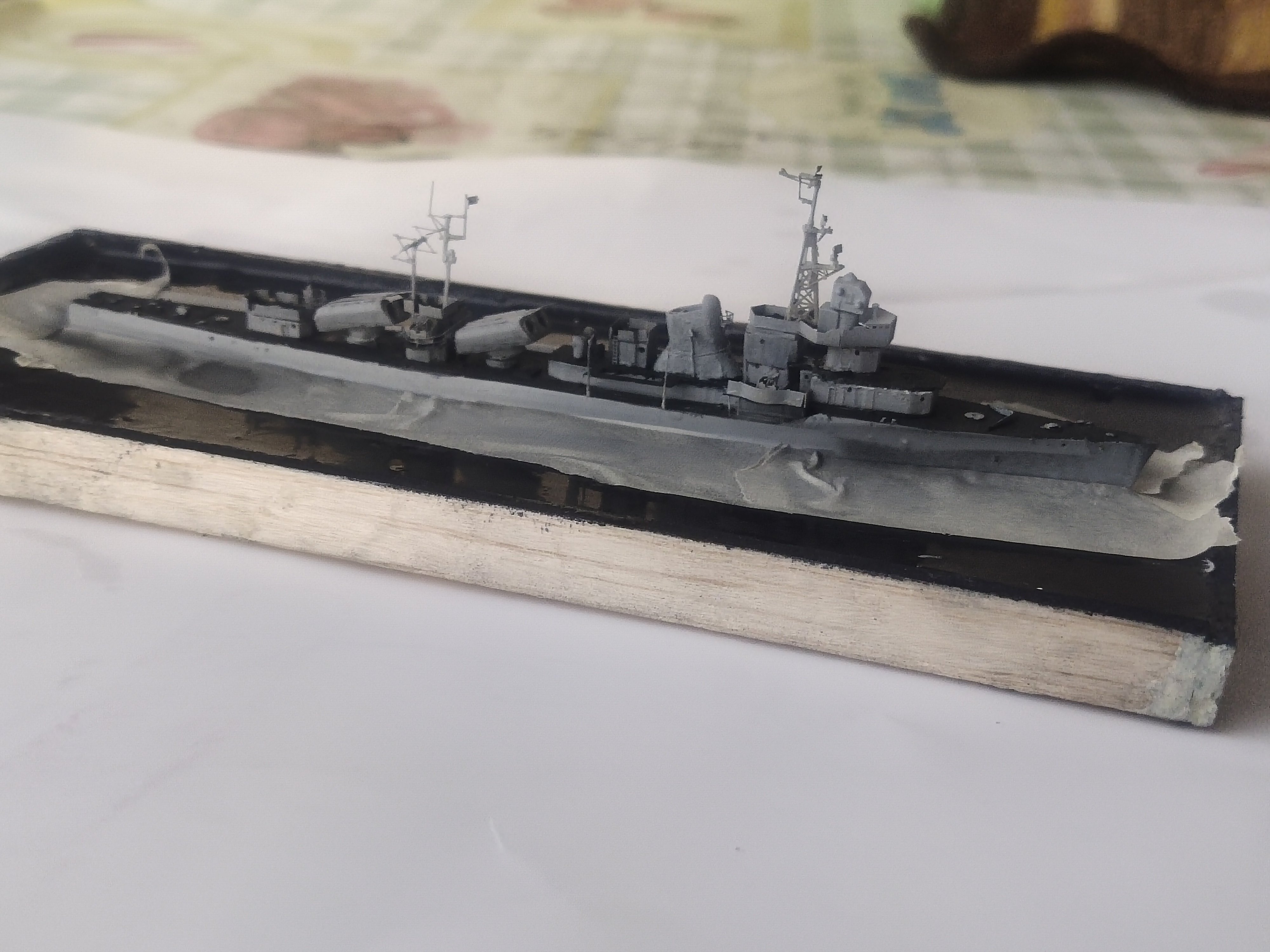 I had issues how to permanently straighten the hull. A wooden base was made, model was placed on the center and a small amount of resin was poured. It was left dry overnight. Hull sides were painted gray already. Looks like I have to cover the base before future painting. t Upon my first look at the model it was noticable how many PE pieces exists, comparing to the few resin ones. First trouble came when I start to make the missile launchers. Apart from the base the others are metal ones, a frame and the "skin", mini parts than must be folder in oval shaped and attached over the frame After struggling for 2 hours it was pretty obvious that there's not a chance I accomplish this task and even if I do result will be mediocre. So once again standars parts were used as a reference for size and I made my own launchers pack after 3 attempts. Then I only add the enchancing PEs. Since there was an option for the hatches to be left open, I made also a few missile heads. Finally the funnel was added with bit extra detailing according to pics I studied