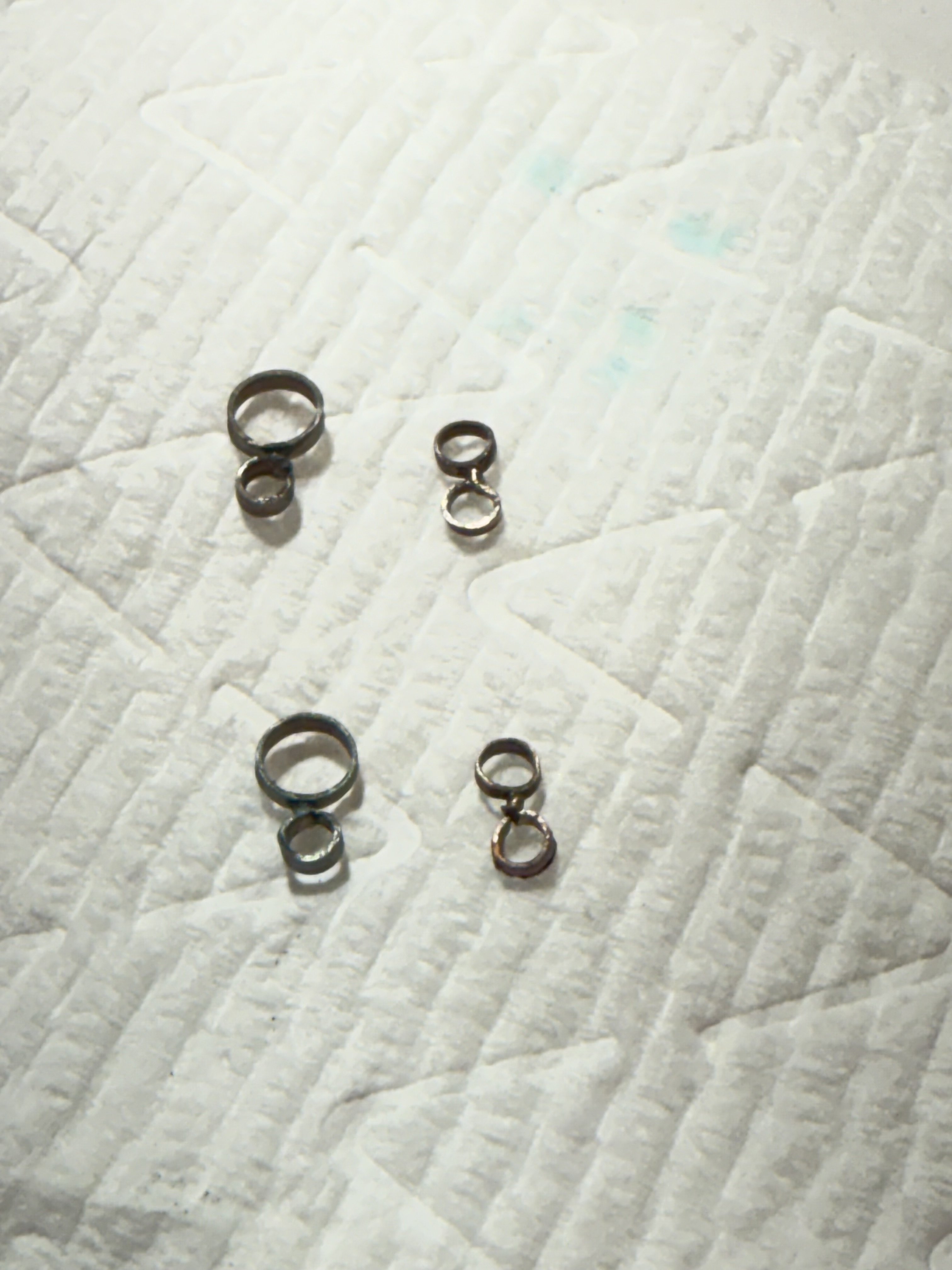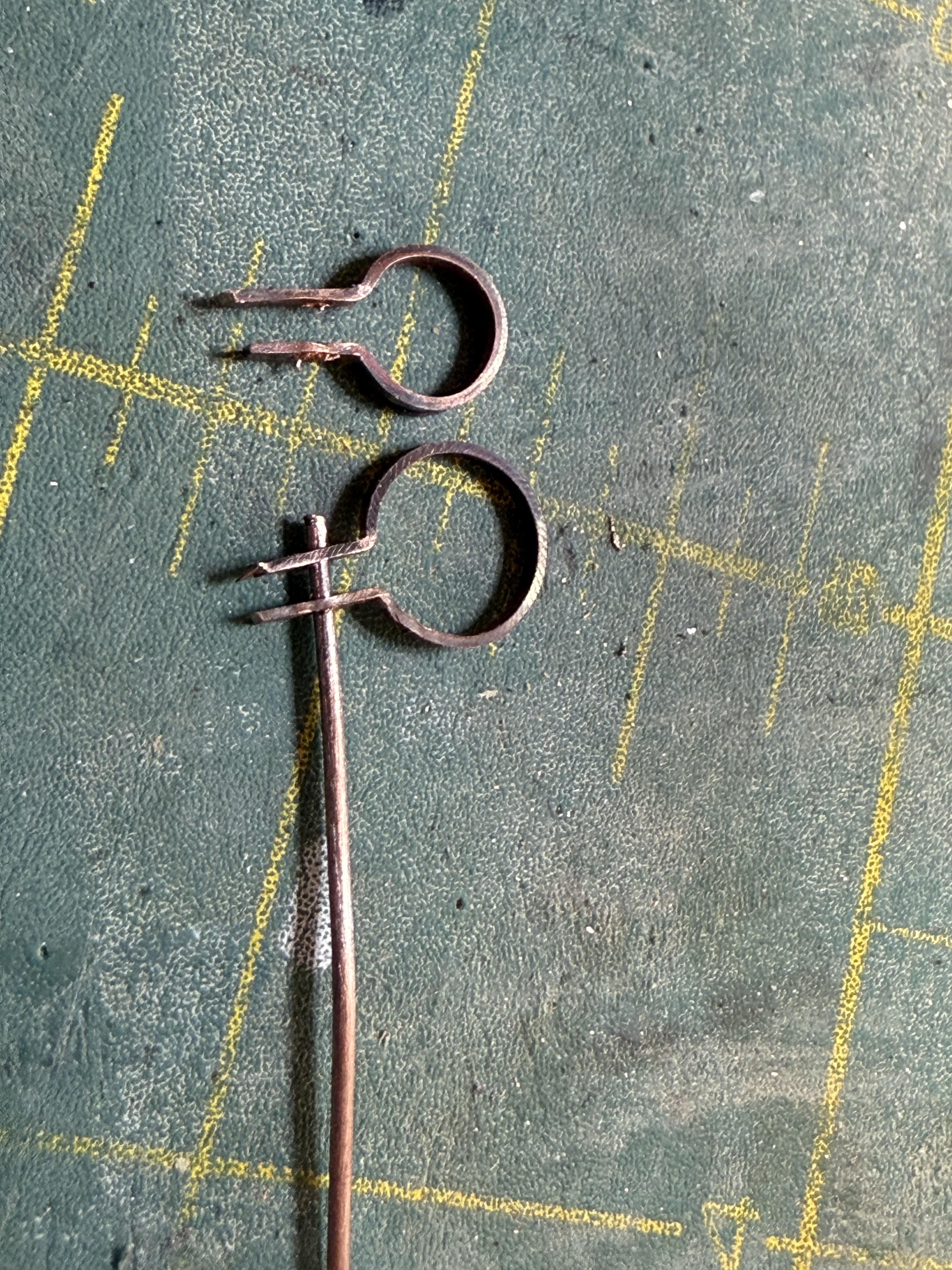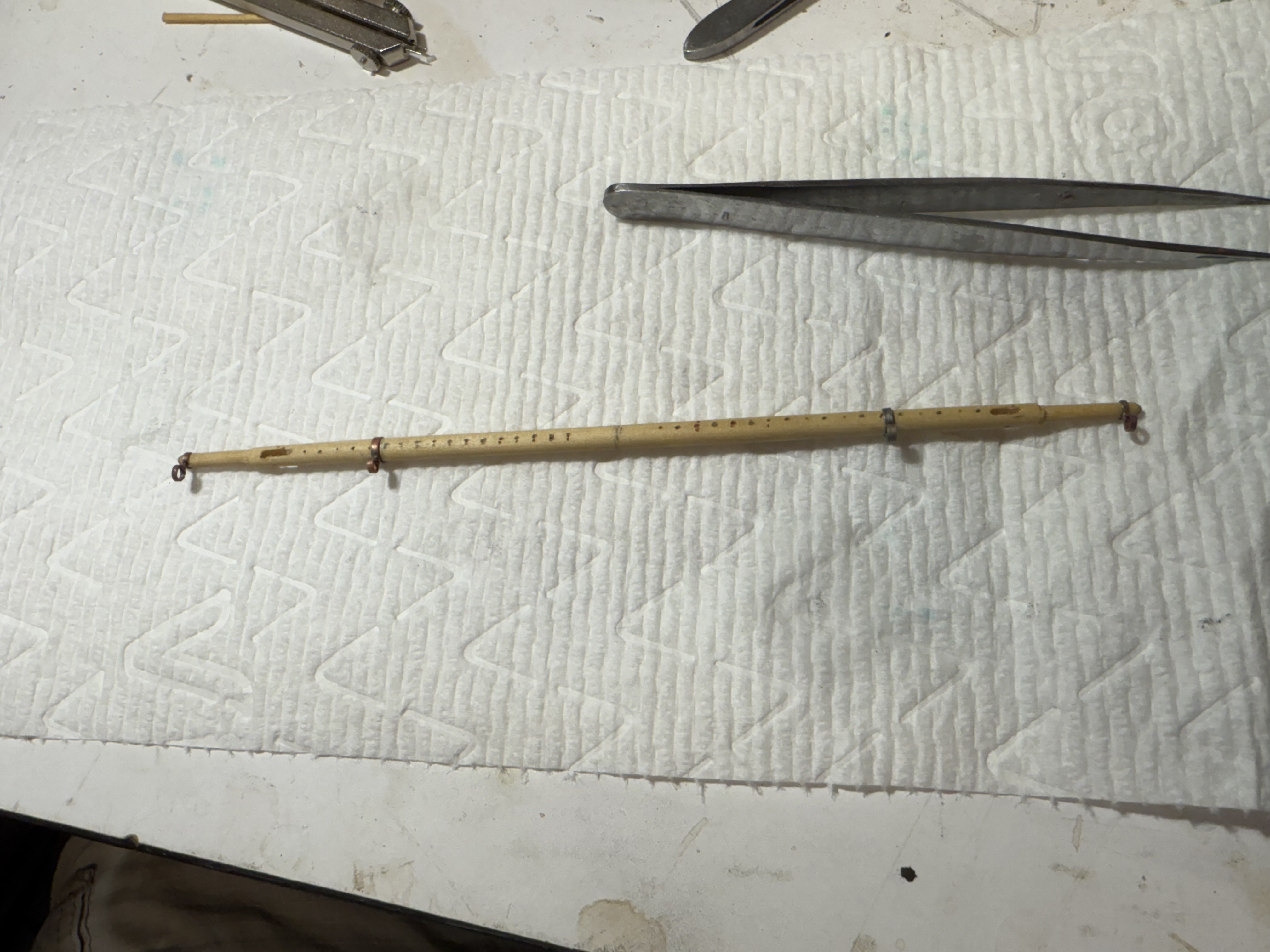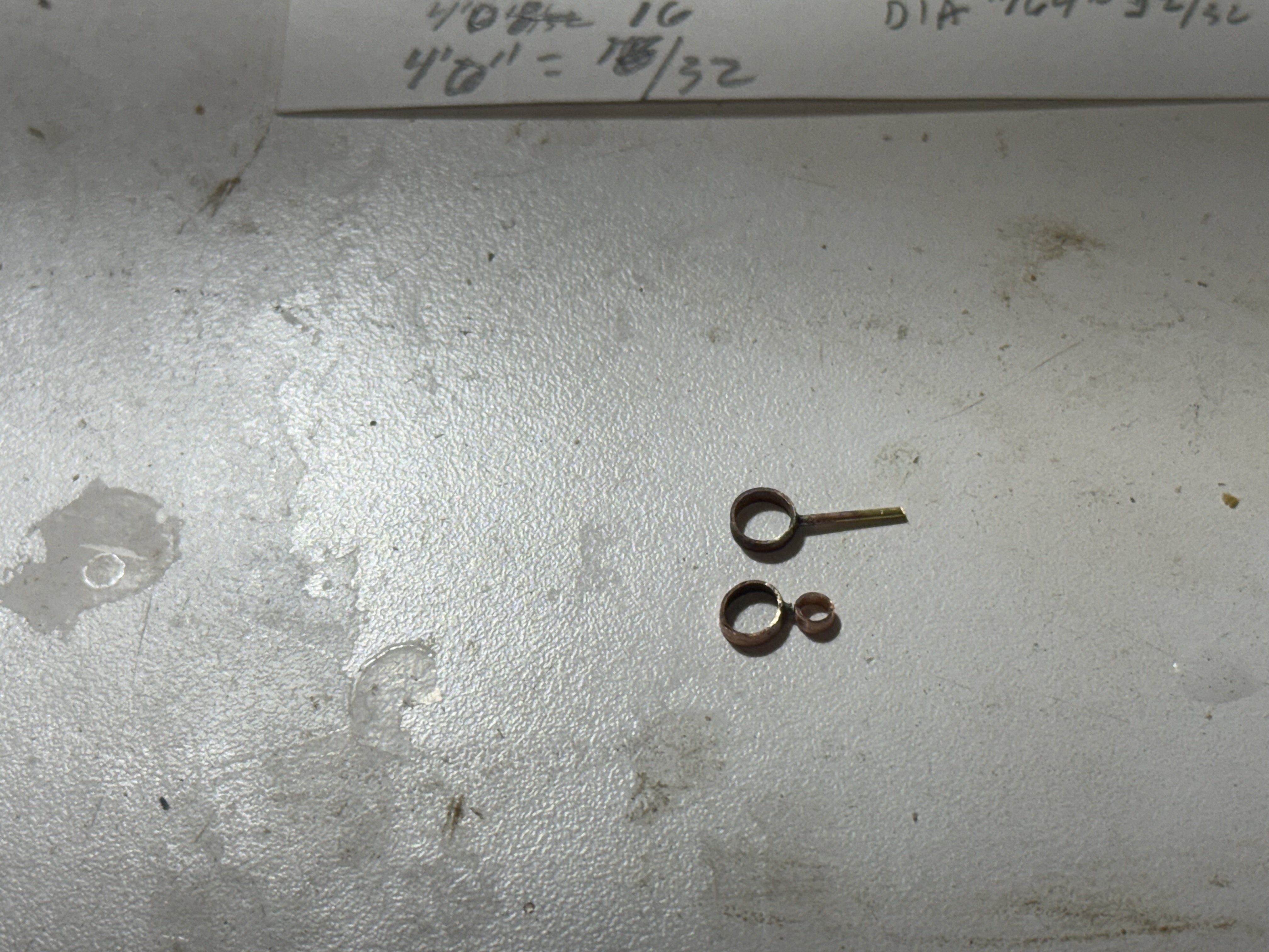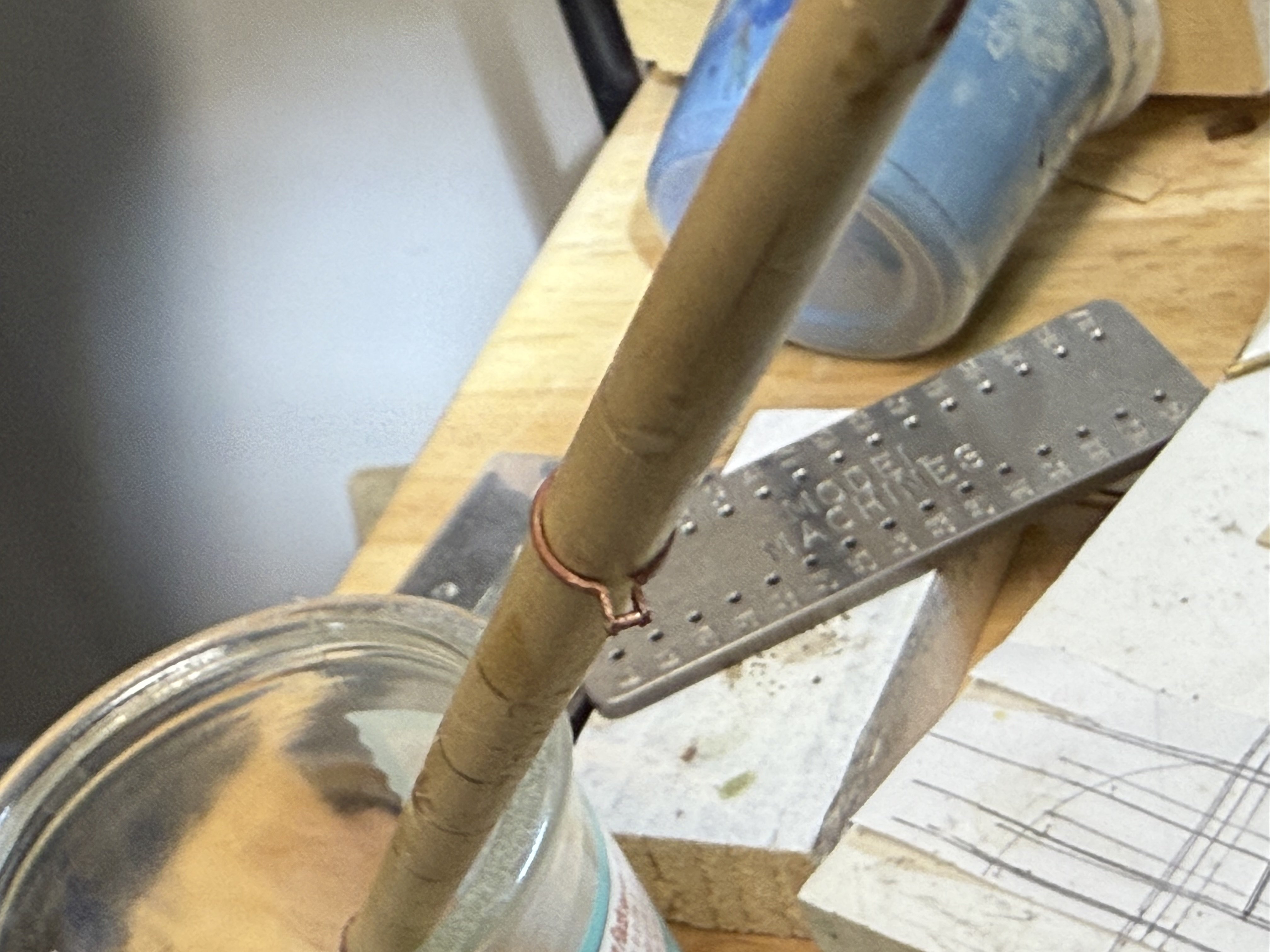 In that time I made the 5 lower yards, main and fore topsail yards, fore, main and mizzen course yards. Actually made 6 as I broke the yard arm on the fore topsail yard trying to push one of the bands on and had to remake it. Good news is it’s better than the first one. I also made the stunsl booms prior to making the stunsl irons.There were a lot of iron work on each yard. These were made from copper tube and sheet. Each had to be individually fitted to the yard. All the iron work was blackened.