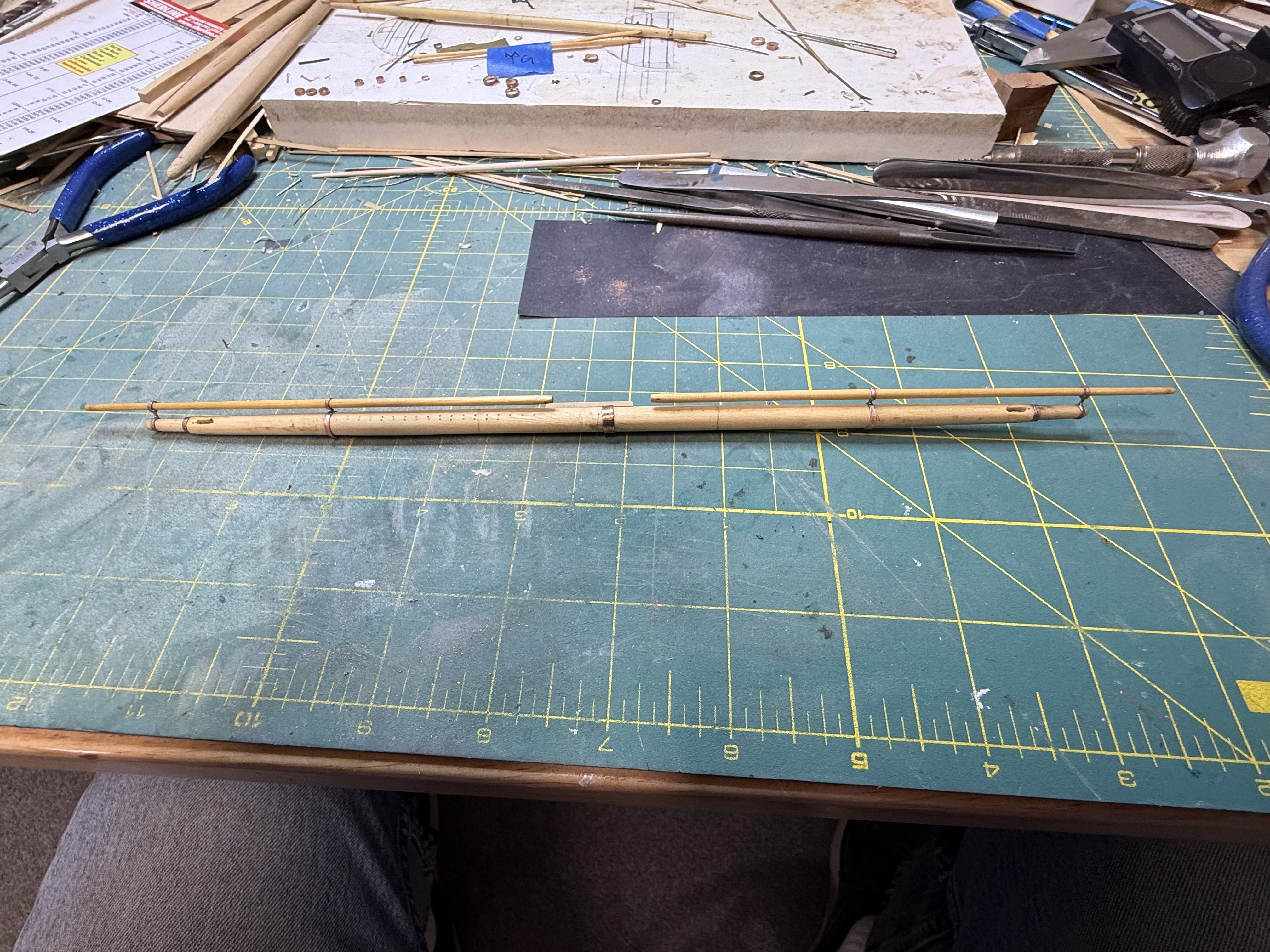Yards were painted flat black, bands pushed on,sheaves rivited in and the yards rivited to the parrels.