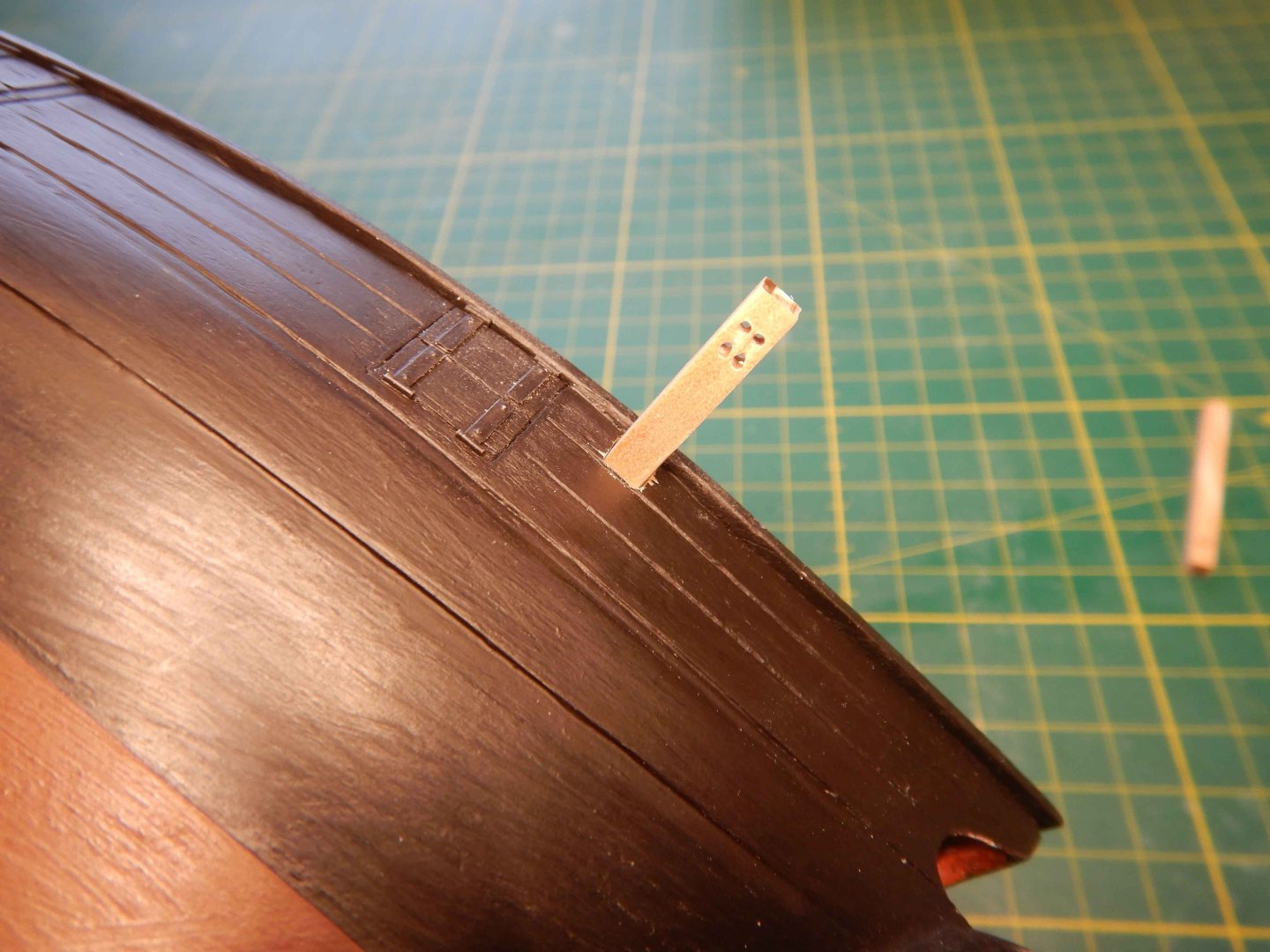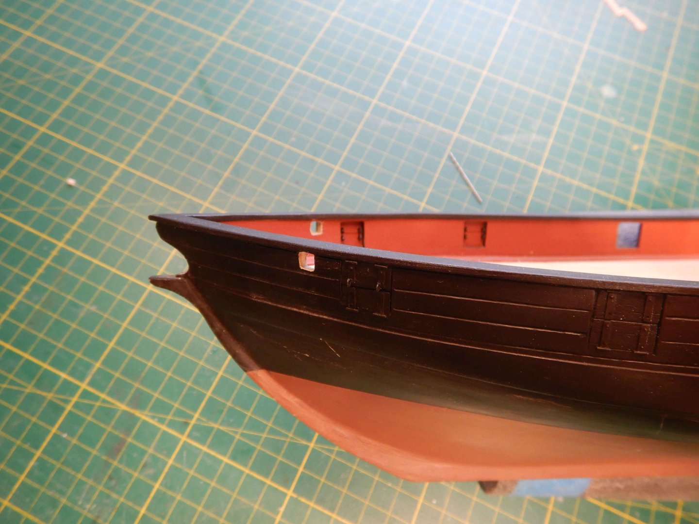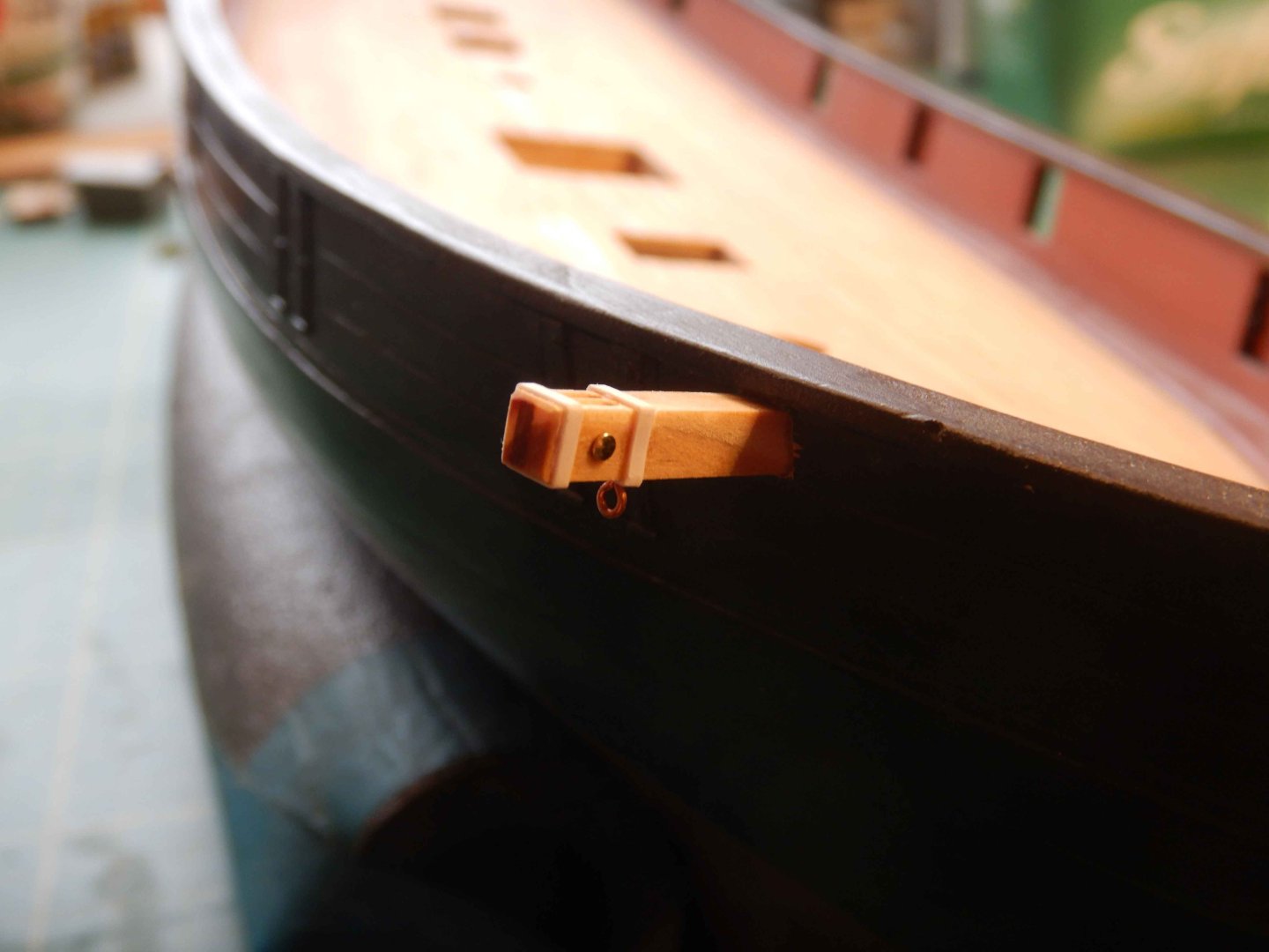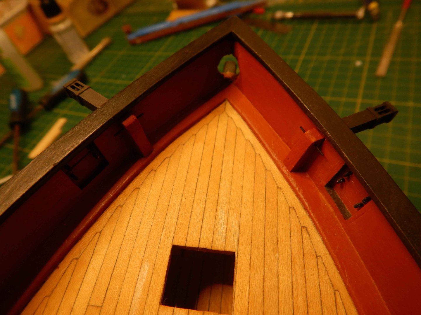 Hello all! Thanks for looking in and commenting and liking. It’s very inspiring! I had planned to start the deck gratings/coamings but decided to try finishing the gunport lids that is closed first. Didn’t really have a plan for how to do this other than a general idea. Made the port lids of scrapwood and cut a groove where they overlap eachother. I decided to use styrene strip and rod to make the hinges. I imprinted with an awl on the backside to imitate bolts. Glued them on with ca glue, added eyebolts and painted.. And added eyebolts on the inside aswell. I think I have found the way to do these, as I think the result is acceptable. I have also given the red another coat of paint after sanding the deck. I first brushed a coat of matt varnish along the masking tape to avoid bleeding. This worked great! No bleed at all. Recomended! Gaffrig.