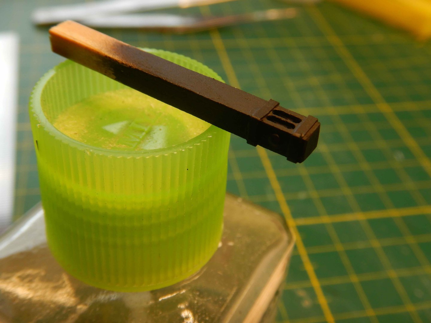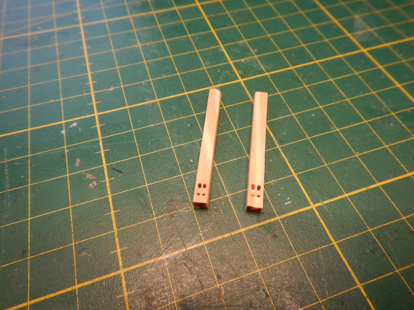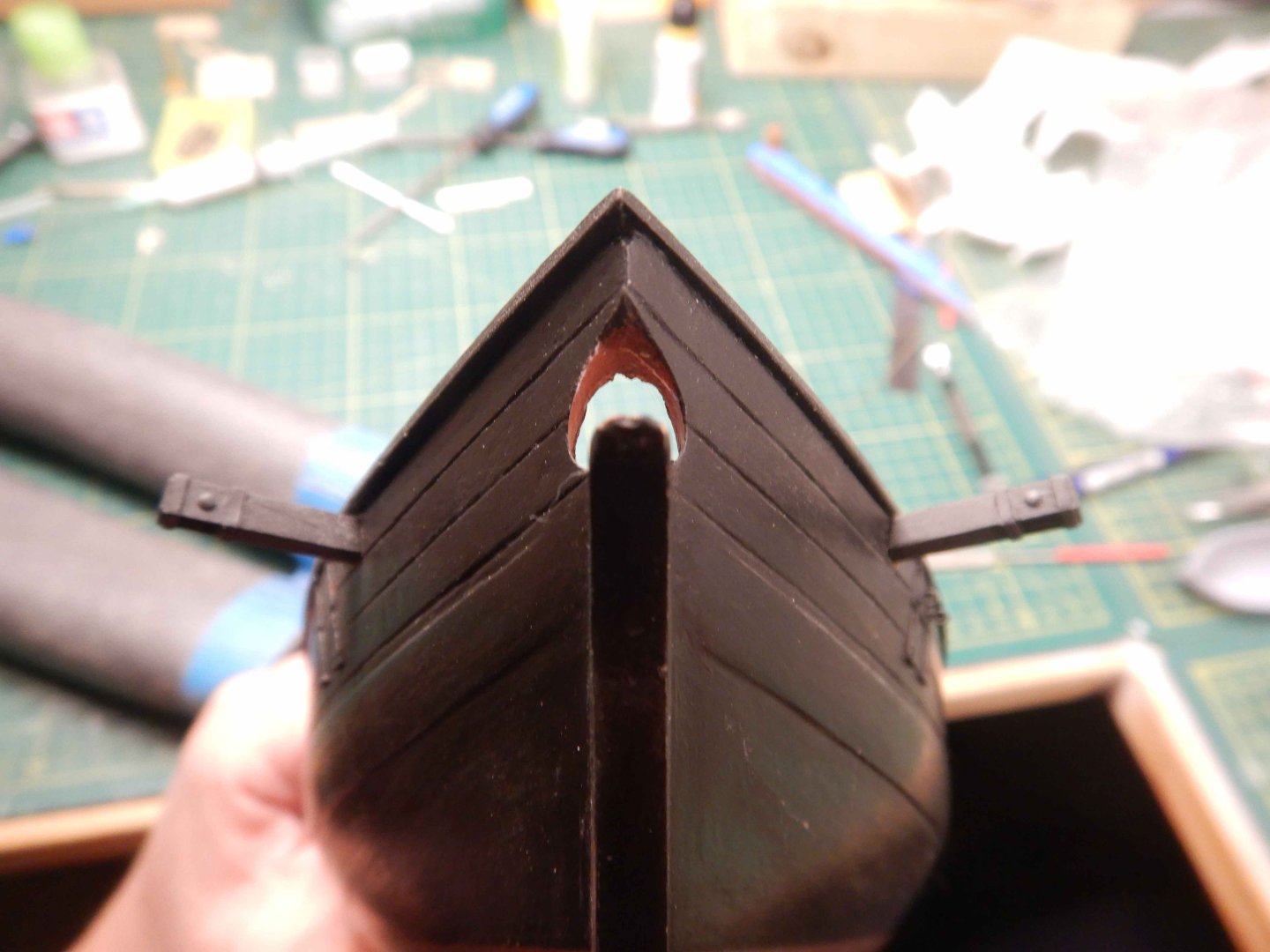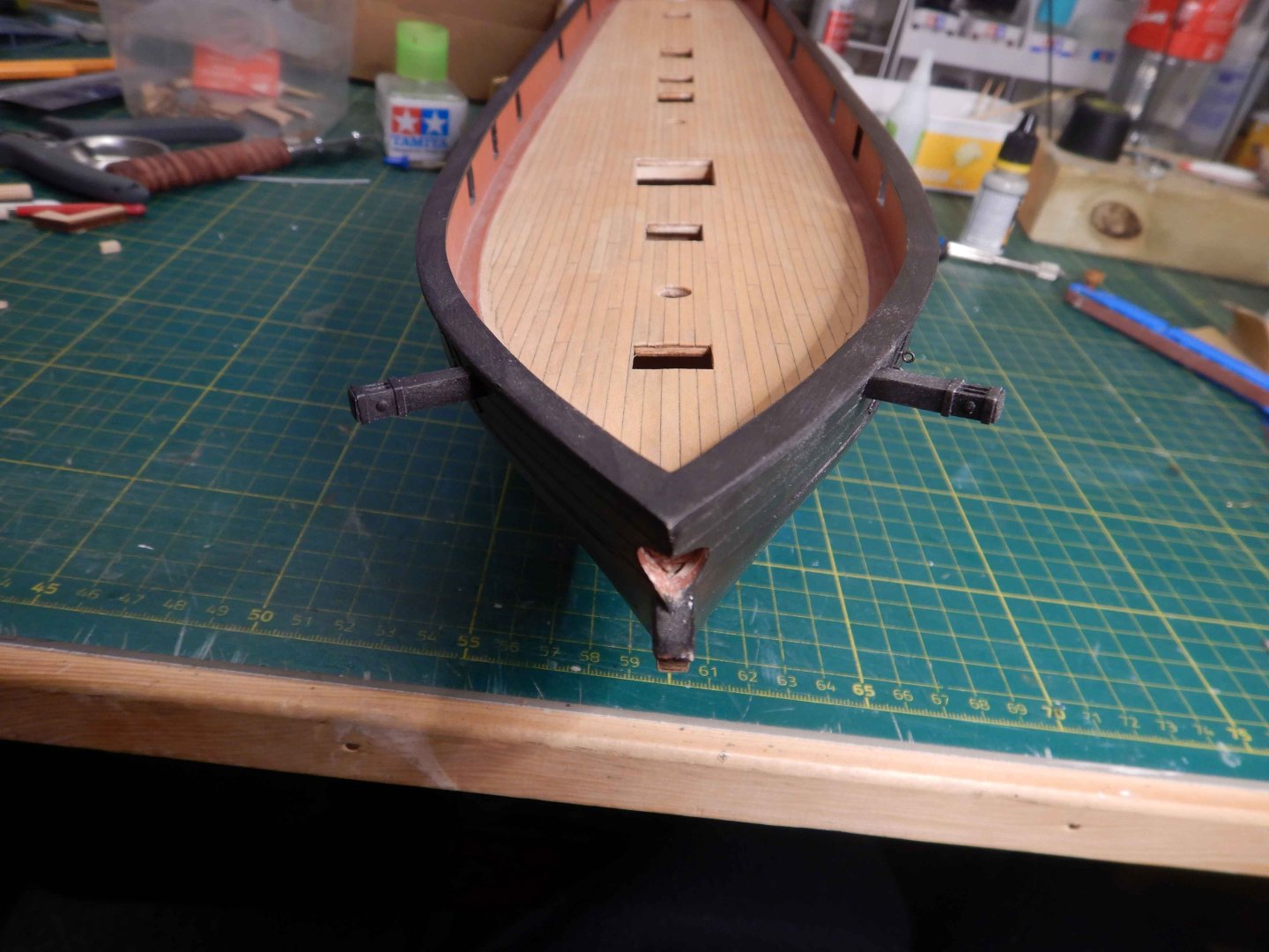 Hello all! Thanks for looking in and commenting and liking. It’s very inspiring! I had planned to start the deck gratings/coamings but decided to try finishing the gunport lids that is closed first. Didn’t really have a plan for how to do this other than a general idea. Made the port lids of scrapwood and cut a groove where they overlap eachother. I decided to use styrene strip and rod to make the hinges. I imprinted with an awl on the backside to imitate bolts. Glued them on with ca glue, added eyebolts and painted.. And added eyebolts on the inside aswell. I think I have found the way to do these, as I think the result is acceptable. I have also given the red another coat of paint after sanding the deck. I first brushed a coat of matt varnish along the masking tape to avoid bleeding. This worked great! No bleed at all. Recomended! Gaffrig.