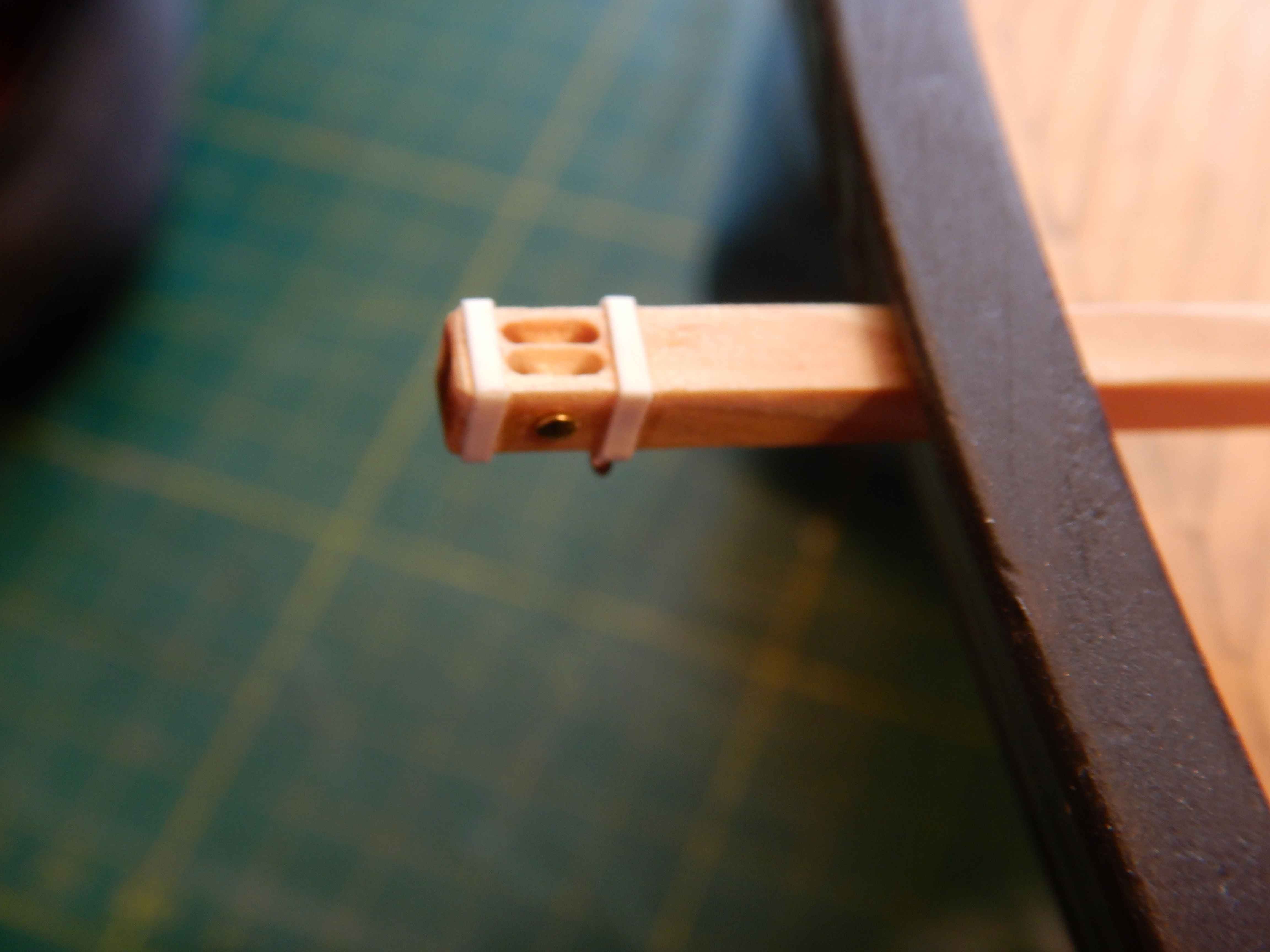 Hello! After life has gotten in the way for too long, I have finally been able to find some time to blow the dust of my model and make a little headway.. Spent quite some time to get my bearings and figure out where I left off and what to do next.. I decided on cutting holes and fixing the catheads inplace. The kit part is a oversized plywood piece that leaves a lot to be desired... So I figured I'll scratchbuild theese. I had some 4x4 mm that I used and drilled/milled some holes/grooves to fake some sheaves.. I added some styrene strip to imitate iron bands, and brass nails for the sheaves. Also added a eyebolt for the end of the hoist tackle. I removed this again because I think it is easier to "splice" the rope in a loose eyebolt rather than one fixed to the model. Then added some paint.. Made the innfill pieces, glued it all inplace and painted and voila! my interpretation of Lynx's catheads are done! Next I think will be the rudder. Another plywood piece that I might end up scratch building. Gaffrig.