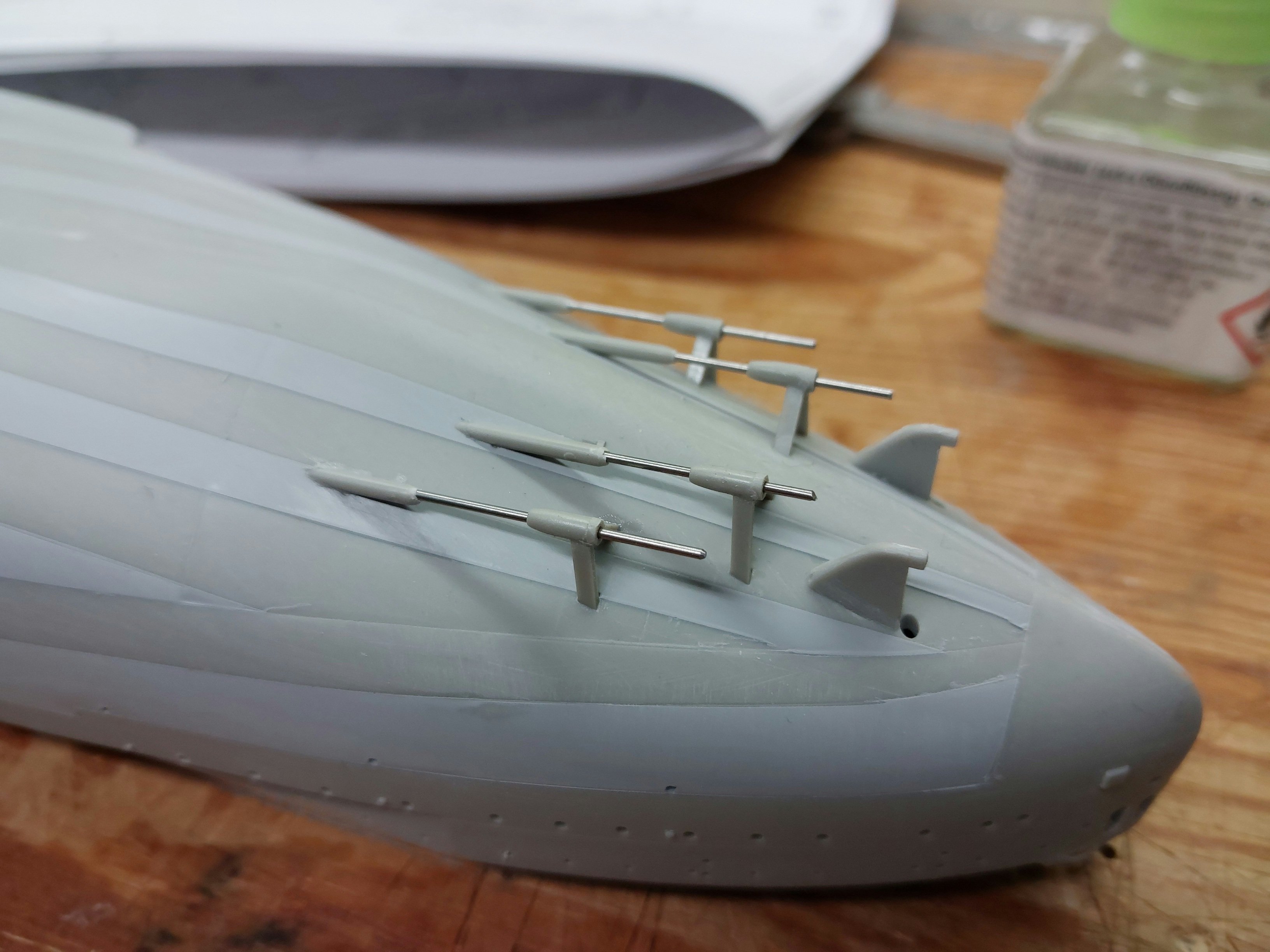The drawings show lots of overlapping plates on the lower hull but the kit show only a few.I added some plates but not the lot on the drawings. After masking I did 5 layers of Mr. Primer Surfacer 1000. After 1 hour removed the tape. Looks OK but hope its enough th see it later.