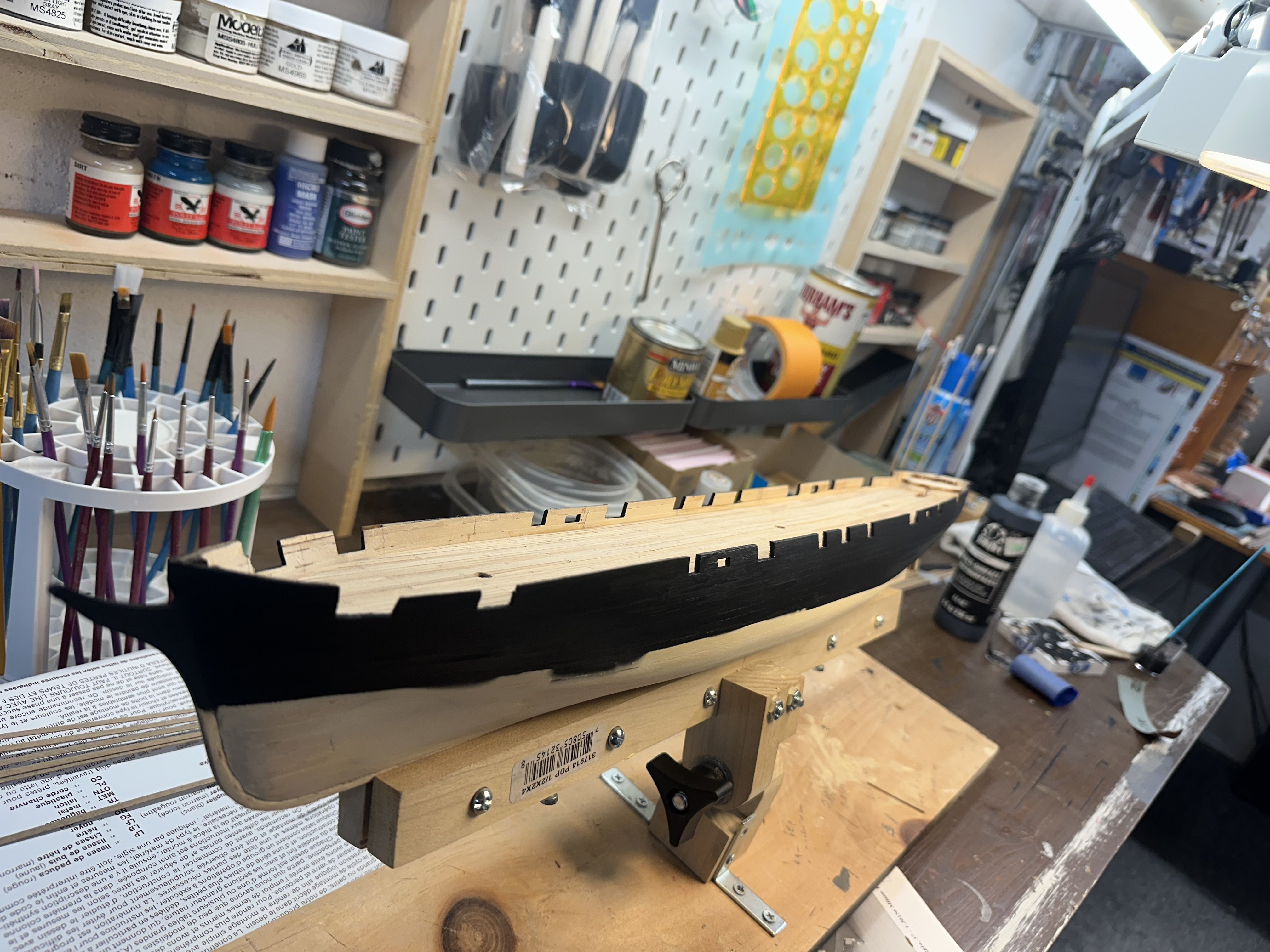 1. The upper hull is painted with two coats of airbrushed Folkart waterbased black from Hobby Lobby. The paint alone is too thick to go through the airbrush. An expensive Tamiya airbrush solvent or similar could be used, but I’ve found that mixing the paint about 1:1 by volume with regular ordinary windshield washer fluid from the dollar store (now $1.25 store) then running it thru a paint strainer does the trick quite well. There is the right amount of alcohols, surfactant, etc to really let that paint wet out nicely and form a very even coat on the wood. It sprays like a dream, no streaks or drips, and I’ve not noticed that the blue has any affect the color. Maybe because I’m using dollar store quality fluid? I’ve sprayed yellow and white doing this mixture and didn’t see any blue shade. The finish is matte, very matte. So if gloss is desired, either spray over it with gloss coat or buy the more expensive paints.