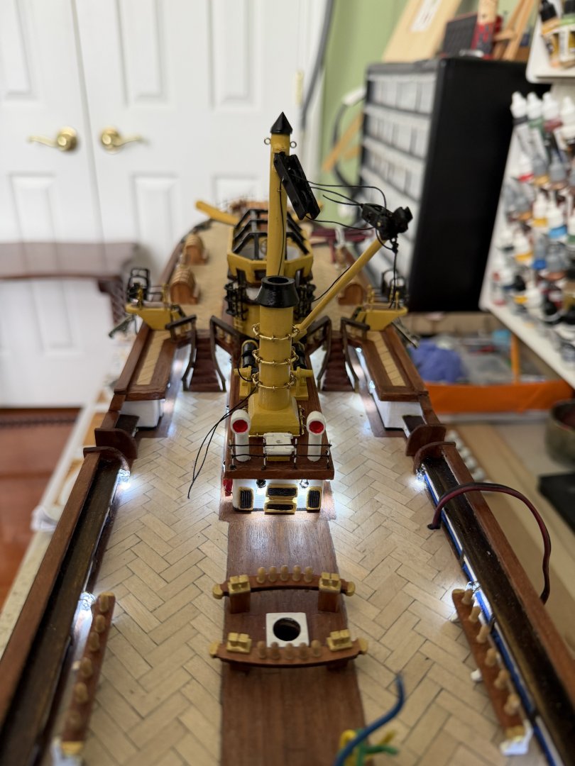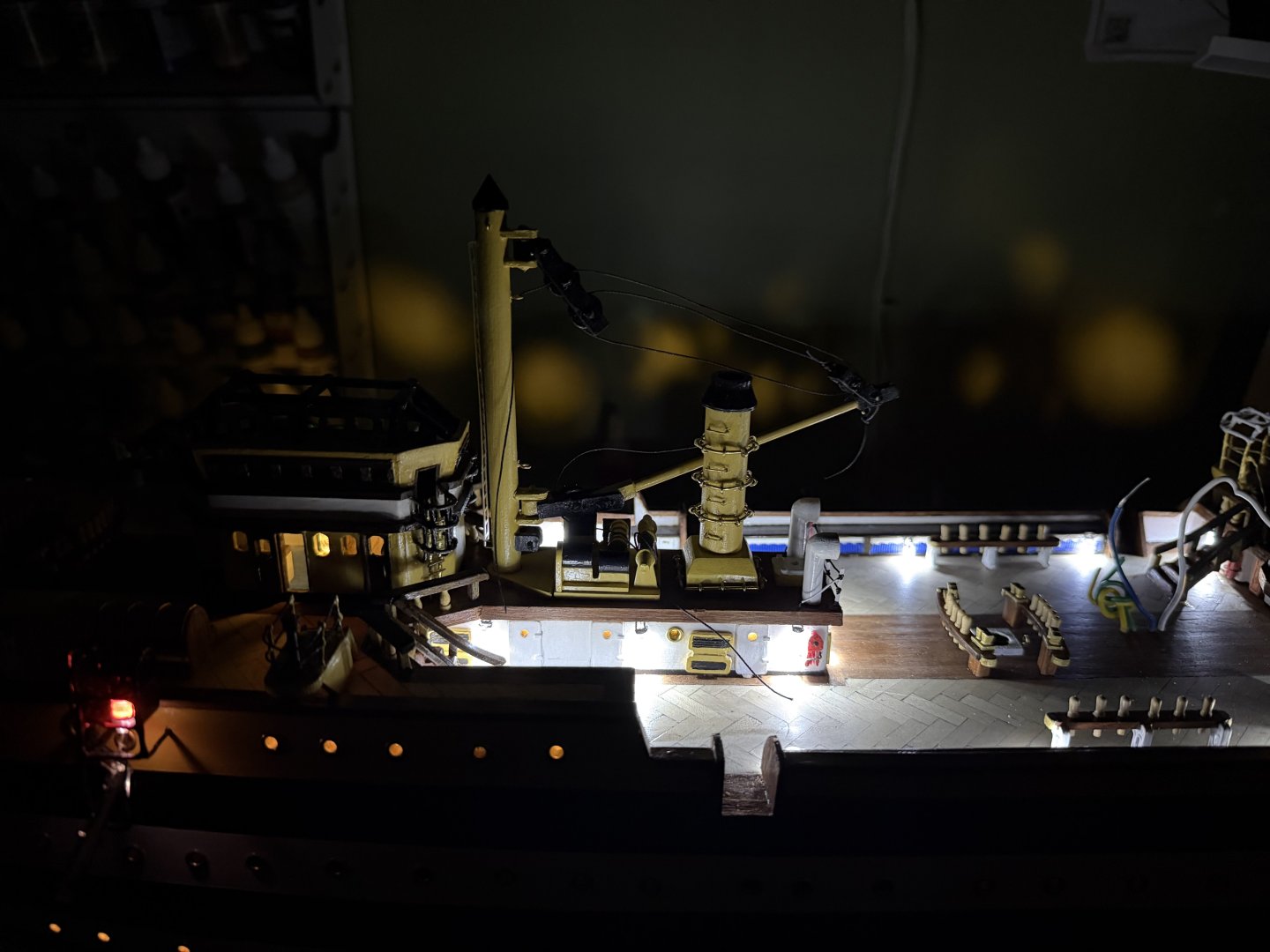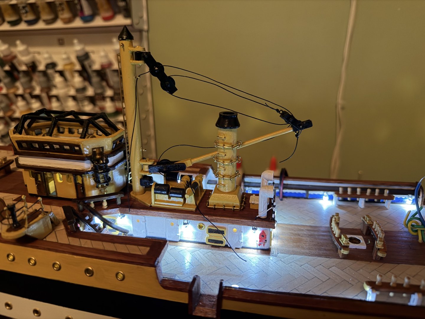 Daniel another logistical question on your build. I am crafting the holders/brackets for the side red and green navigation lights. I have a shape/design that I am pleased with. Very similar to your’s which is no doubt since I used photos of your’s to design mine. I am very curious about your installation. In the first photo you show them mounted in the side of the ship. In the second picture the brackets from the lower shrouds pass behind the navigation light fixture. Would you care to share what you did here?