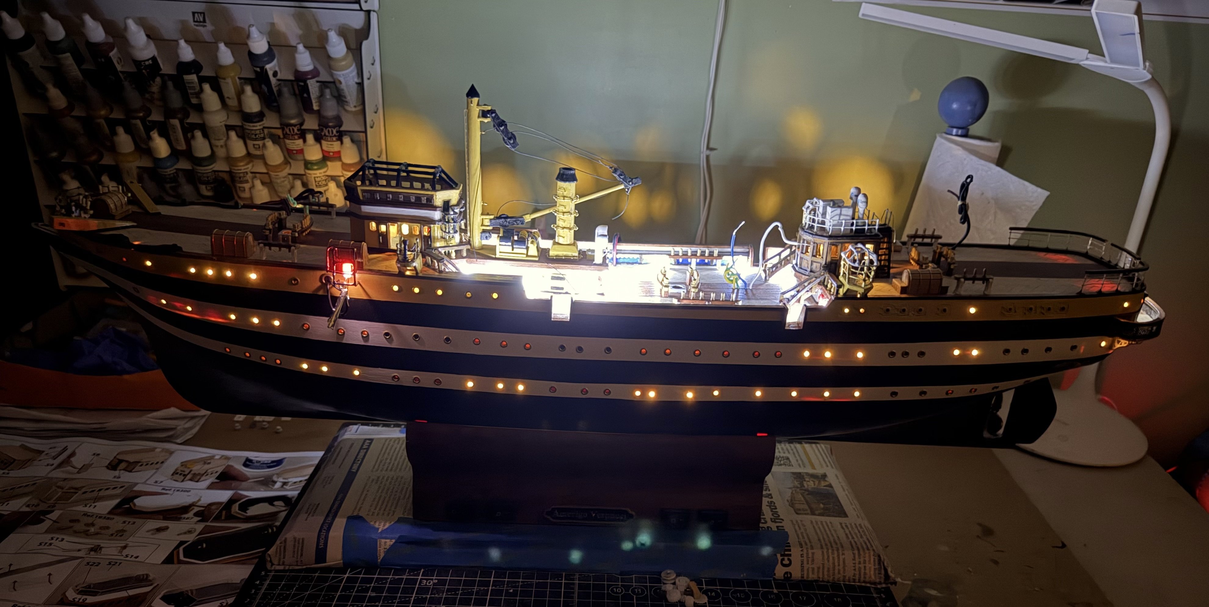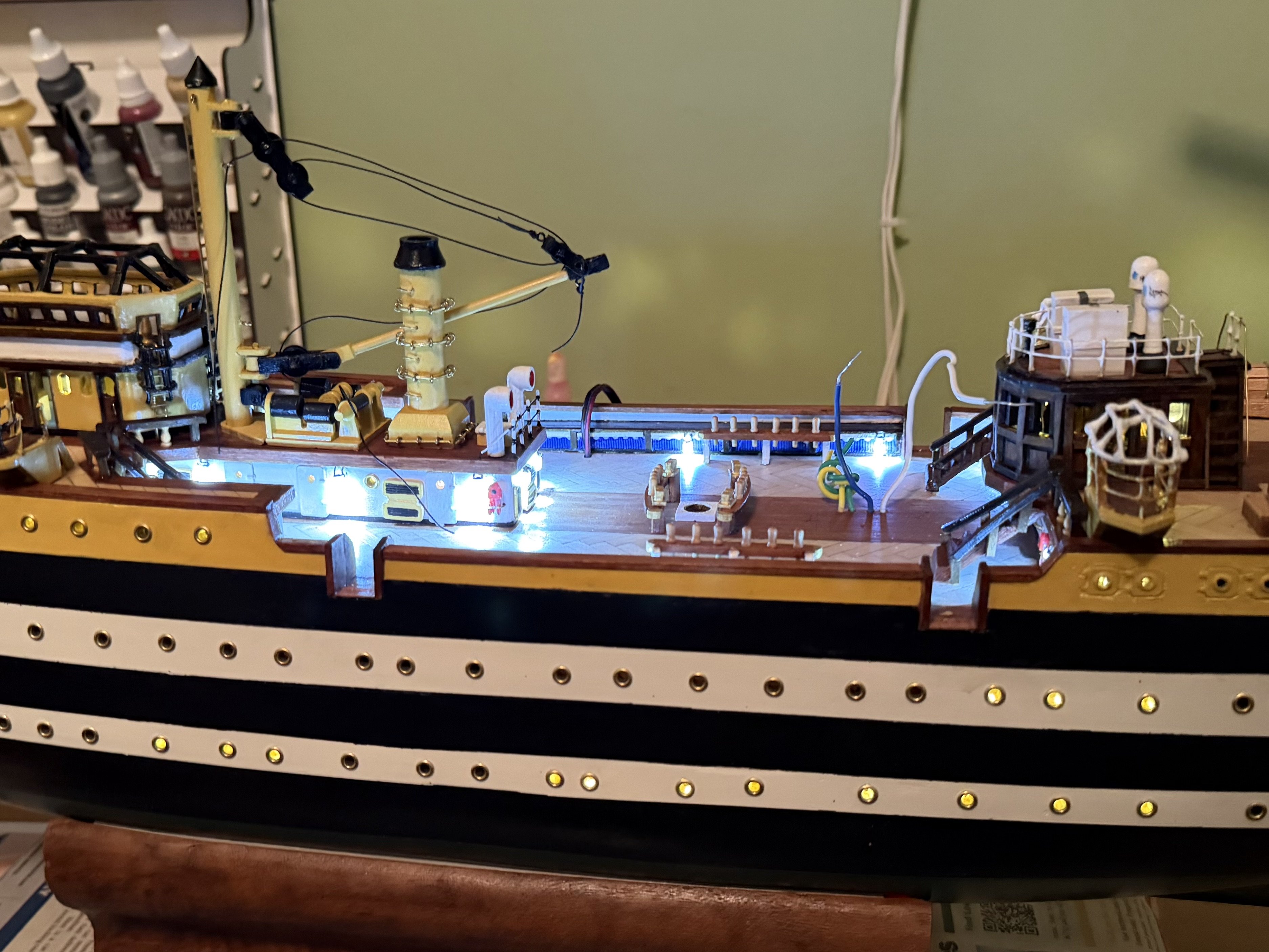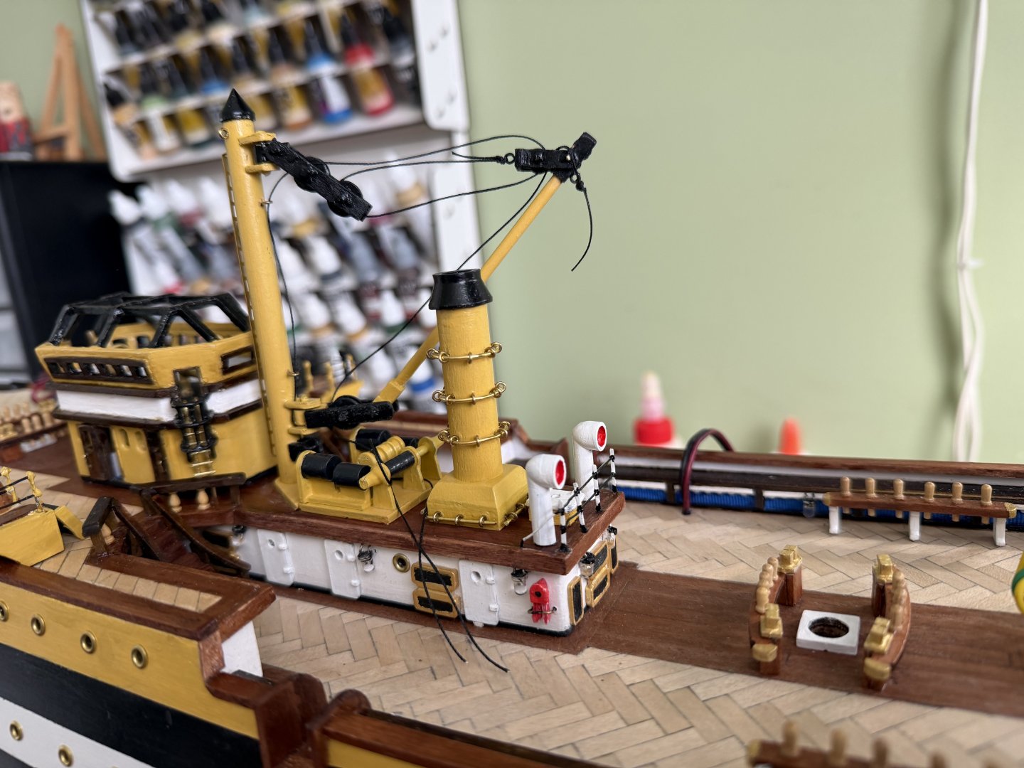 Daniel another logistical question on your build. I am crafting the holders/brackets for the side red and green navigation lights. I have a shape/design that I am pleased with. Very similar to your’s which is no doubt since I used photos of your’s to design mine. I am very curious about your installation. In the first photo you show them mounted in the side of the ship. In the second picture the brackets from the lower shrouds pass behind the navigation light fixture. Would you care to share what you did here?