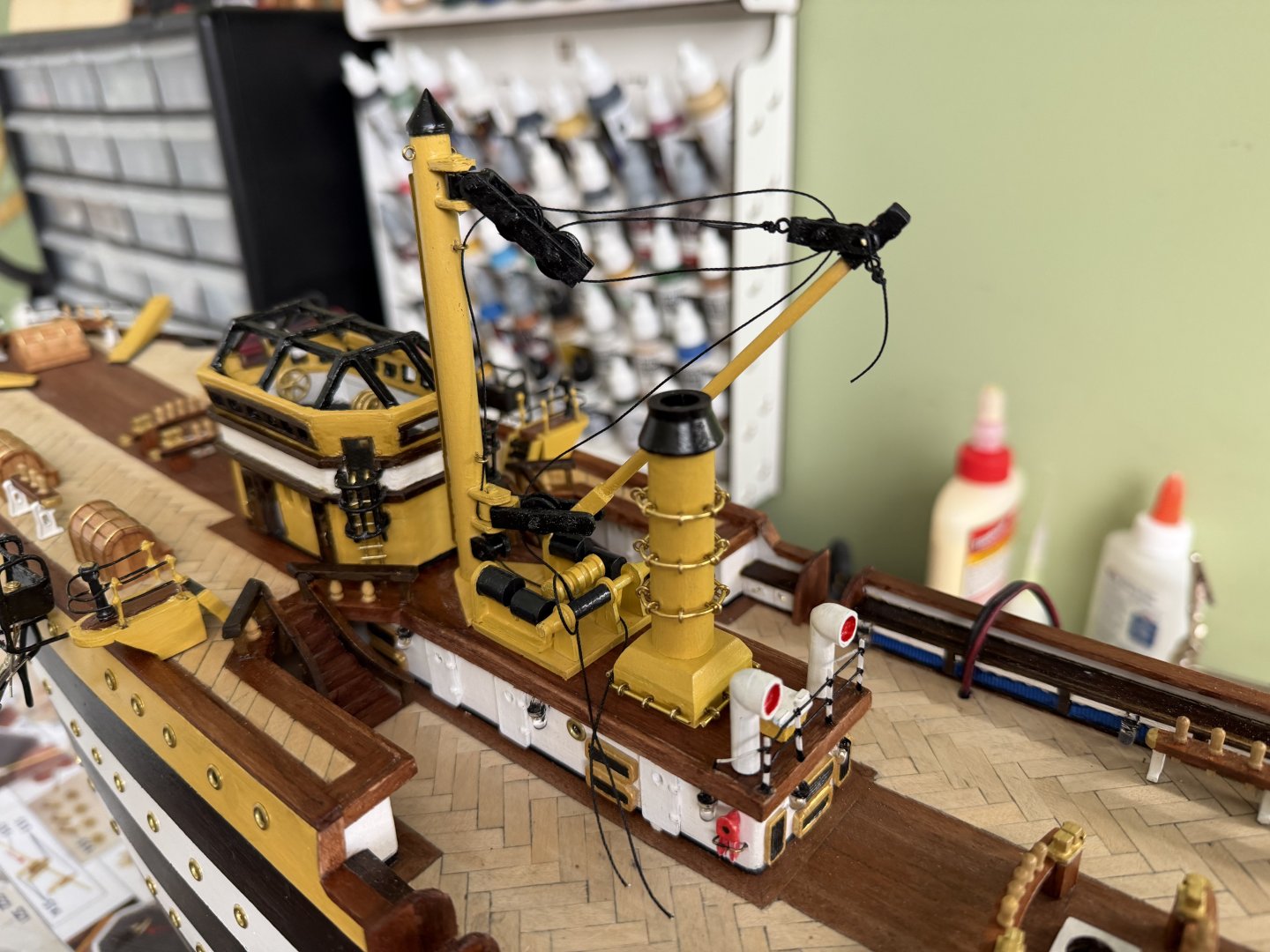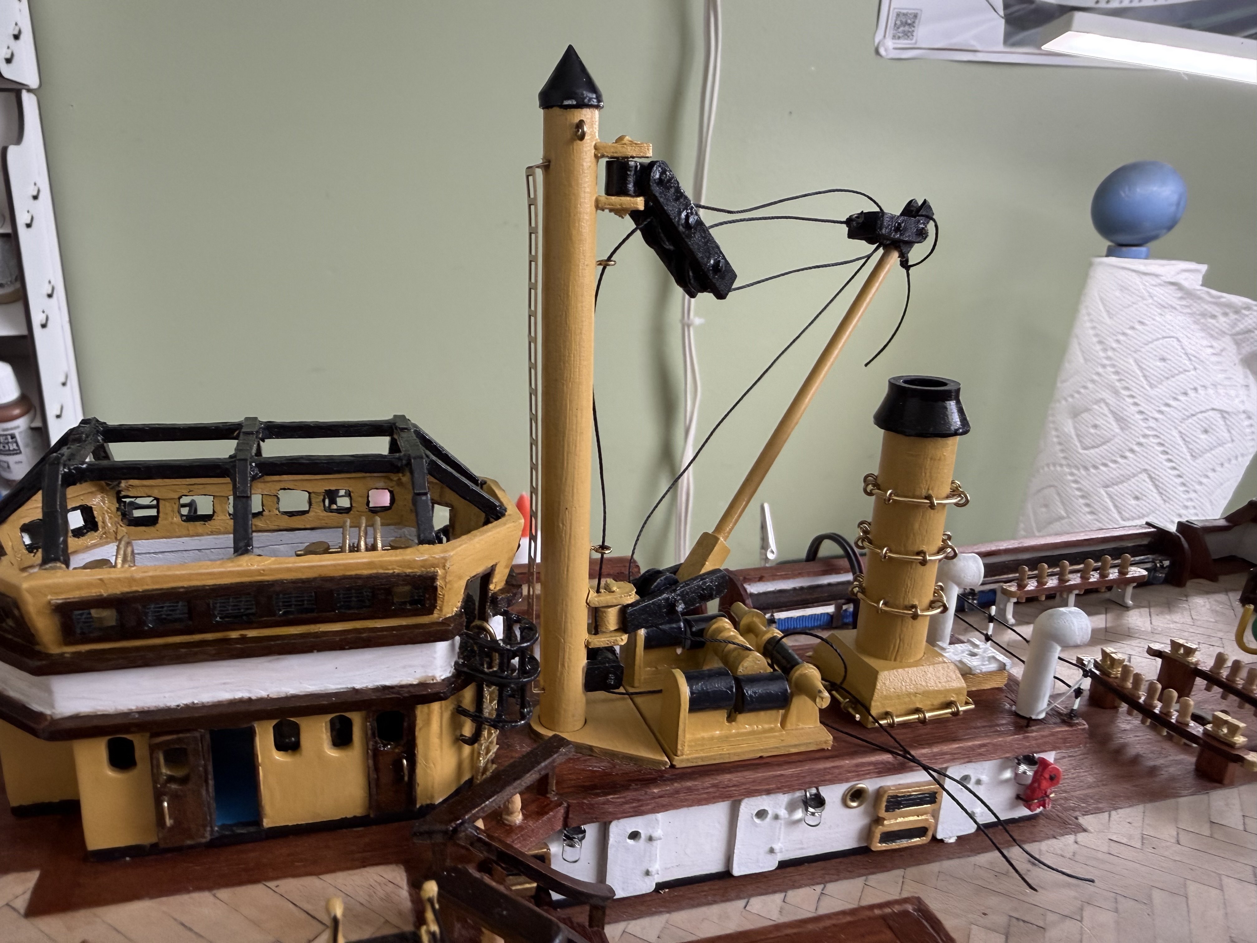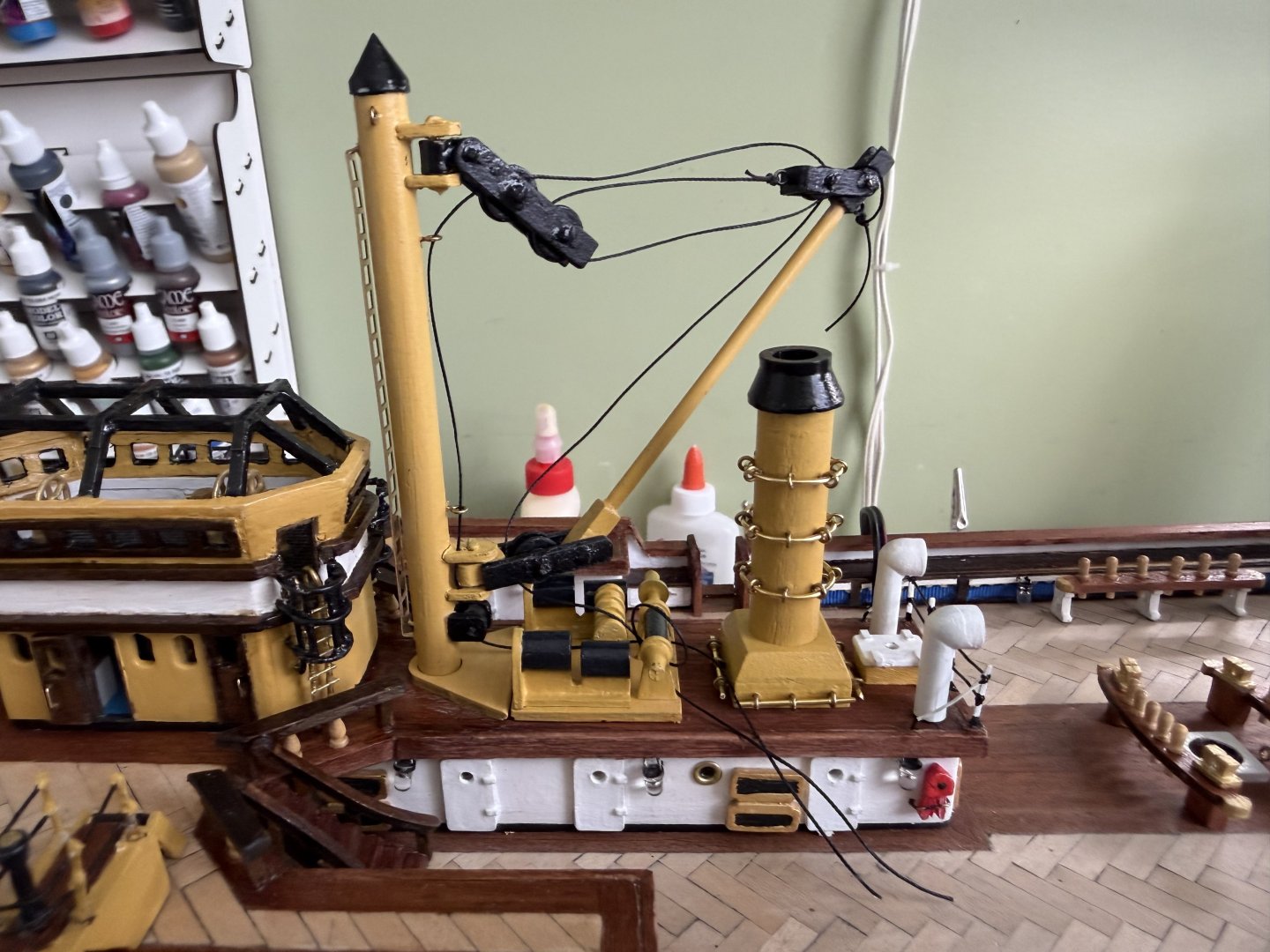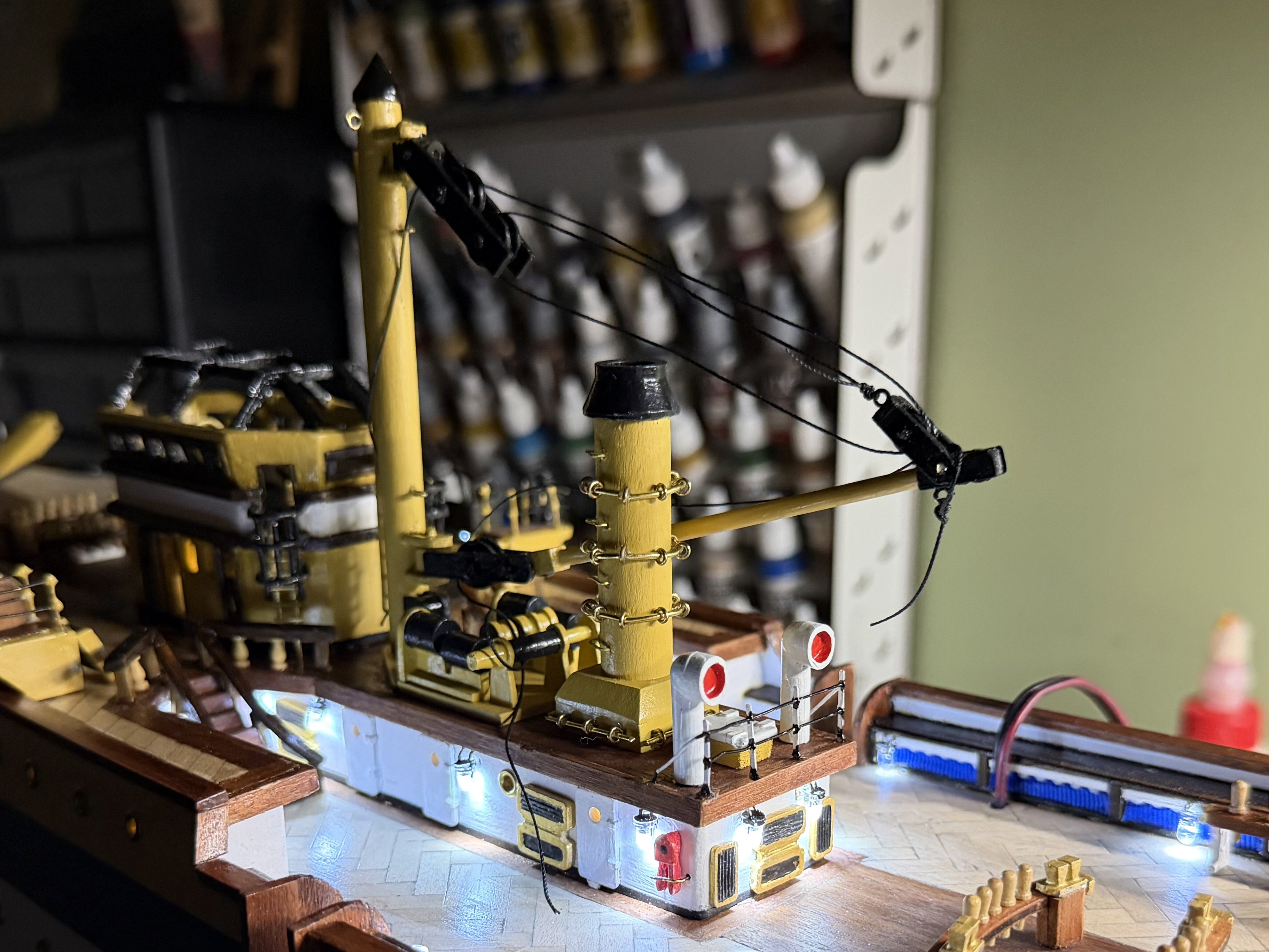 Back to the shipyard now. Hope all had a nice Christmas. Got a bit more time to work on my AV during the holidays then I originally thought I would. Spent most of the time working on the mid deck area. This included the main crane, the motors that operate the crane, the smoke stack, and a couple funnels. DanielD did a fantastic job on this part of his ship especially the crane hardware and the motors. I use his build as inspiration but my abilities fall short of what he did. My goal is to land somewhere between the OcCre instructions and what Daniel did.