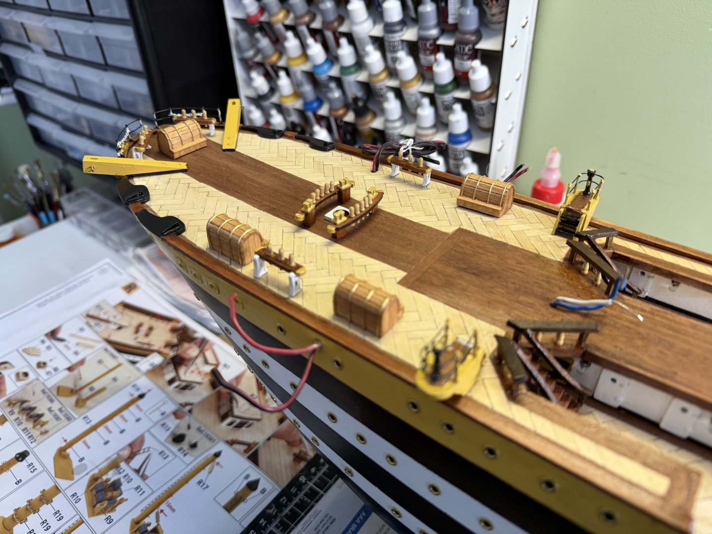 2. A little slow but steady progress since last update. I now have all 4 staircases installed. I have the 4 raised watch platforms with ladders I made to replace the ones provided in the kit. I also have made the 6 storage chests, 2 with bench seats. Reinforcement bands placed around them as on the actual ship.