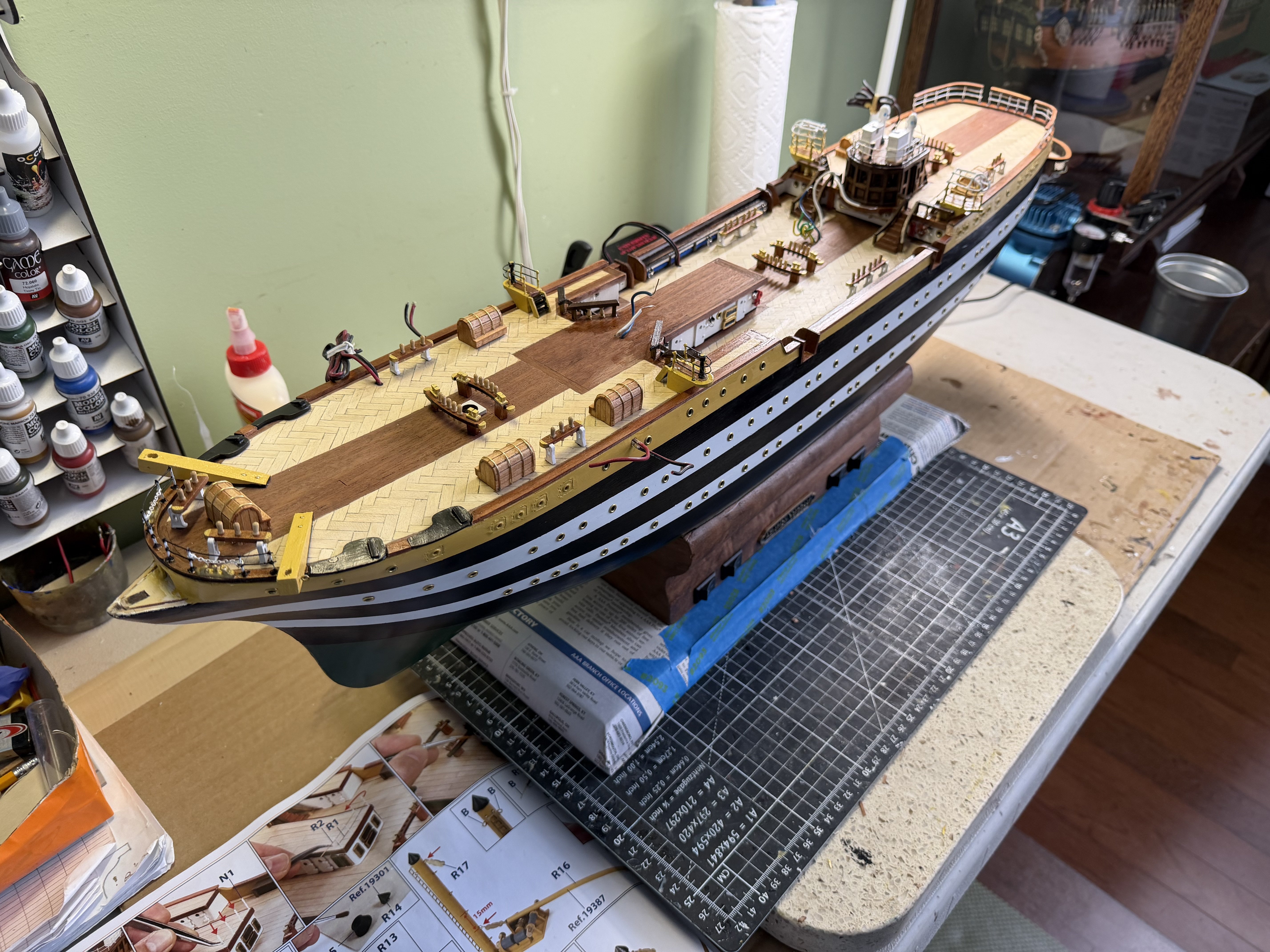 16. Yeah I followed your advice to do that from reading your build. I must not have gotten a good coat on that back inch or two on the stern deck area. I thought about overlaying the deck planks with another layer in that section but think it might show that slight edge difference. Will decide if it matters to me that much.