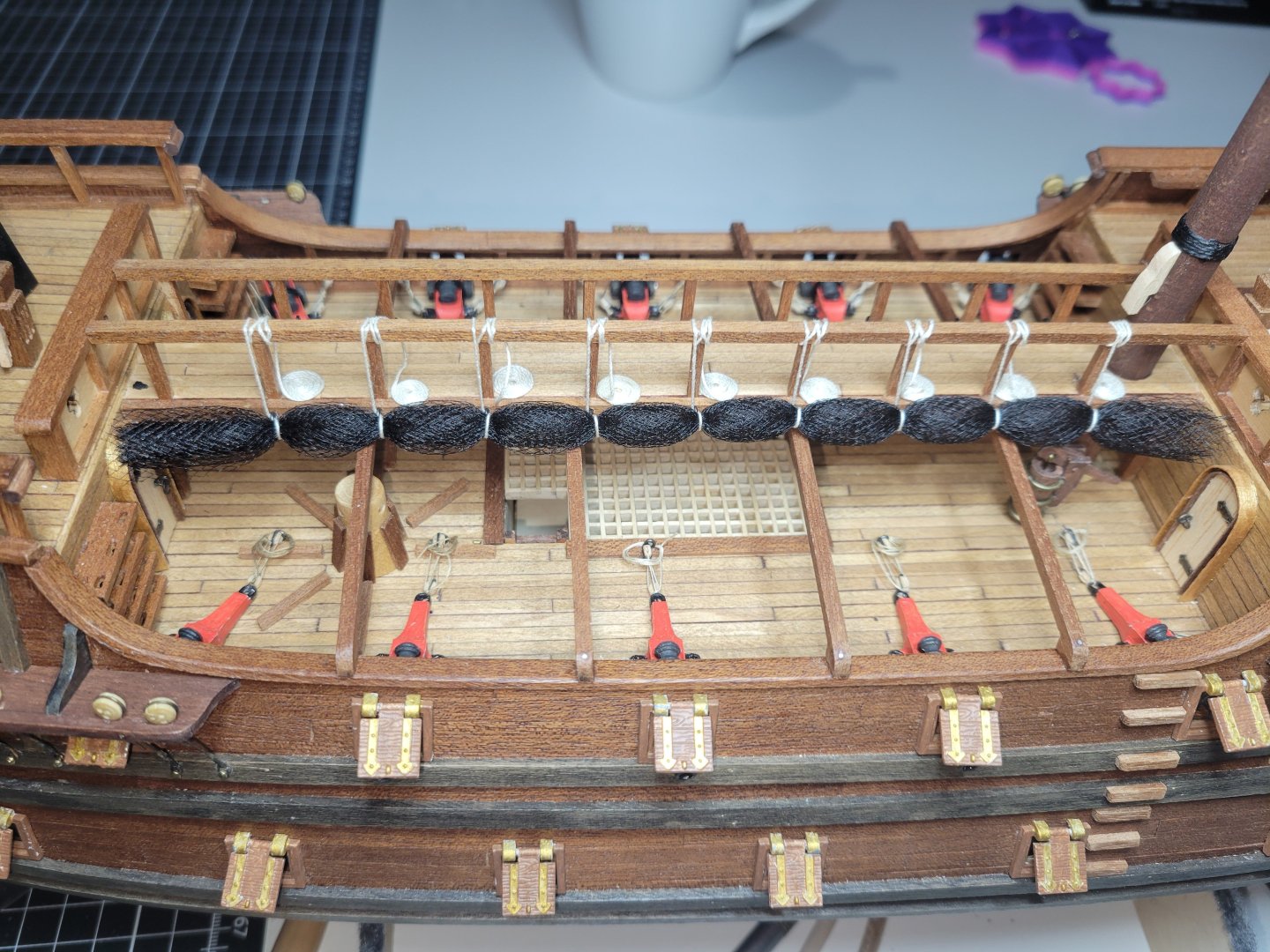 Ot much available on these nettings/grattings over the gun deck so I'm just going with what makes sense from my own time handling the lines in the navy (granted a modern destroyer is a bit different than a 17th century spanish galleon!). I figured there would be people "rolling/gathering" the netting from the gun deck and a second team on the walkway above hauling in on the lines. Once in place they would probably just lash those lines right to the rail with a good ole clove hitch and then coiled on/near the rail. The mesh netting from Occre was not properly sized (not long enough) and a bit rigid so I replaced with tule fabric which has a smaller grid which fits the scale better and just looks more natural.