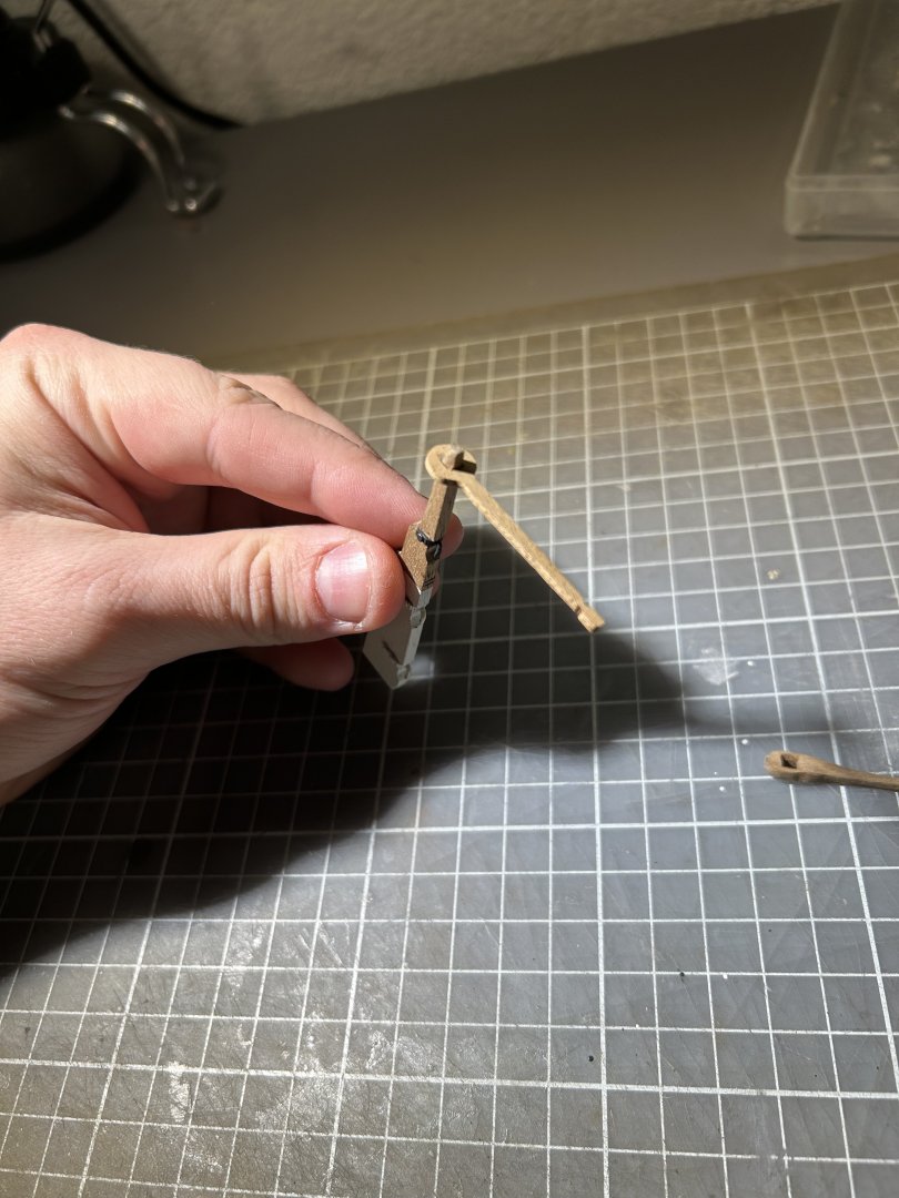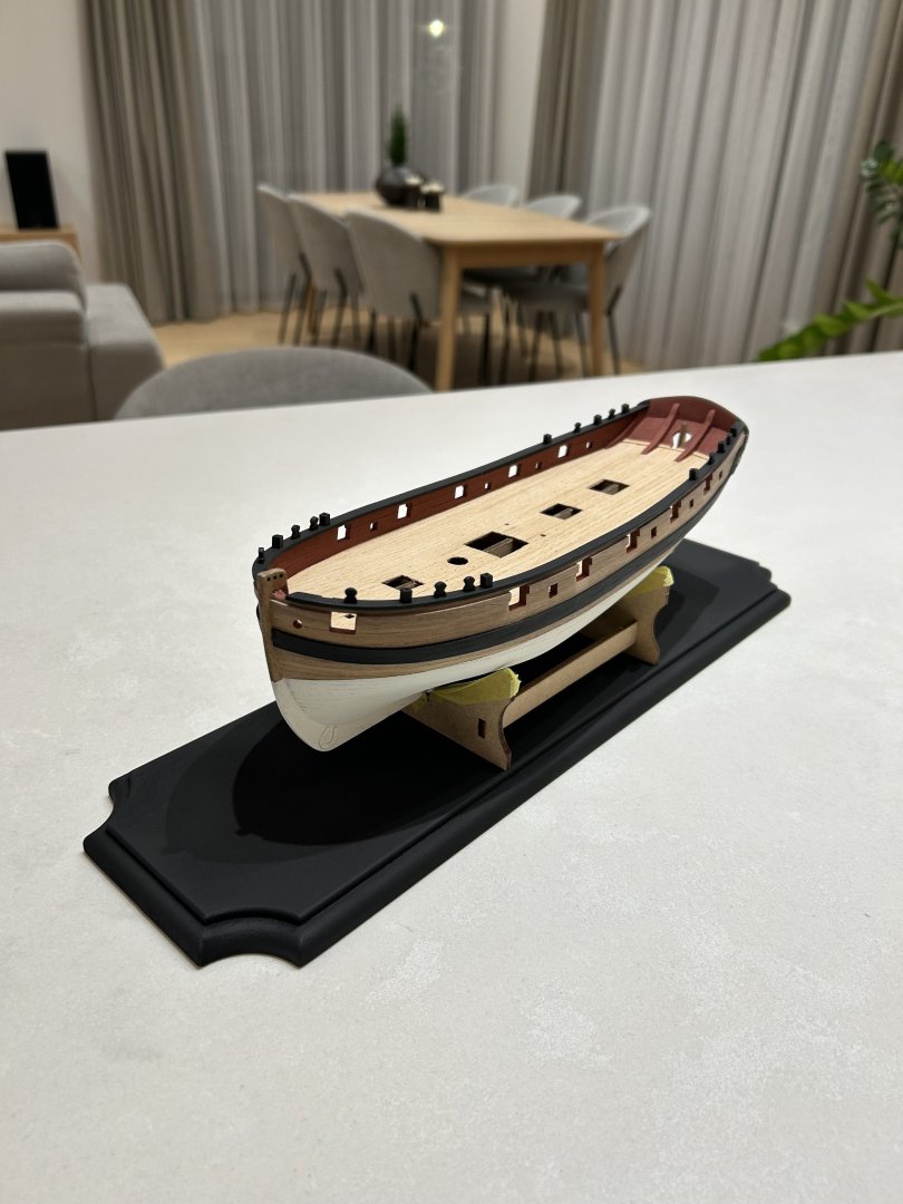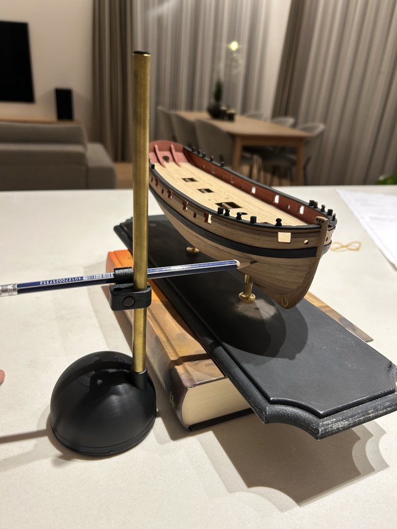 Hull was painted white. Base board was sanded and repainted in black I will eye into buying / making small drill press. It is very hard to manually drill straight holes with very high accuracy: