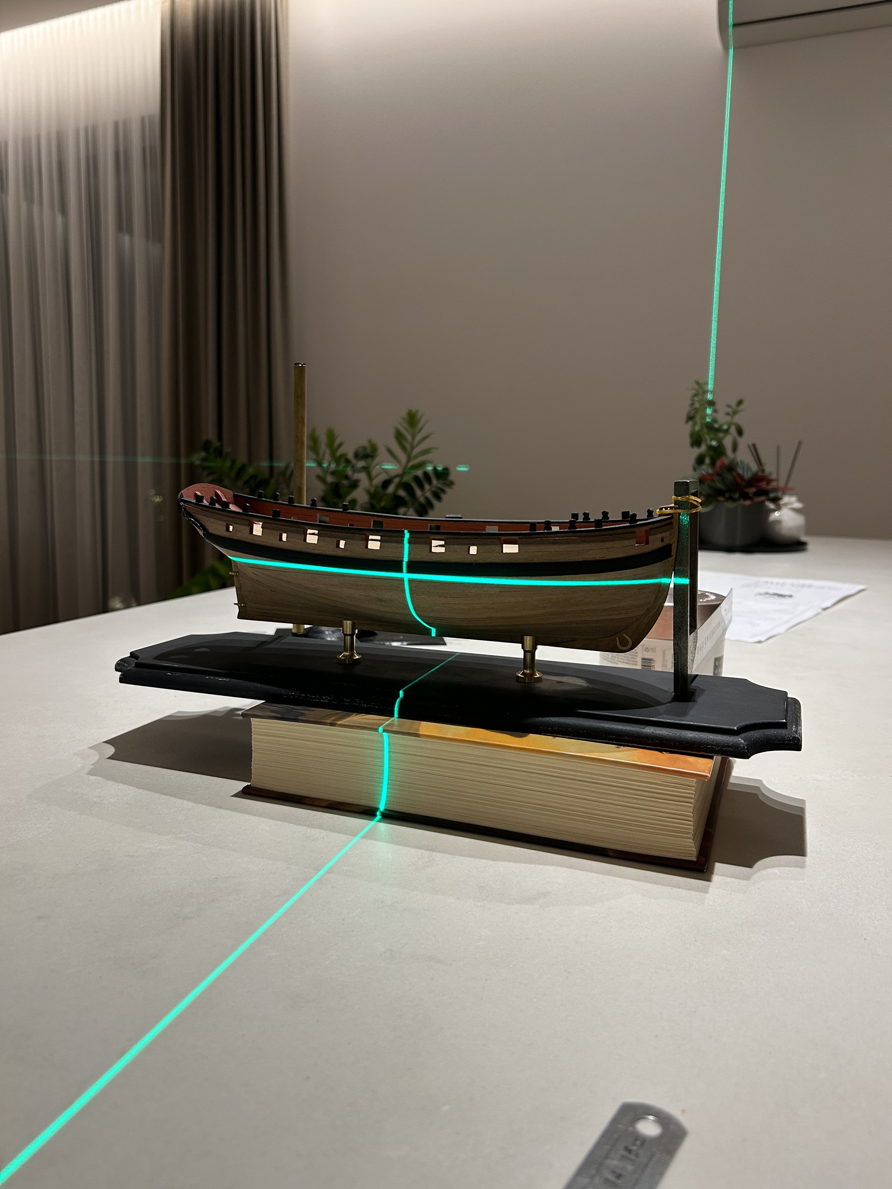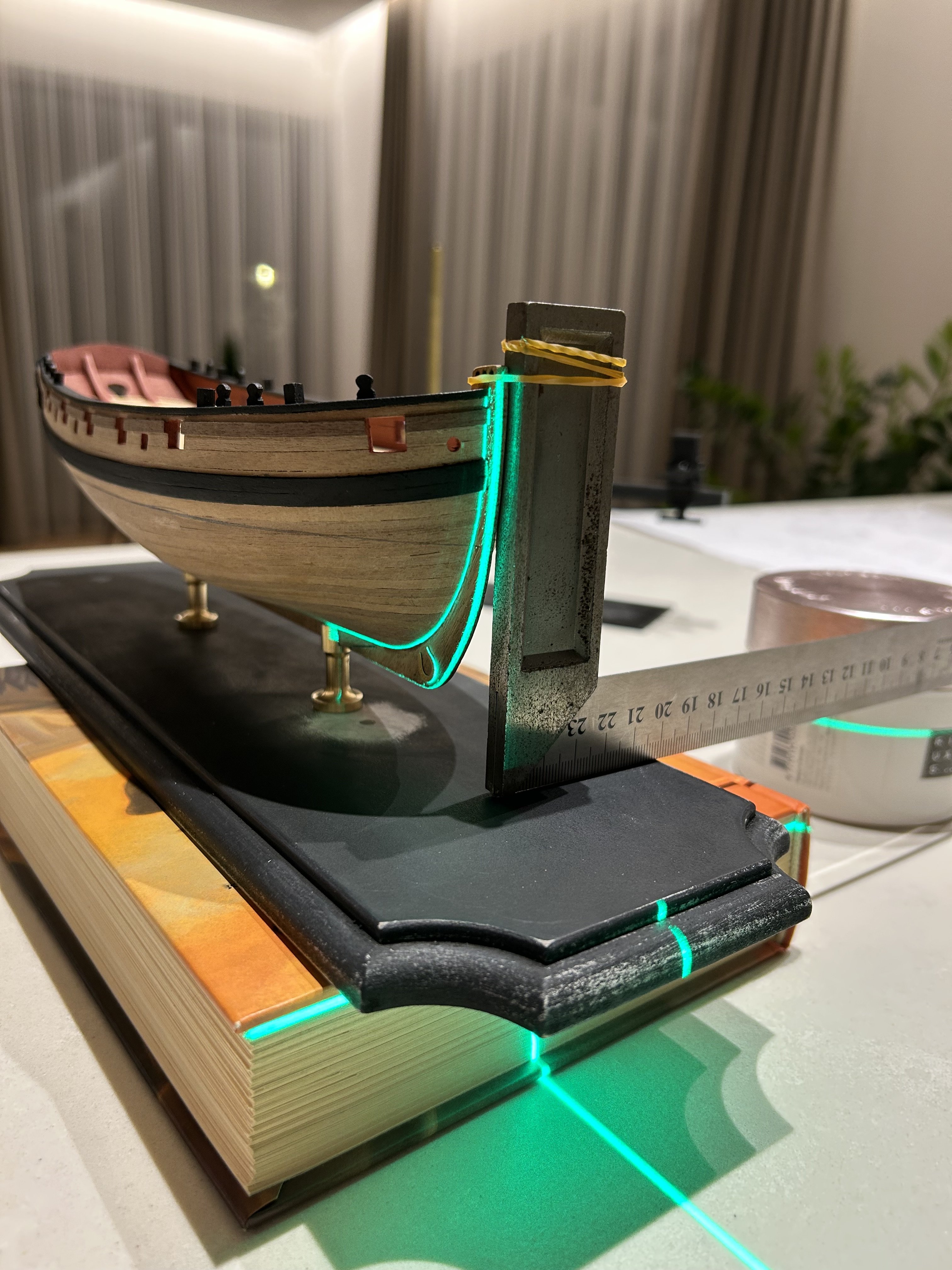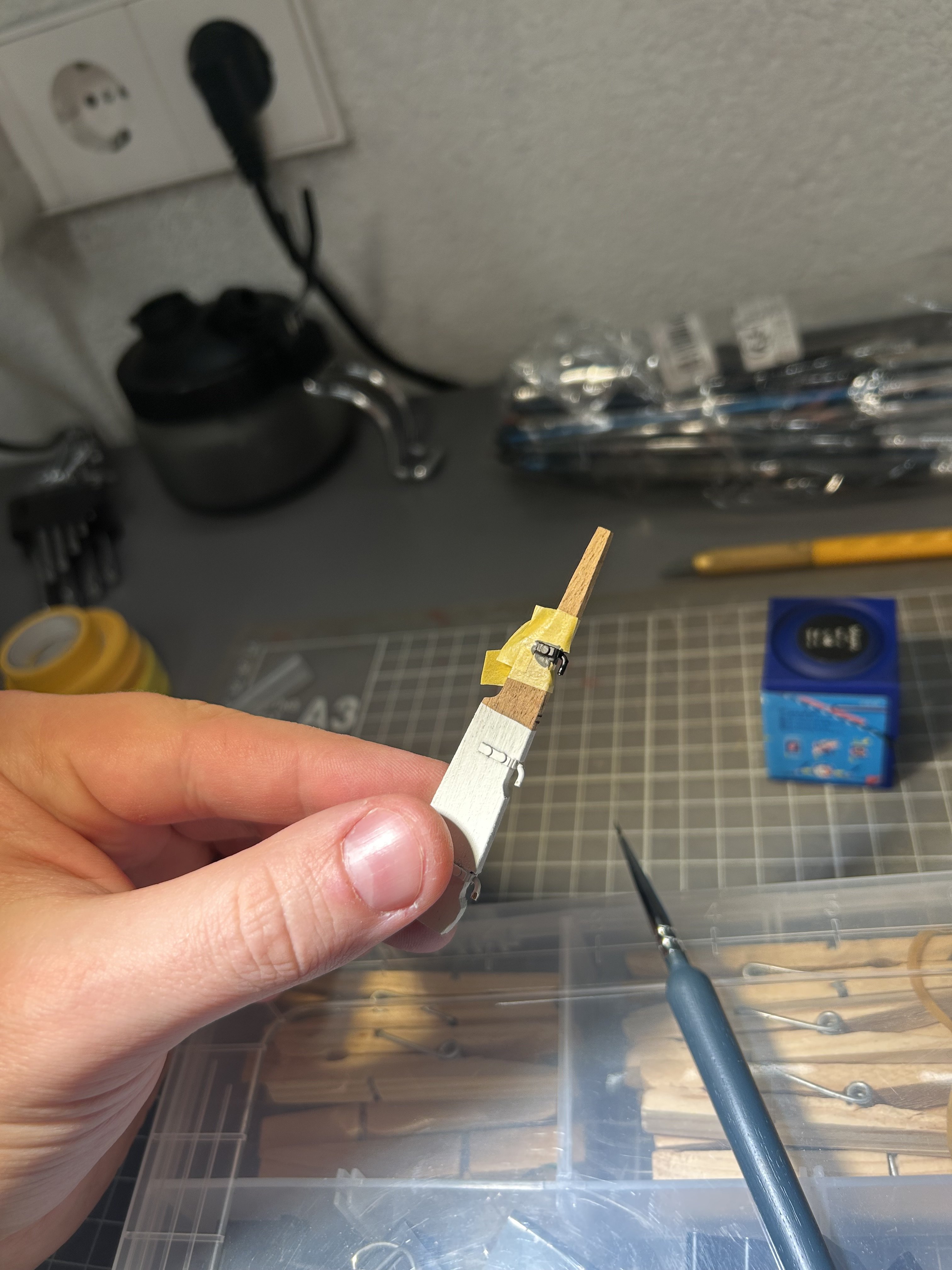 I have drilled holes for M4 screws in the keel and in the base board. I have also sanded the base board. Will paint it the second time. One reason would be to try to get a nicer finish, another reason would be because I drilled the second hole in the wrong place 😆 to fix that I have filled the hole with a wood dowel, added some wood putty.