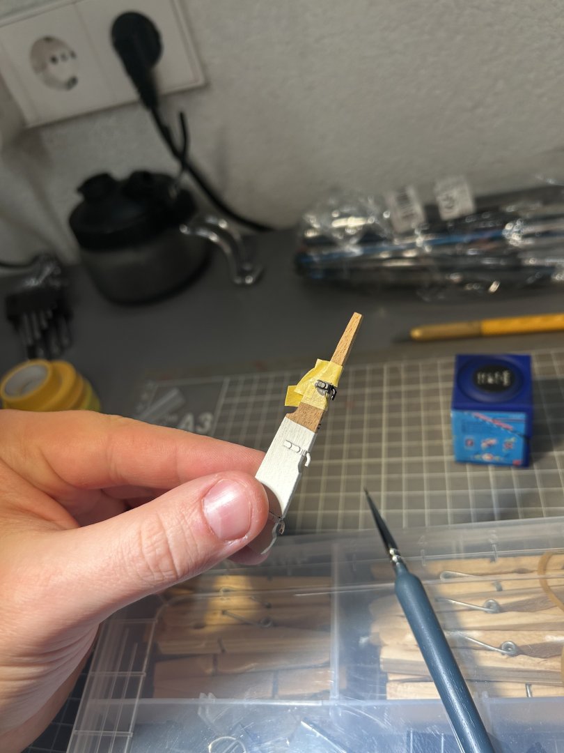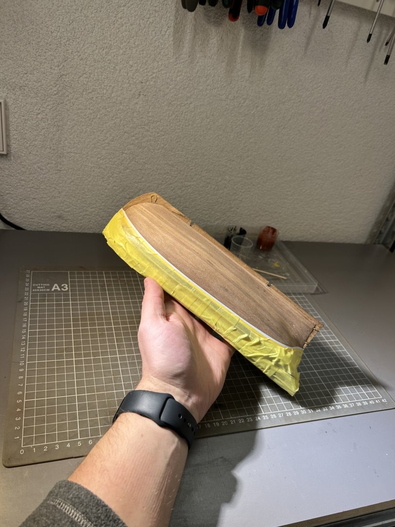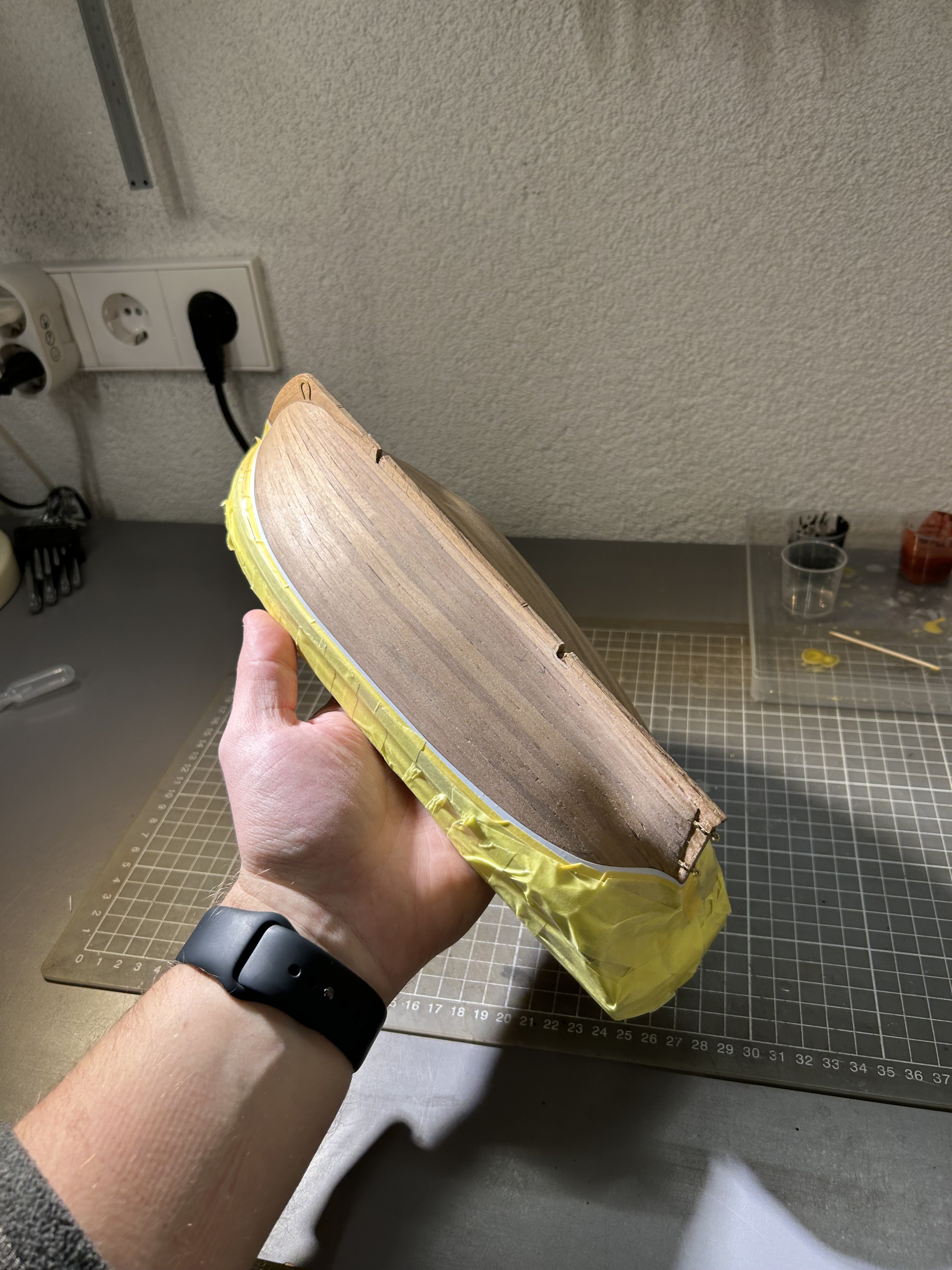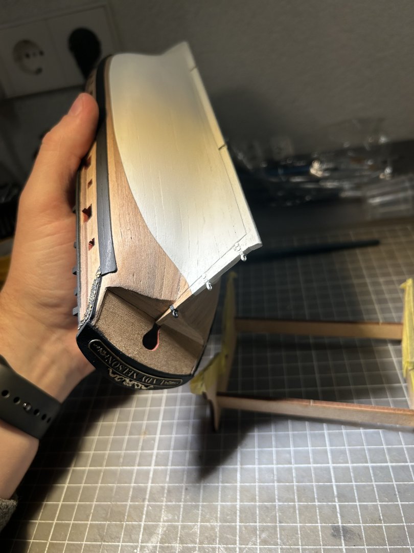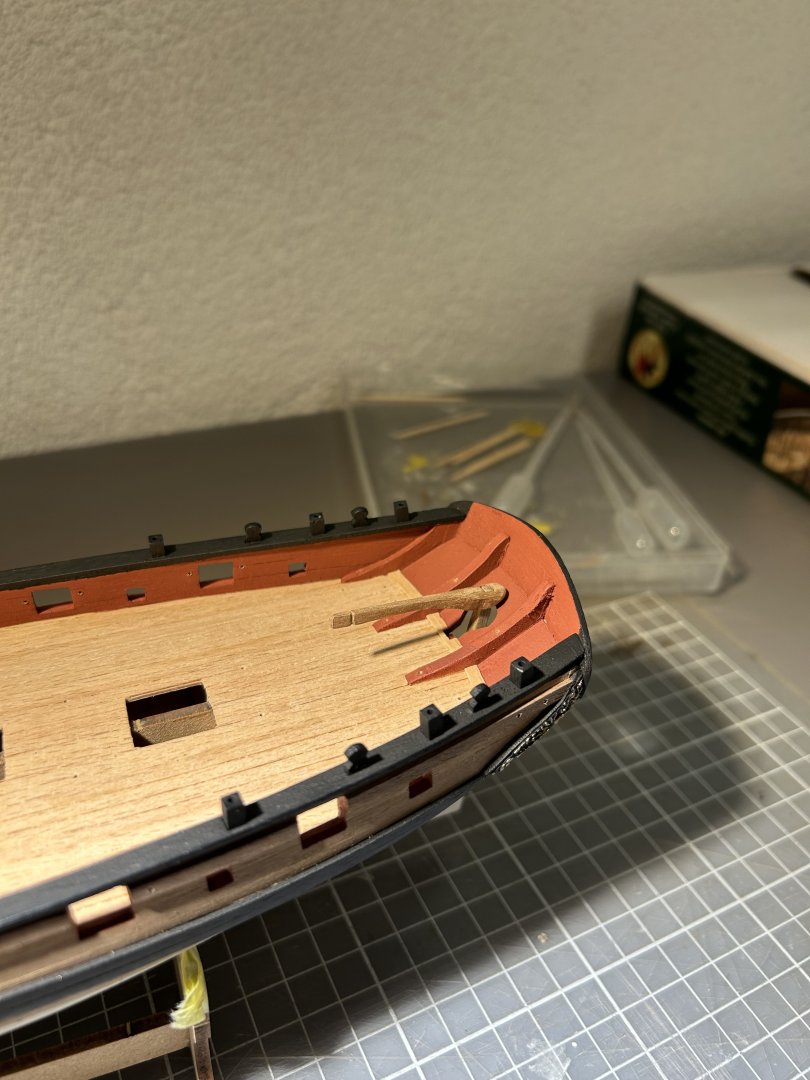 I have prepared ship for bulwarks painting… but after testing the red that I have bought it turns out it is way too bright. I have ordered a new more suitable (hopefully) Revel aqua color 37 reddish brown. If this will not look good enough I will be mixing my own.