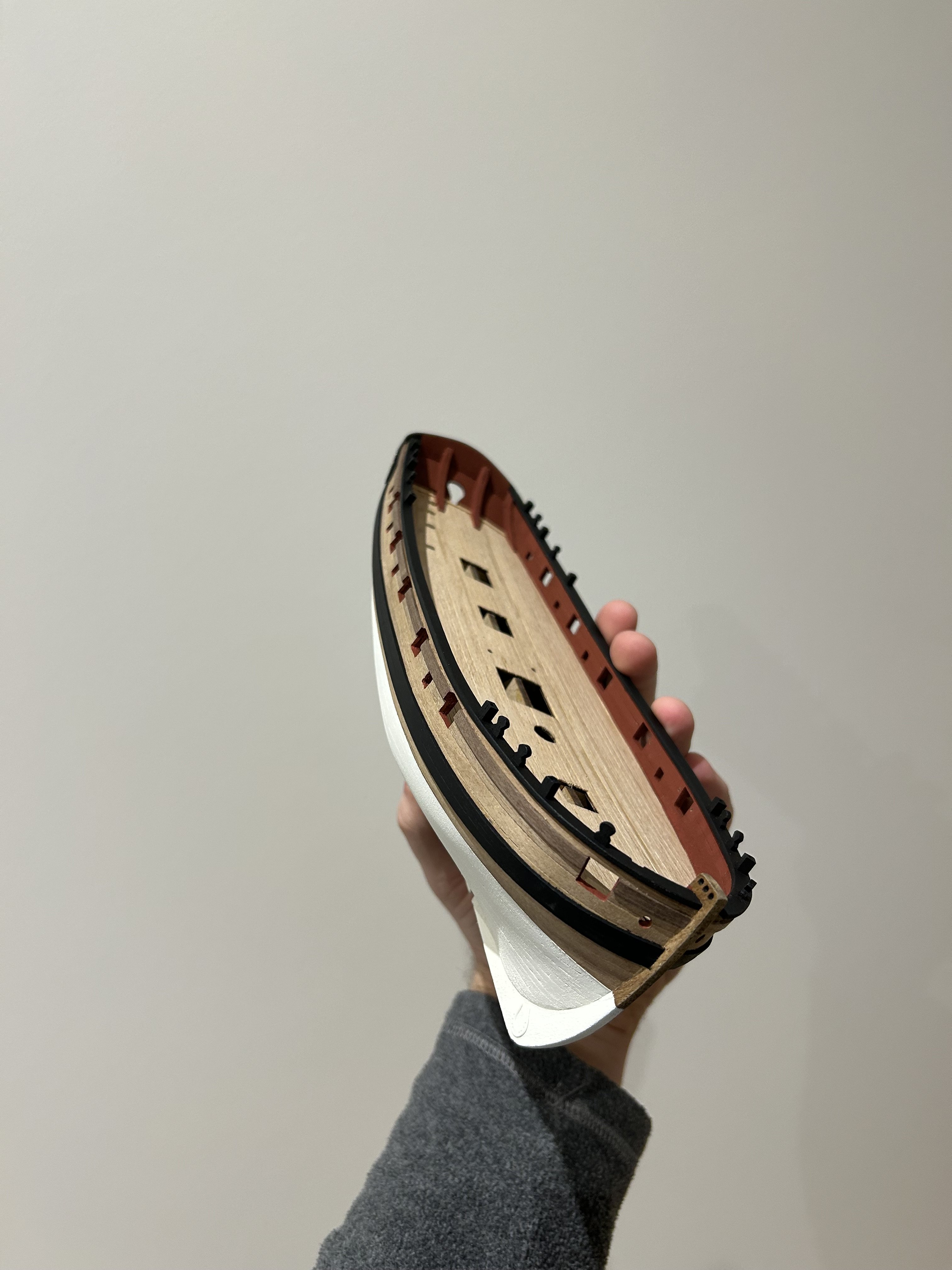 Prepared my spray “booth” and started spraying. Revel aqual color looks really great on wood when sprayed through the airbrush. Wood texture remains very visible and no “plastic” effect. Also I love these black details on the ship!