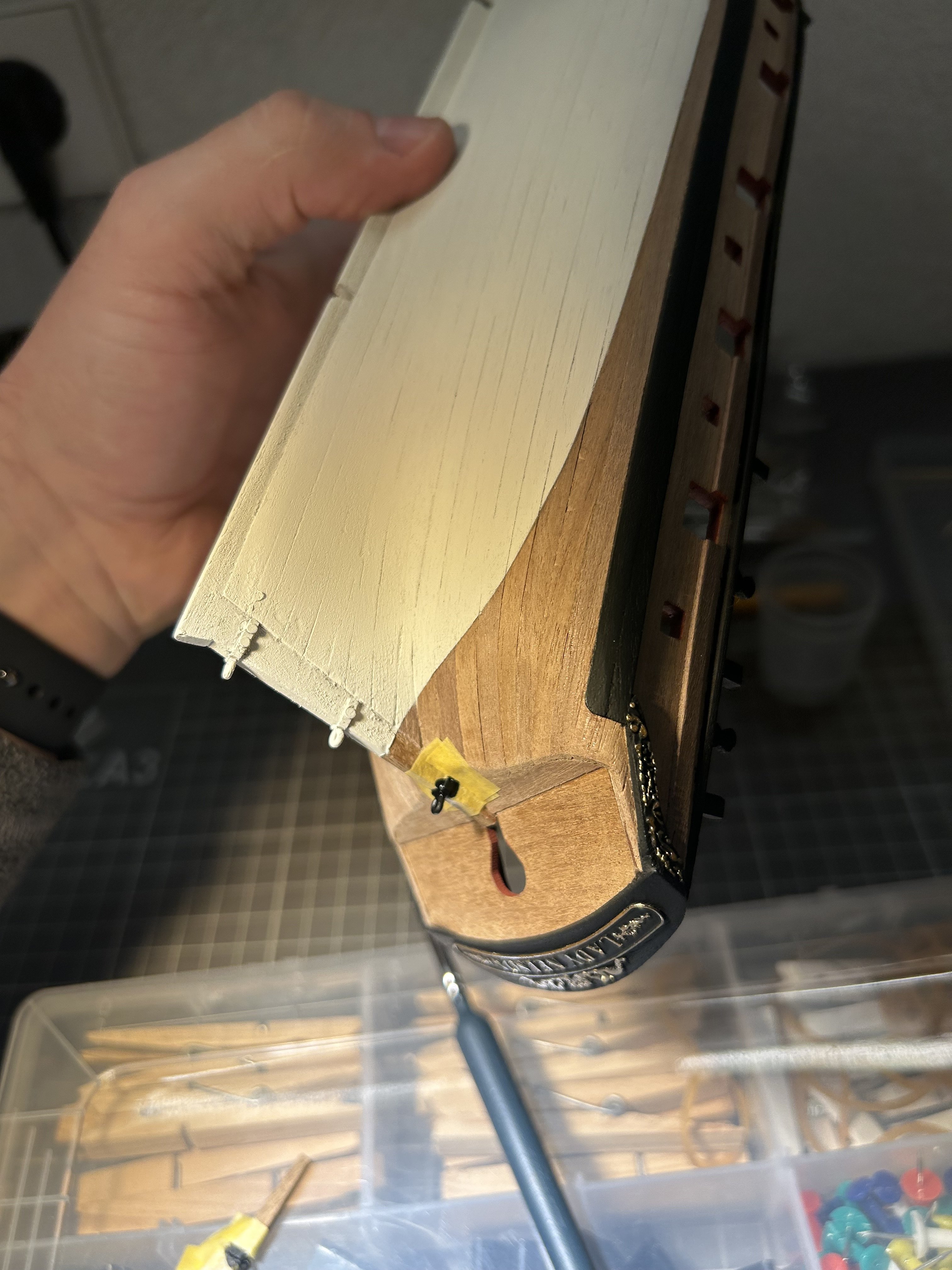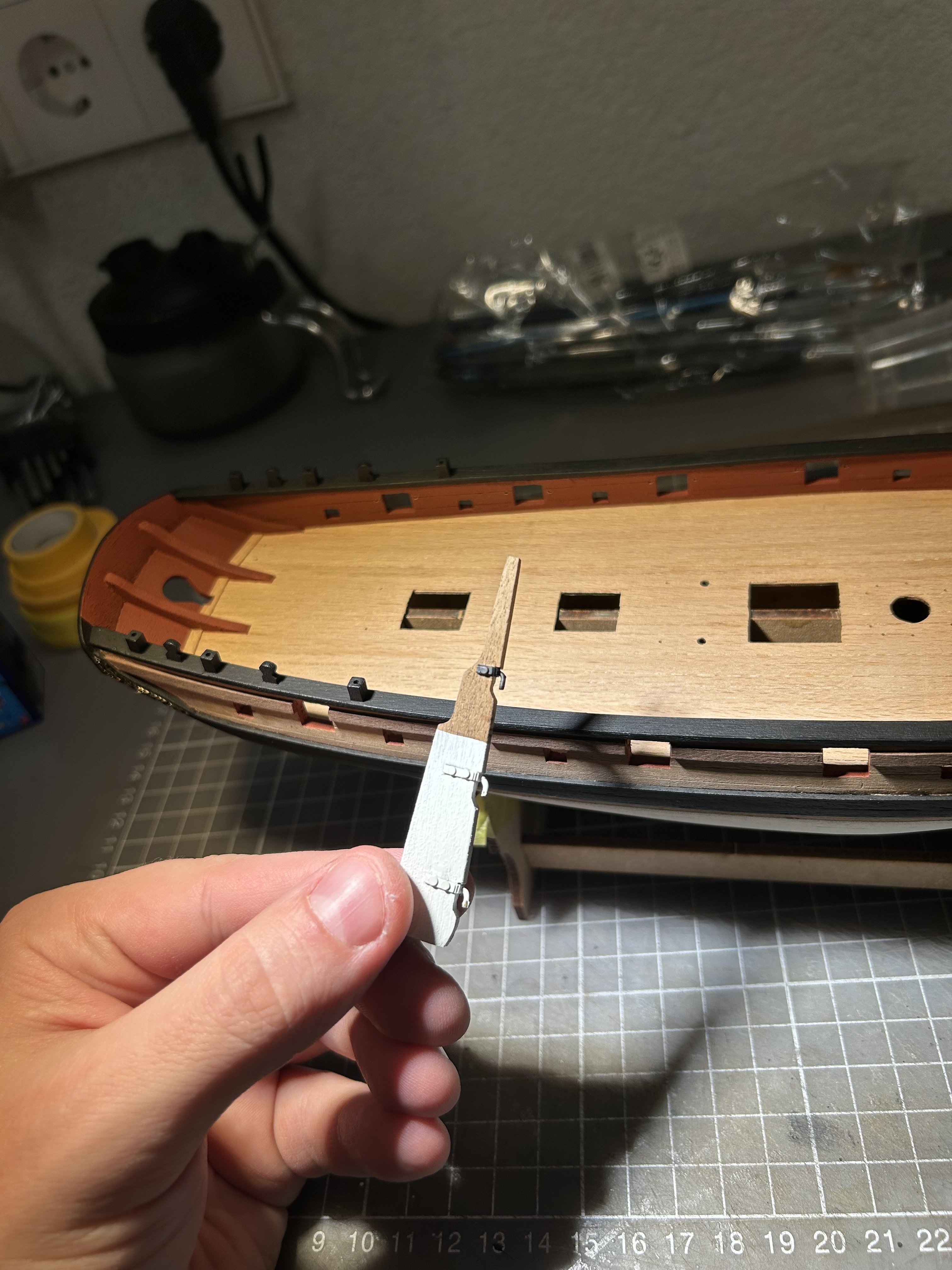 I have finished drilling all holes for eyelets. Painted brass rudder holders black. I have also made a custom rudder part based on some other build logs. Custom one looks way way better.