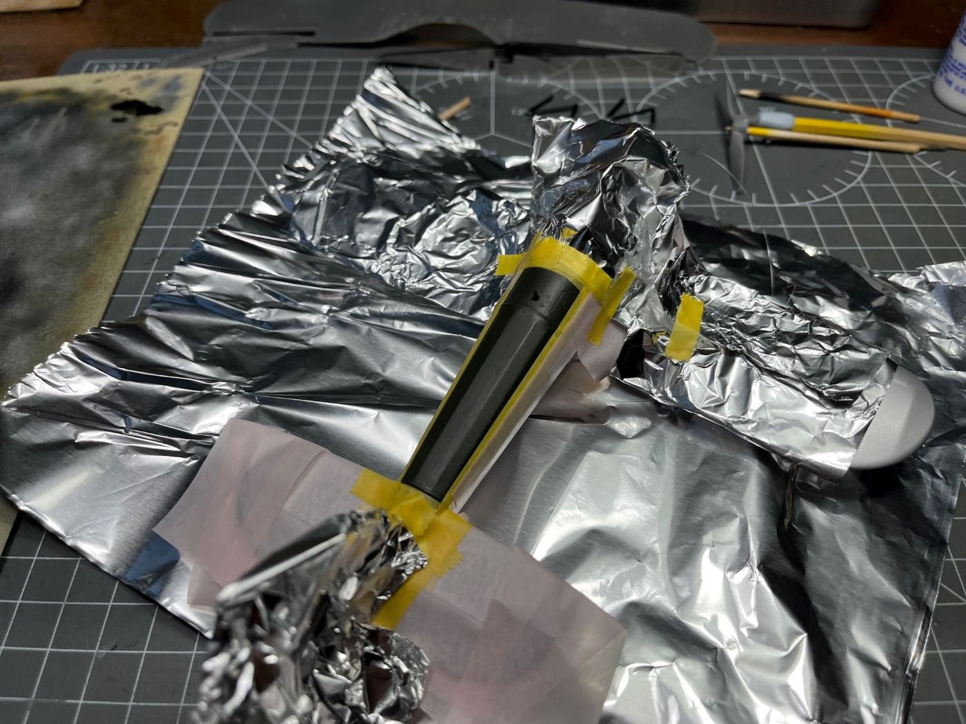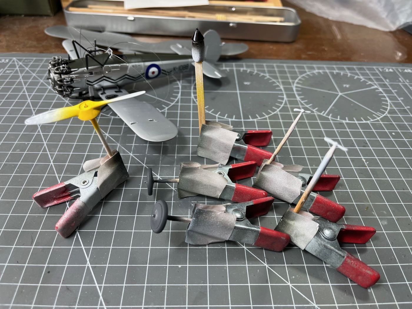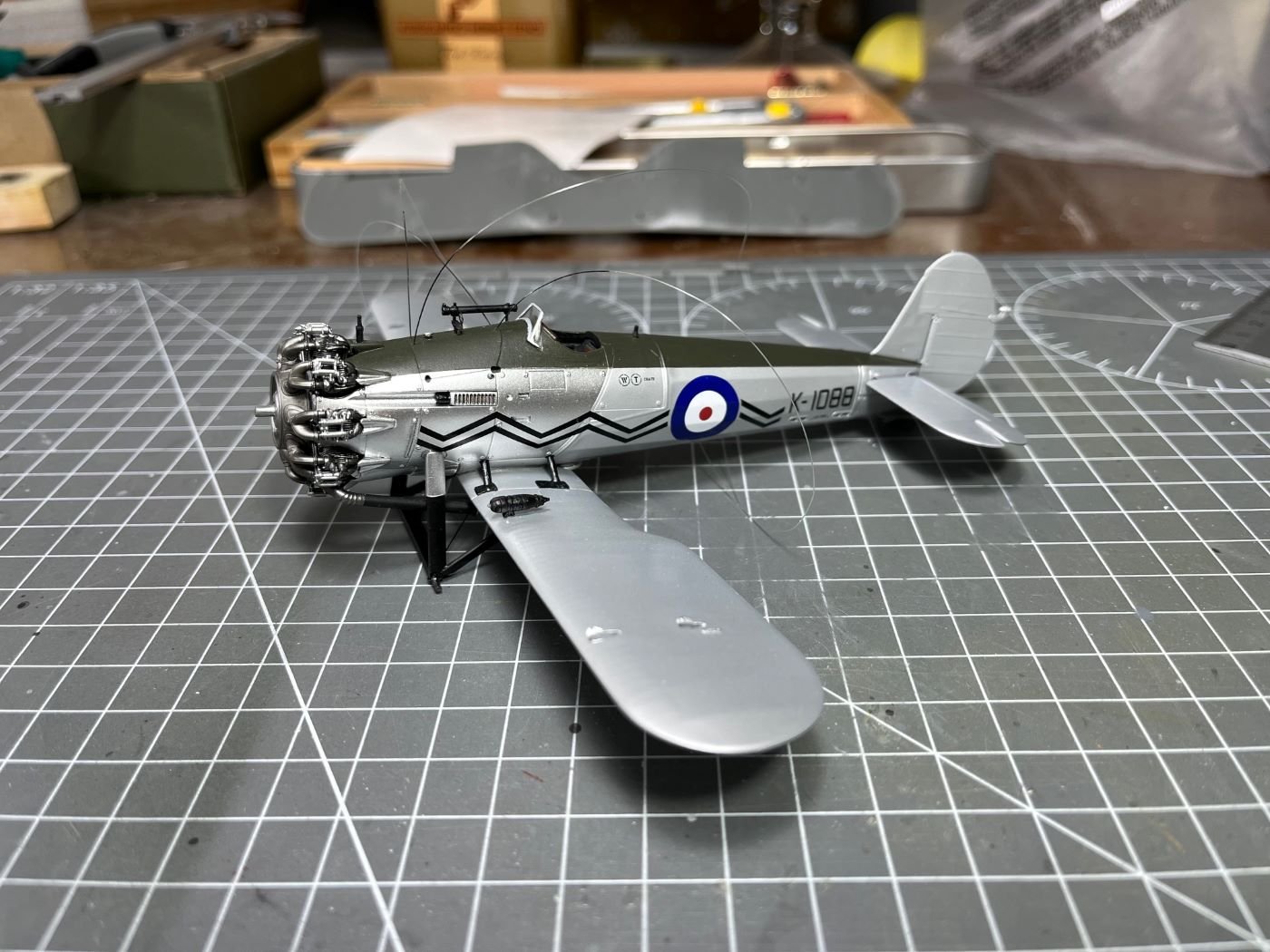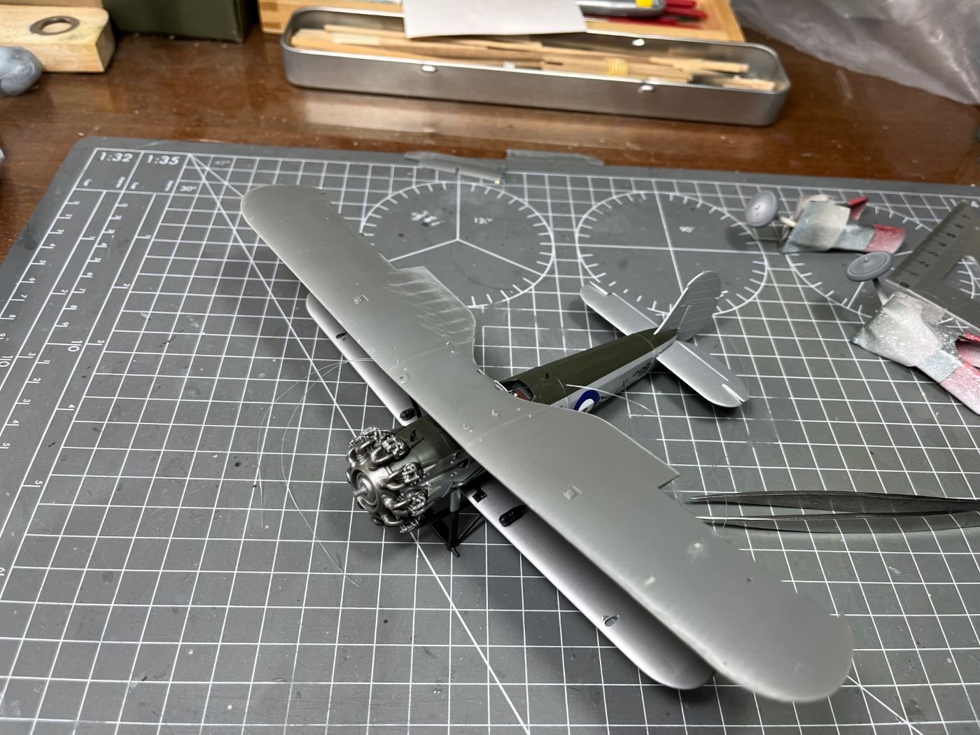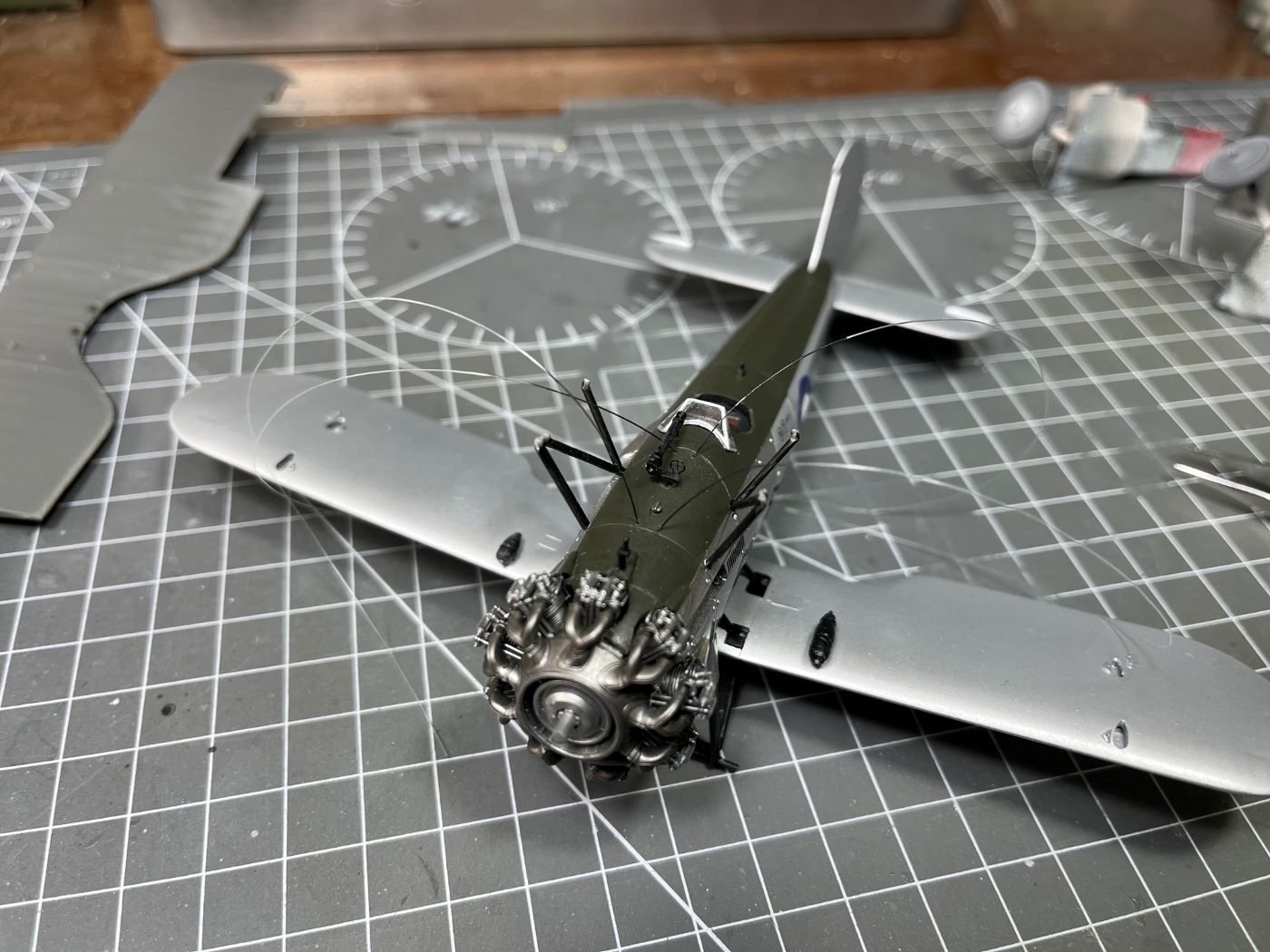 Hi Mike, thanks for your feedback! Indeed, as I wrote in one of the early posts, this model obliged me to follow a less straightforward build sequence due to its configuration. In this case, what I did is: - Spray the portions finished with the aluminium dope; coat with X-22 gloss for protection; mask these parts; - Spray the cowlings with chrome silver; coat with X-22 gloss for protection; - Mask the the area for the matt green and spray the anti-glare green (note that I usually add some drops of X-22 to Tamiya matt paints, how much? I go by eye, say for ten parts of matt paint, 3 parts of gloss (*)). At this point, when I remove the last masking, the surfaces have the right final finishes. However, as I said in my posts, I had few times the need to repair here and there the paints and this adds more complication with additional partial masking, etc. This is the point where I am at present. Now, before putting on the top wing, I will complete the decals for the fuselage and the lower wing and I will seal the decals with additional X-22. This might require to mask the green area, but without the the top wing and the rigging in place, this should not be a major problem. Note: sealing the decals might not be strictly necessary if I don't apply panel liners or oil colors, which might be well the case for this build, I have not made up my mind yet. Then the top wing, already painted, will follow and necessary touch-ups (these will be necessary because of the way I will rig it, i.e. some of the wires will go through the wing and will be glued from above; then some local sanding and painting will hide the wire attachments). Decals and top coat will follow. In a sketchy way, this is the plan. I don't claim that this is the best way, but it is what I have in mind. (*) I always since ever add some X-22 to Tamiya matt paints because these have otherwise a chalky finish and they become slightly more robust to touch and wear. Best regards, Dan -