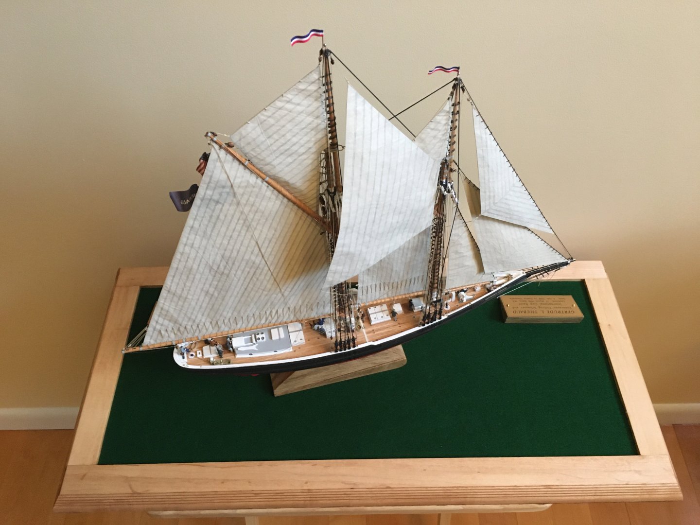 Glad to see you are still checking this site. I was just hoping to see someone else's work for inspiration on this build. I've made progress, slow at times, and am now working on the running rigging. I finally chose to use paper / silkspan for the sails after making a set of Jumbo, Jib and Balloon Jib out of cloth. I've set the Jumbo and Jib, now starting on the Balloon Jib. These are just some photos of the work in progress...any tips or photos that you'd like to share?