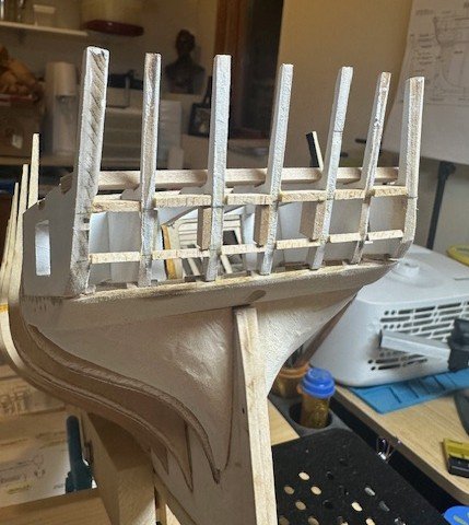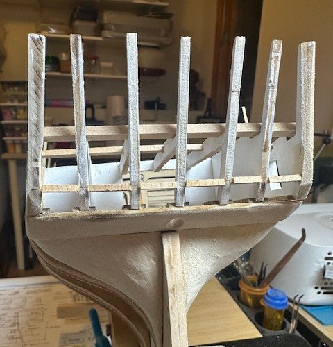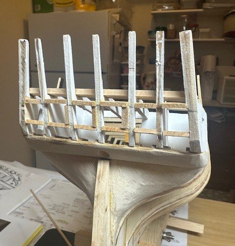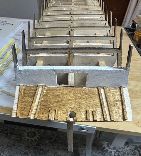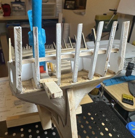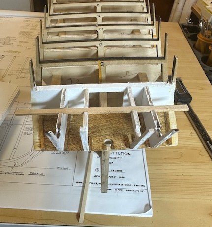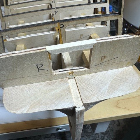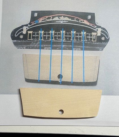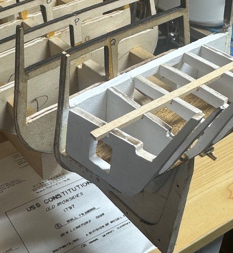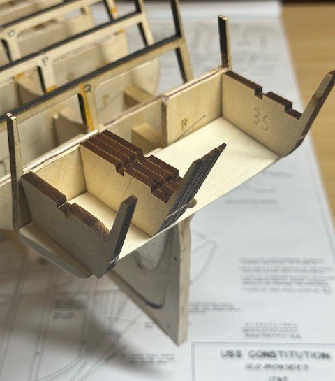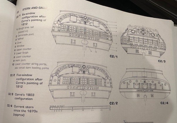 Wow, it has been a full two months since my last update! It’s been a busy (and honestly frustrating “ship building-wise”) couple of months that I will get into briefly in a bit. But I also had some really fun times these past few months, enjoying some fun Parents’ Weekend festivities with our college granddaughter and her parents (our son) and rest of family. My son and I also went to an NFL game while they were in town. But the really important model ship-related news is that my wife and I took a fairly brief (5 days) trip to Boston and, yes, I got on the USS Constitution! I will maybe post a few more details of that trip in a separate post with a few of my favorite pictures. The Constitution visit, though, was a bit disappointing in that it had rained overnight and was a bit misty in the morning, so they had a lot of the spar deck details covered with tarps. But I was able to take pictures on the spar deck and gun deck of what I could see and we definitely enjoyed our time on the iconic ship and toured the museum, as well. With all that said, it’s now time for an update on my build log. And thanks to Mustafa for noticing my extended absence and asking me on his own build log how I was doing. Appreciate the concern and follow-up, my friend! So, it’s time to make decisions about the stern configuration. I have said several times that my goal has been to build this ship as an “1812-ish” version of the Constitution. In reading up on the history and seeing several adaptations in Michele Felice Cornè’s paintings, I decided to give his 1812 six-window configuration a shot. Some of the various stern configurations are shown in the Anatomy of the Ship book. Let’s first see how all of the kit-provided stern frames look as they are positioned on the counter block. As others have noted, there were some subtle shape differences between the six provided frame pieces. The fantastic builders who have done detailed gun decks have also taken different approaches to how the Commodore’s aft cabin (and the port and starboard staterooms) would be displayed, if at all. If there is going to be any visual presentation of the aft cabin, whether from the exposed spar deck or from the stern windows, some alterations to the kit-provided center stern frames were going to be necessary. And, of course, with the alteration in the number of stern windows I had decided to include vs. the kit’s 3-window configuration, I was going to need to add some stern frames to help support the additional windows. So, using the kit-provided stern frames as a template, I cut some new stern frames that would allow for the appearance of an open Commodore’s aft cabin, if visible. When duplicating these new stern frames, I left some additional frame piece at the base of the frame in order to fit it into the counter block (more on that in a bit), as well as an extension (just in case, for fitting) of the horizontal piece that goes back to Bulkhead R, which will be the wall separating the Commodore’s forward and aft cabin areas. On the two outside stern frame #3 pieces, I milled openings to display the access from the respective staterooms out to the bath and lavatory areas in the quarter galleries. (As I look at these openings now, I may not have cut them quite large enough, but I’ll assess that again soon.) As a part of my research, I learned that Issac Hull’s crew that had won the battle against HMS Guerriere presented him with a model of the USS Constitution as a gift. That model has been on display at the Peabody Essex Museum in Salem, MA. This battle took place in August 1812, so that’s a good date for me to use as a guide for the stern configuration. Also, as a part of the stern configuration and the exposed gun deck, I needed to cut out the “bump-out” section of the Commodore’s aft cabin where the lounge chair sits. After cutting it out, I replaced the support beam with a nice solid piece of wood. OK, now a brief discussion on my latest trial-and-error failure. I indicated earlier that I had made the “legs” of the new stern frames a bit longer so they would fit into notches I would make into the counter block. This would help in securing the stern frames more securely, right? Here’s the mill work I did in creating those notches. Yeah, this did not go well. The stern frames fit poorly and it was going to be even more difficult to make all of the joined pieces… the stern frames, the altered counter block, and the filler blocks… look right. So, I decided to discard the now-mutilated counter block and make a new counter block. I will now simply securely glue the stern frames (without the extra length at the base) to the counter block. With some calculations and measuring, I determined where the stern frames would be placed so that the six-window configuration would fit properly. As a few other prior builders had done, though, I did affix some support tracks to the counter block to provide additional strength and support to the stern frames. As the new stern frames were placed and secured, I also began working on shaping and securing the two deck beams at the rear of the spar deck level. With the stern frames now securely in position, it was time to begin the window framing. Using a “sized-to-actual” picture of the stern area and some cut-up mockups, I determined the size of the six windows to be 11.24mm square, or 7/16” square. I cut a spacer block to assist with the remainder of the frames' positioning. The bottom of the windows will sit 1/4” above the gun deck counter block, just a touch above the knuckle line. I then measured and cut the bottom frame pieces and, using a spacer, I secured the bottom window frames. Then, using the spacer cut to the size of the windows, I cut and placed the top frame pieces and then added vertical frame pieces where needed and in the width needed for each of the six 2x2 pane patterns. You can see in the pictures that the window frame pieces sit 