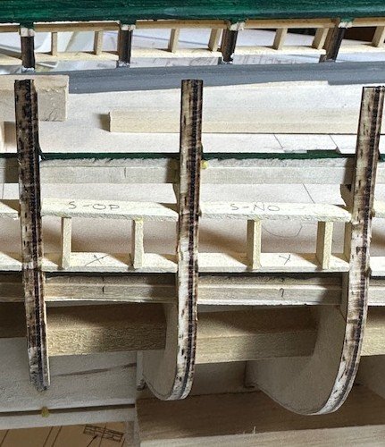 Well, I have (almost) completed the gun deck gunport framework. After my concern and query last week regarding the “fudging” of actual port locations left or right to avoid the bulwark extensions, taking both Jon’s and Peter’s notations about locations, and reviewing the old USN plans that Jon reminded me of (I had recalled seeing those somewhere before, and appreciate the reminder, Jon!), I feel comfortable where I have marked the gunport locations to be. With that said, I began measuring and cutting the individual vertical pieces of each gun port. As others have previously mentioned in their respective build logs, due to the curvature/angle of these bulwark extensions, each of these vertical frame portions needed to be cut in a parallelogram shape. While the angles changed ever so slightly on each gunport, the use of my RP Toolz Mitre Cutter assisted tremendously in knocking these out fairly uniformly, with individual sanding done for each gunport, as needed. Using the 9/16” x 13/32” square gunport spacer jig I mentioned in my earlier post, I set the spacer in the designated marked location and, with a touch of PVA glue on top and bottom, pressed the vertical frame portions against the spacer. Slid the spacer back out and… sweet! A shoutout to my Constitution predecessors for showing me that technique. And, of course, you can see in at least one of the pictures below that I placed an X in the gunport location within the frame, so I don’t mess up and forget which square is which. So, I mentioned above that I have (almost) completed the gun deck gunport framework. I still need to sand all of this framework to bring any rough or excess pieces sticking out to be smooth against the bulwark extensions for planking purposes. I’ll use a combination of my micro sander and sanding sticks, both of various grit levels. Not a big update today but, as always, appreciate the readers, follows, comments and critique.
