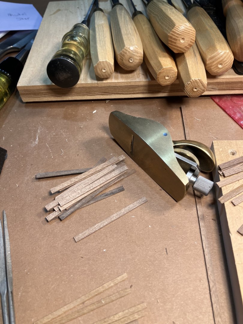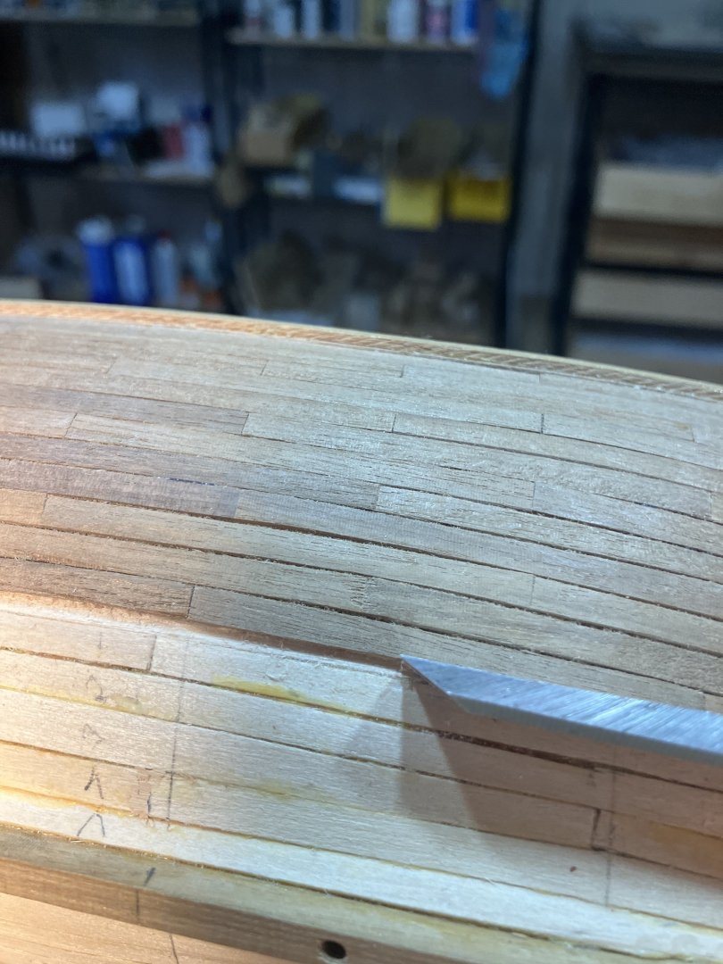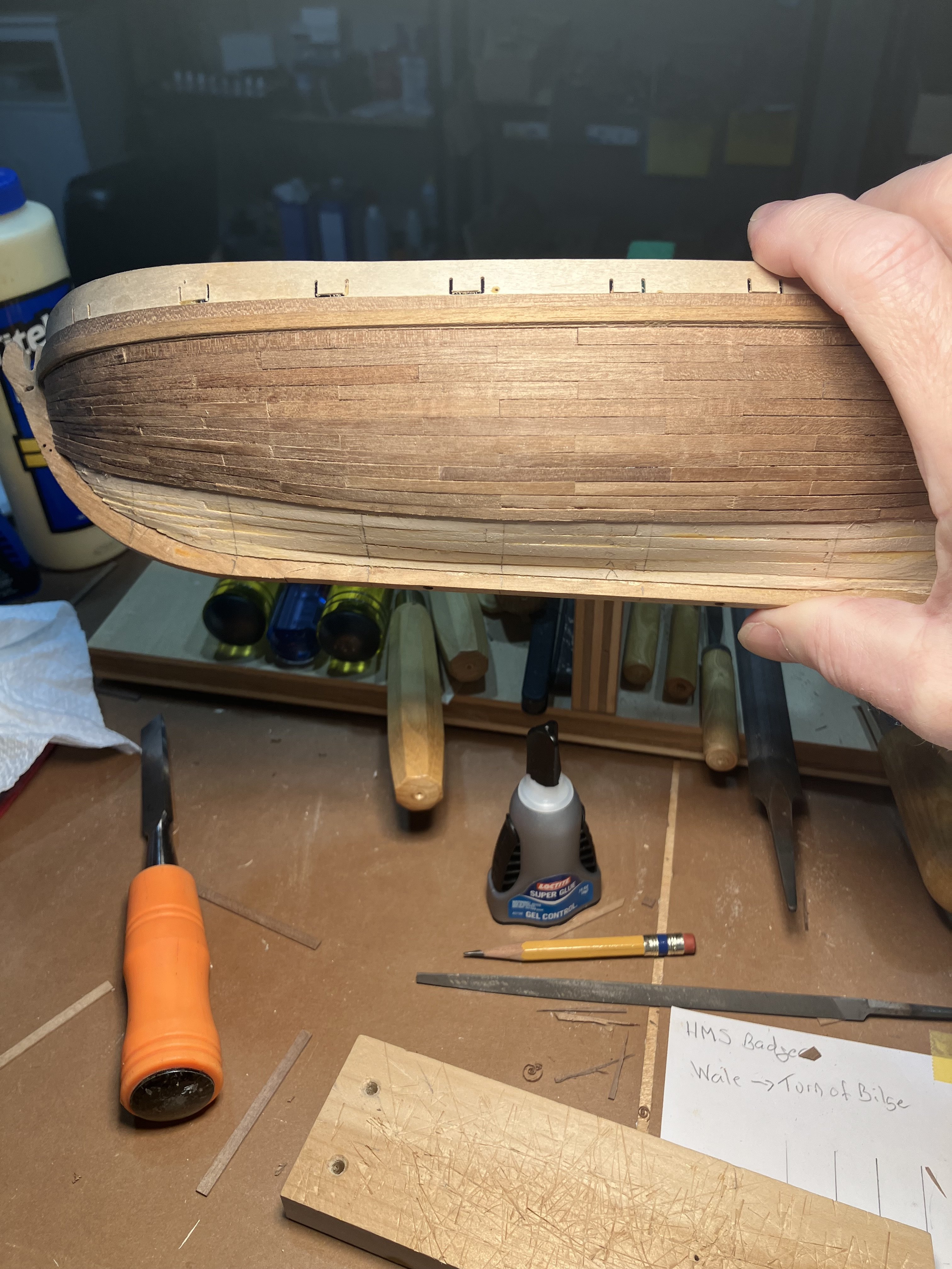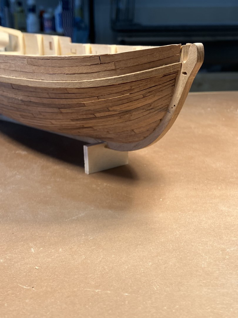 Second Planking Many ways to do this. Even after many hulls I still find this a challenge. My method is place the plank, mark where it overlaps the adjacent strake, taper with hand plane. I use dots of Titebond and 3m gel CA to install the planks. First cut the strips into 2 1/4” lengths to represent 12’ boards in 3/16” scale. Taper planks with the hand plane. Going along Check that the strakes follow the necessary curve, basically from the middle sweep up fore and aft. Use stealers aft, and drop strakes forward, as necessary. Use a sharp chisel and remove high spots along the edge to form smooth curve. Work the planks with a file to smooth edges, and high and low spots