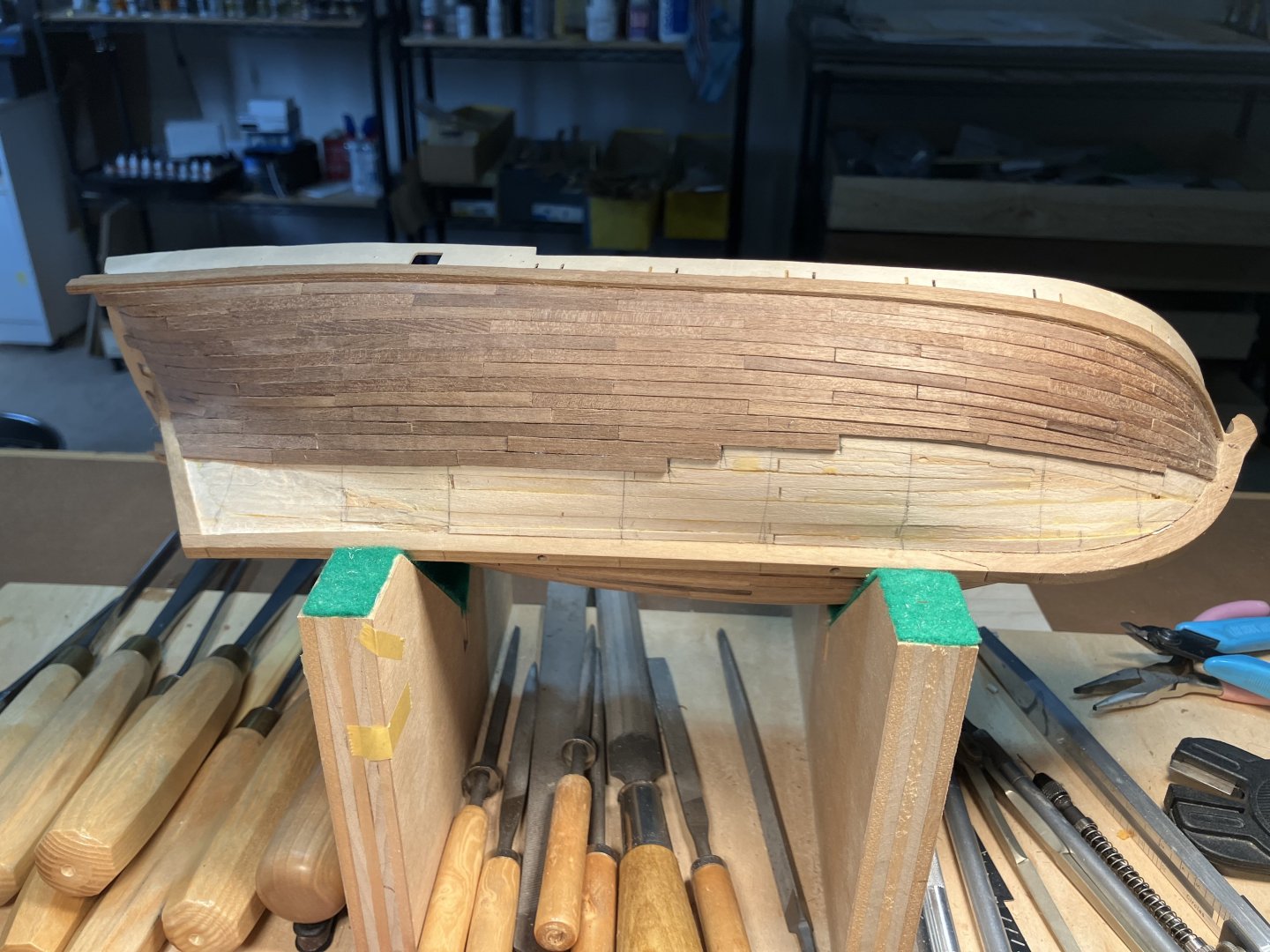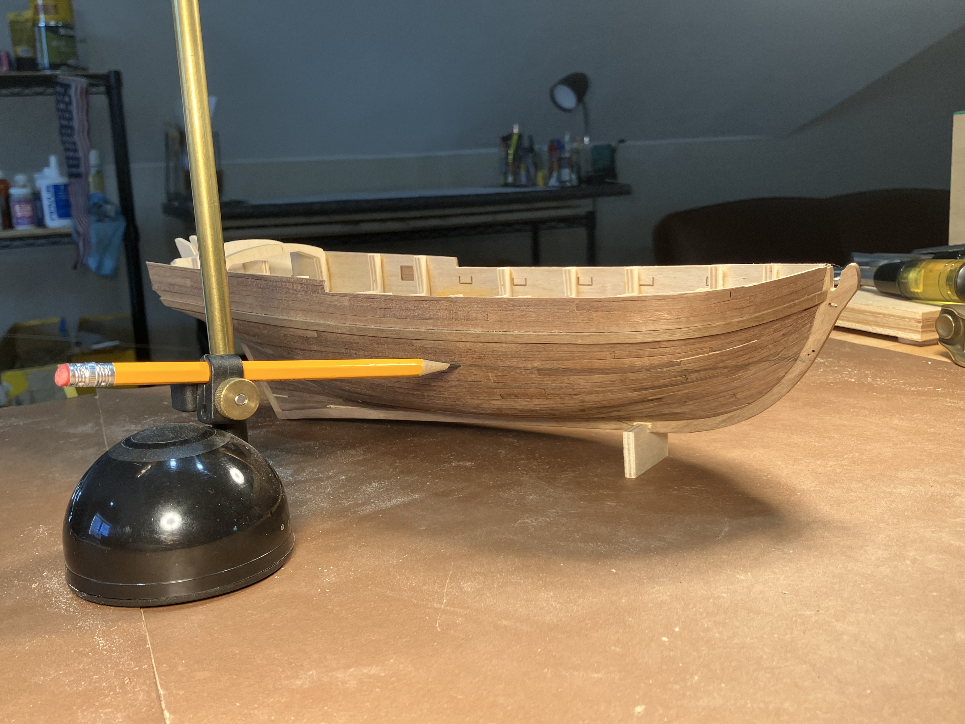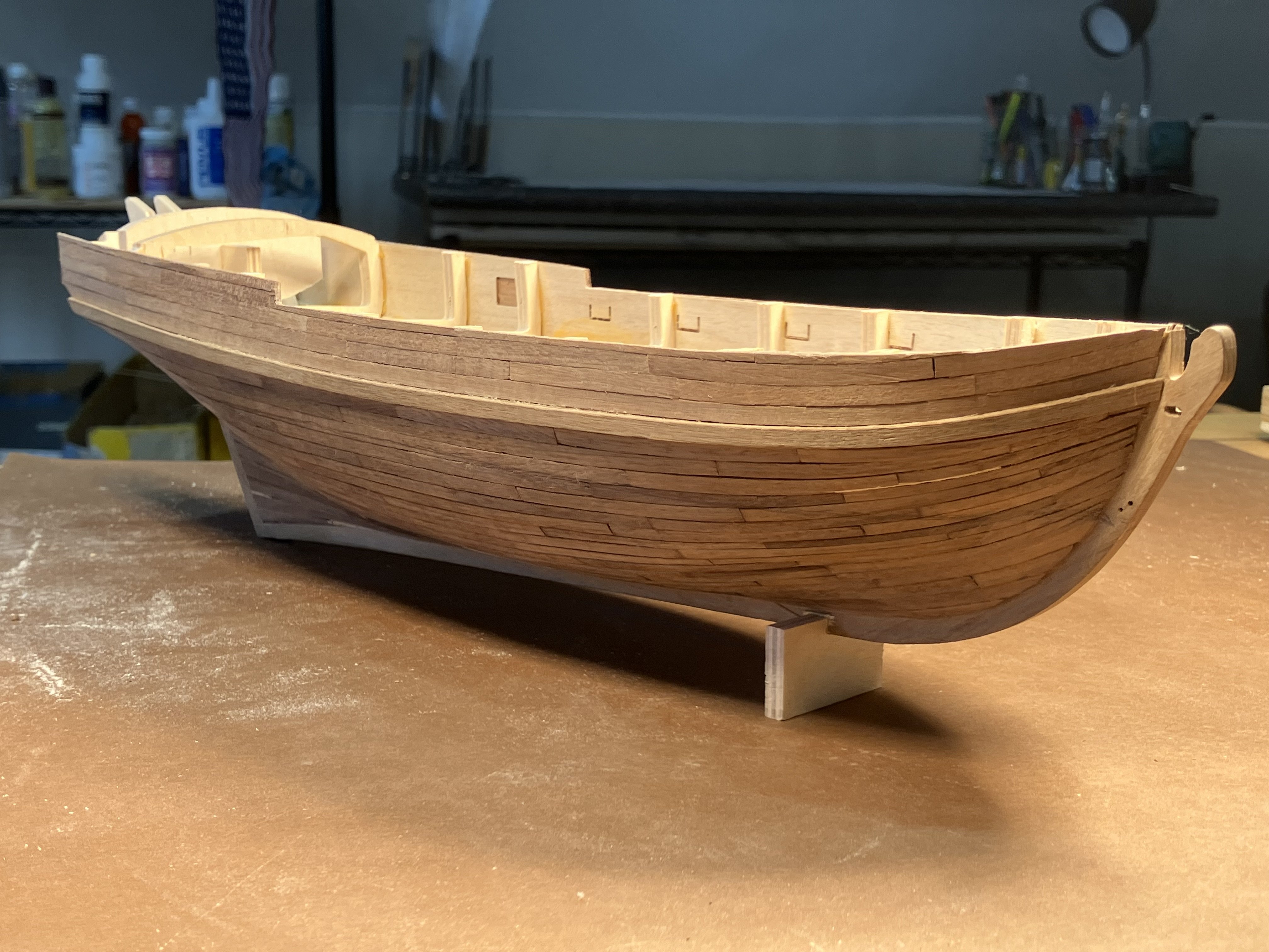 Second Planking Many ways to do this. Even after many hulls I still find this a challenge. My method is place the plank, mark where it overlaps the adjacent strake, taper with hand plane. I use dots of Titebond and 3m gel CA to install the planks. First cut the strips into 2 1/4” lengths to represent 12’ boards in 3/16” scale. Taper planks with the hand plane. Going along Check that the strakes follow the necessary curve, basically from the middle sweep up fore and aft. Use stealers aft, and drop strakes forward, as necessary. Use a sharp chisel and remove high spots along the edge to form smooth curve. Work the planks with a file to smooth edges, and high and low spots