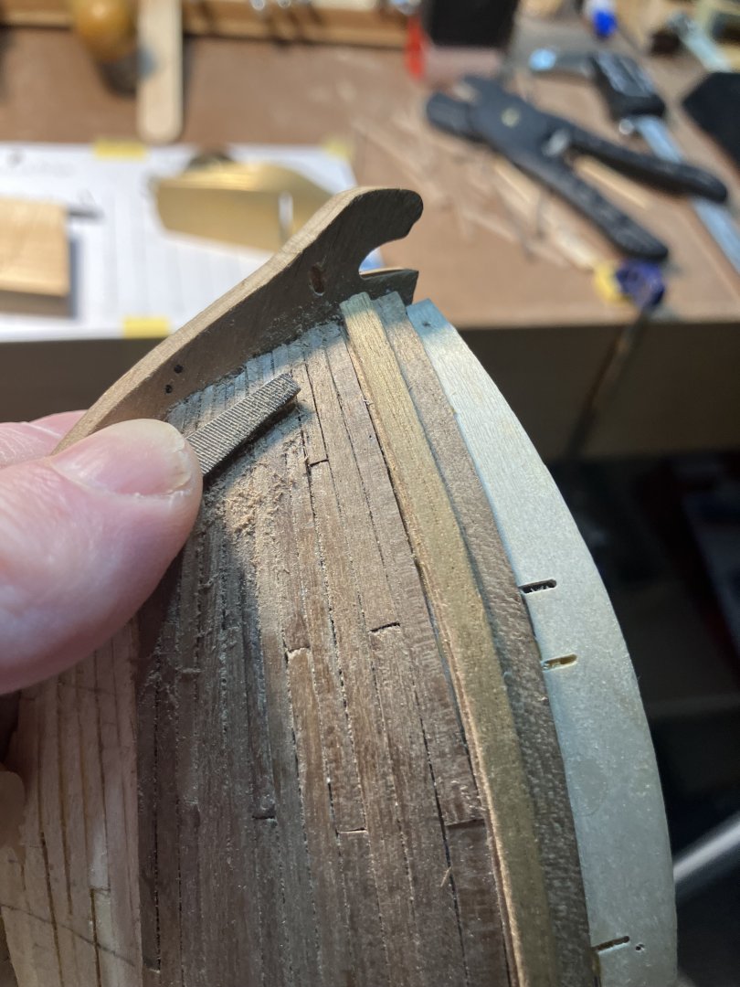 Planking Above the Wale & Marking the Waterline Planking above the Wale was unremarkable. As before installed the planks and worked the edges with a file. Trimmed upper strake, protruding above the gunport pattern, flush with the pattern. Also worked the plank ends meeting the stem into a smooth curve. Some small openings between the edges will be filled with Minwax filler. Finally marked the Waterline. The kit has a handy piece that fits on the keel to raise the bow to the appropriate height.