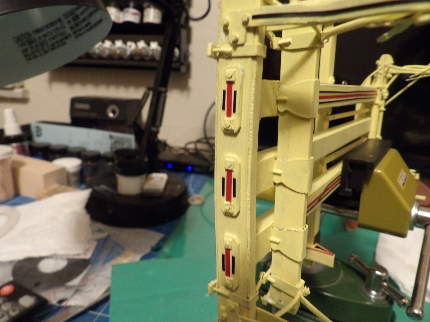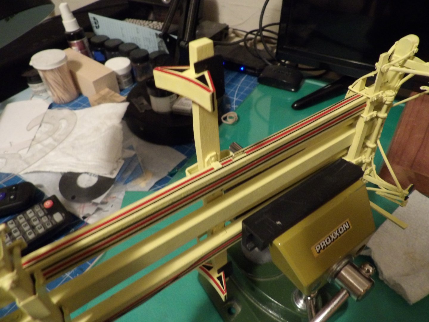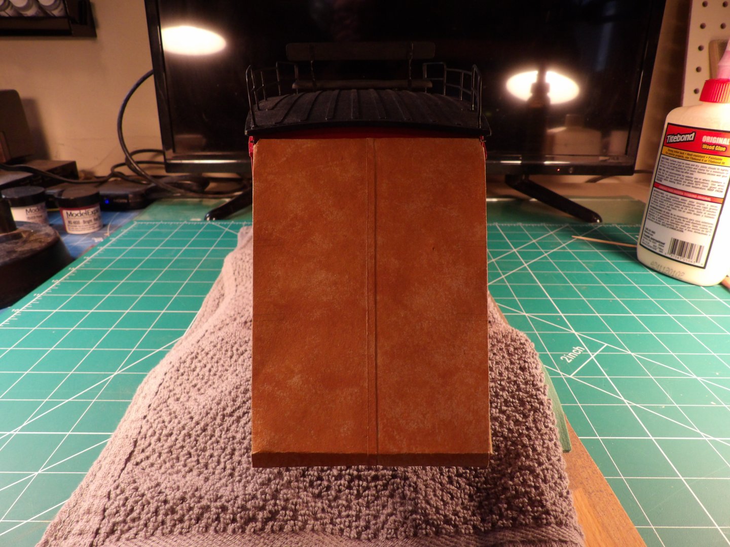 Planked the roof, and covered with provided cloth to simulate canvas. I used Mod Podge (new to me, mentioned in the manual) as the adhesive. Feels really solid now. Added rub rails to the roof and painted flat black: Made the passenger sway straps. I've been putting this off because initially I did not understand the instructions, but after re-reading a few hundred times it finally sunk into what remains of my grey matter. These four straps were my days work, and they are yet to be installed. The strap material is thin fibrous gasket material and is used to simulate leather. After assembly I gave them a wash of thinned paint, same as used for the "leather" seats inside the cabin. I had soldered the baggage rails earlier, and this represents a big step forward for me. I chemically blackened them yesterday and am very pleased with the results: