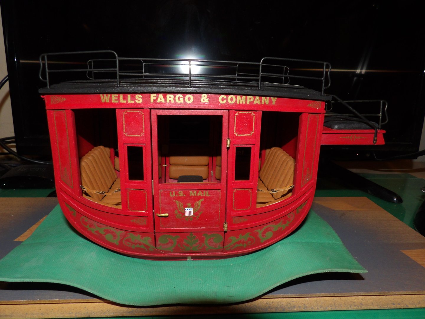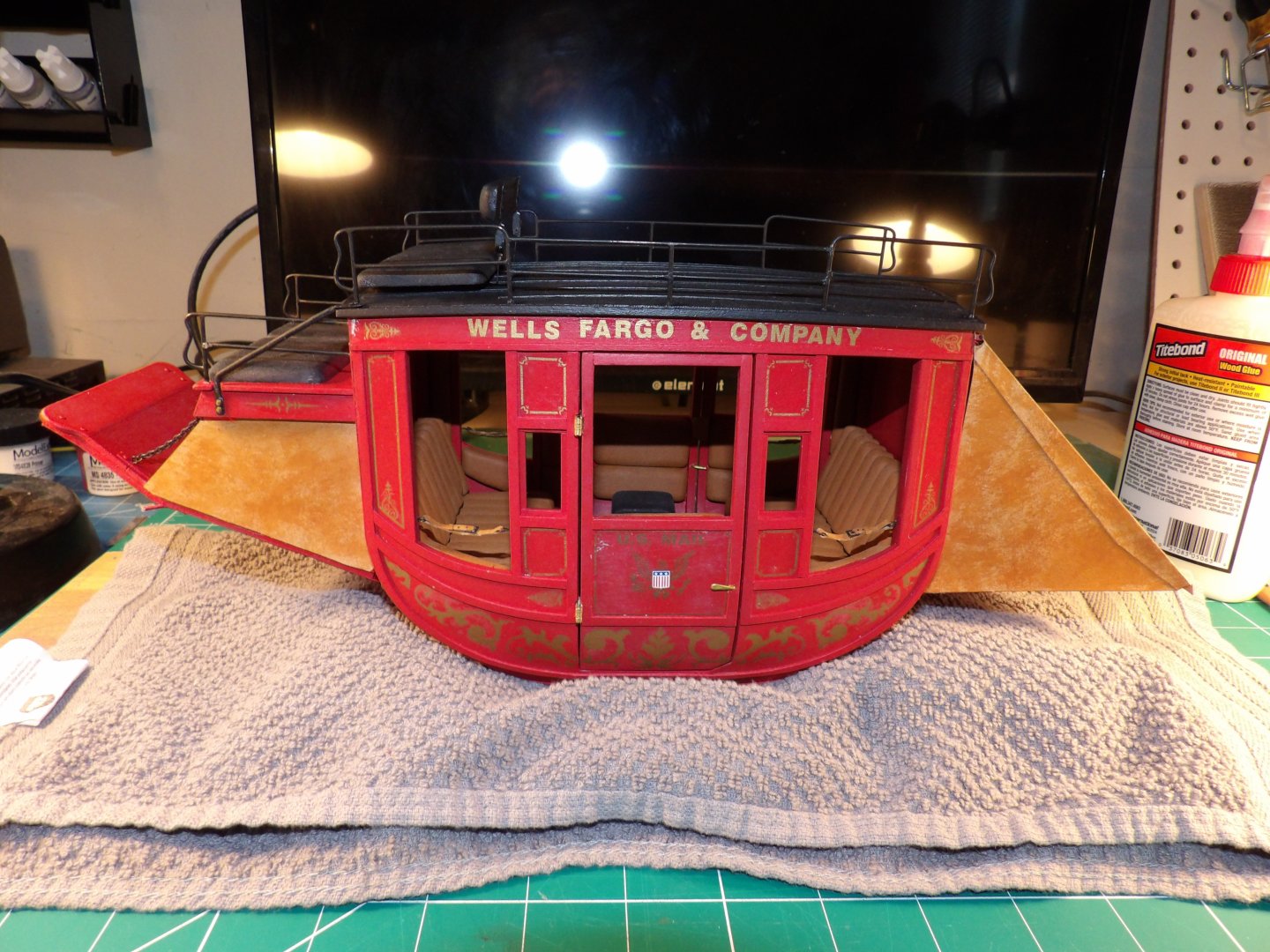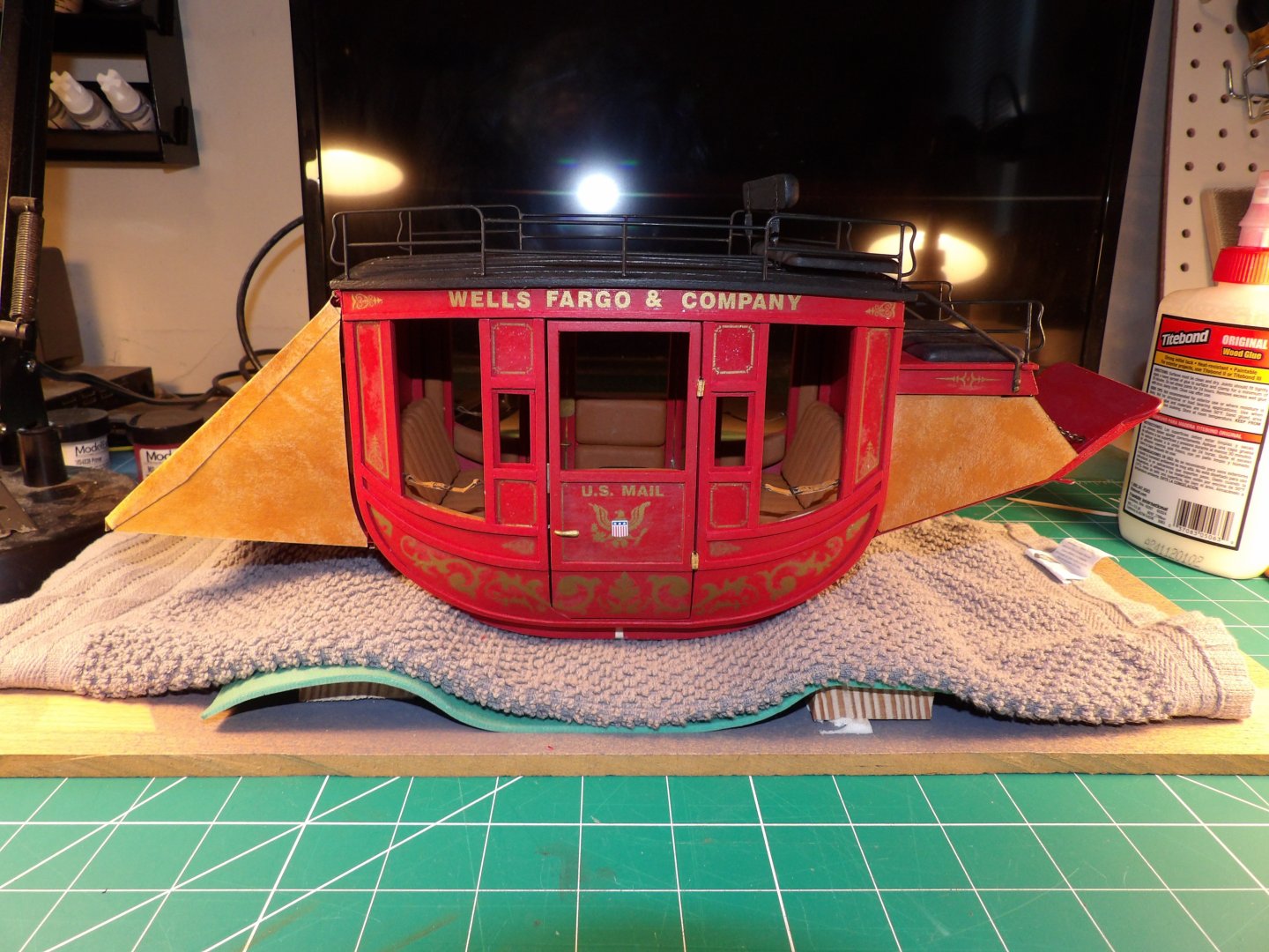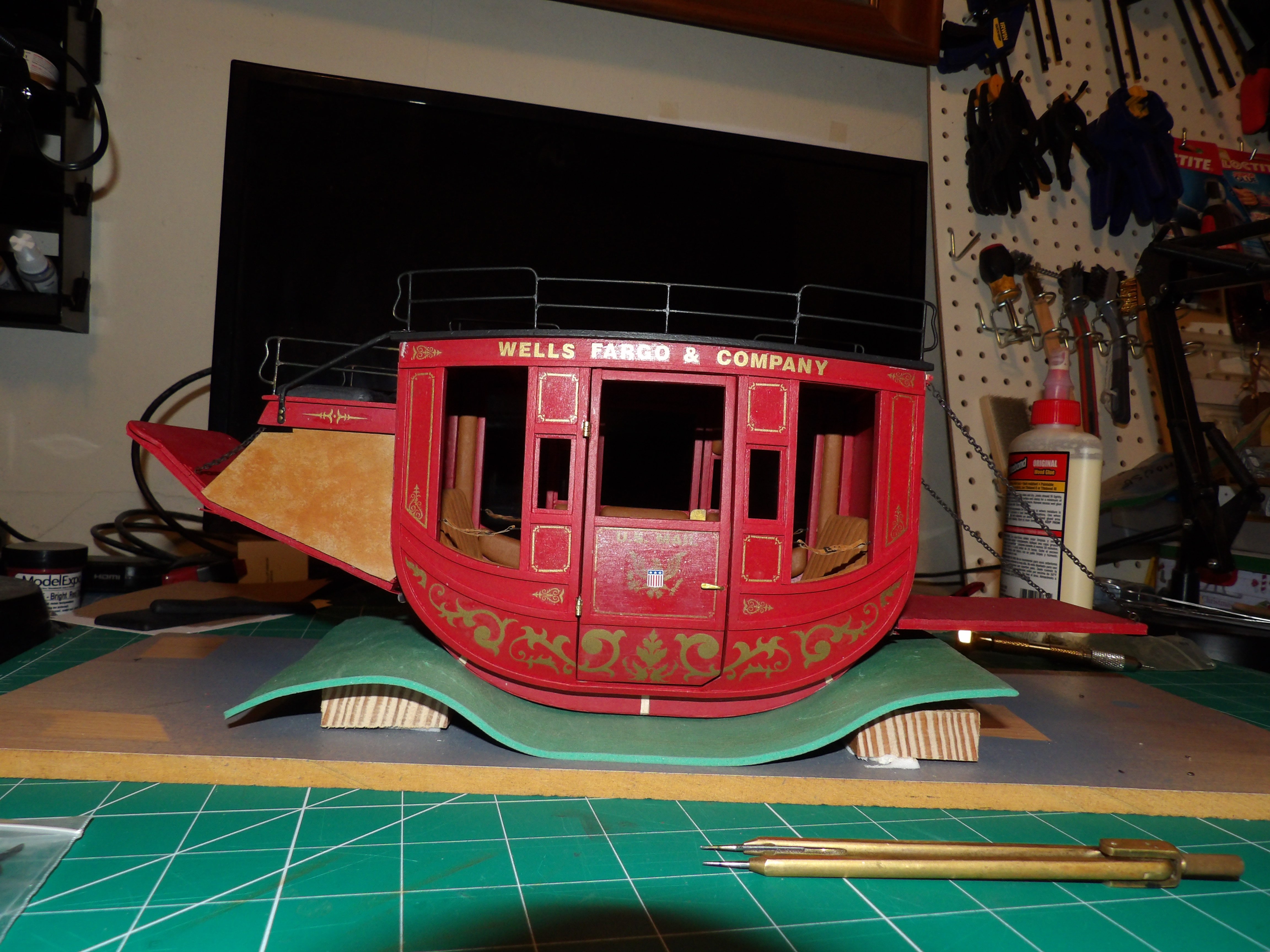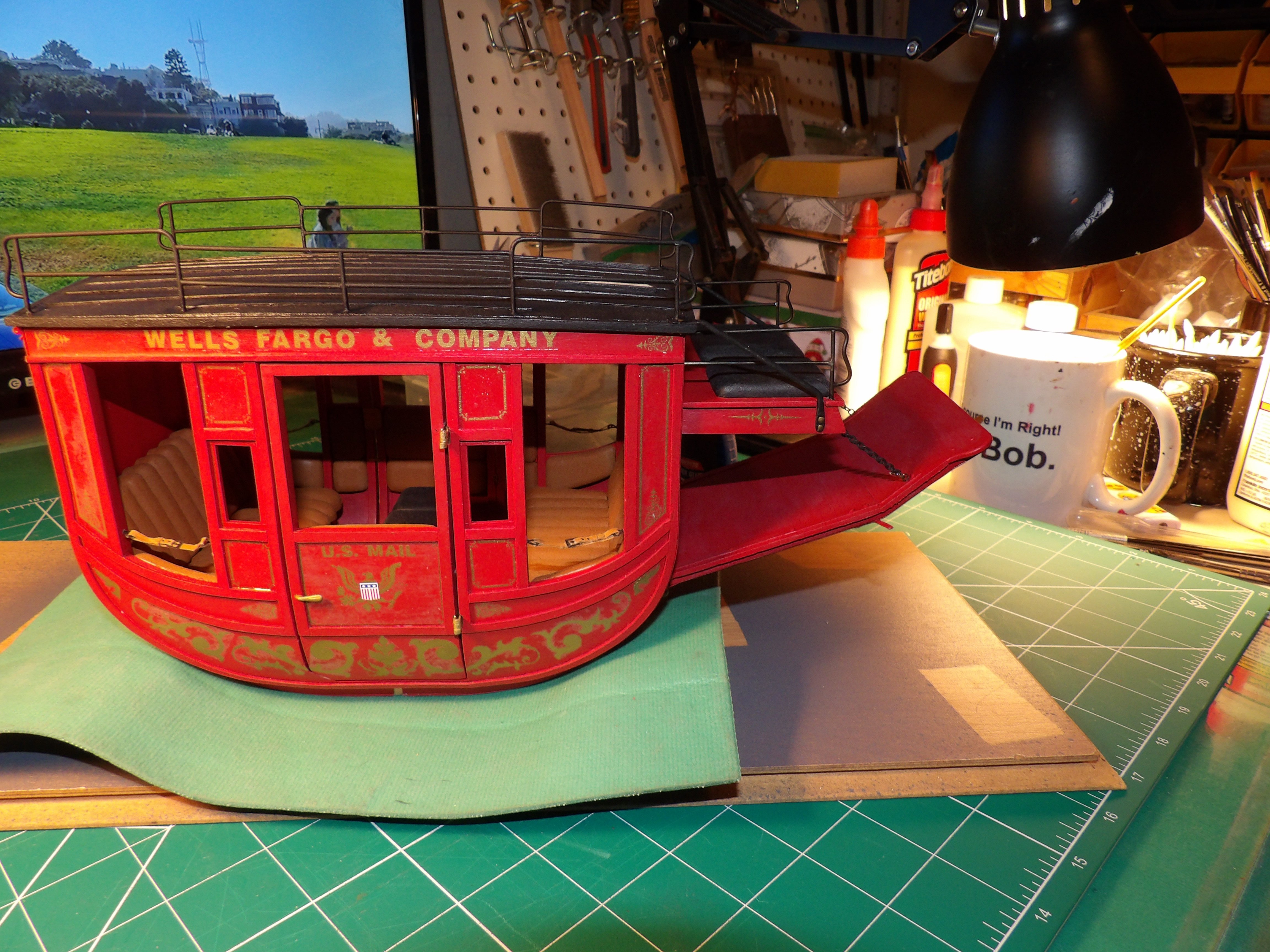 Took a detour and worked on other things for a while. I've been back to work on the Stagecoach for a while, but have neglected this build log. I finished the undercarriage subassemblies, finish painted and decorated in a manner similar to to the prototype. This is a good place to note that the kit designer spray painted most of his model, but for some perverse reason I chose to hand paint mine. This was a bad choice, haha. The striping is graphic tape, and if you look close I had trouble making it stick in some places. A shot of Dulcote seems to have fixed nicely. Got the topside baggage rails on. These are very delicate and there were a couple of breaks, but it came out OK. Also added the driver's seat and rails. Added the front boot, and then the "leathers." Added the rear boot and leathers. Straps still need to be added: Added the topside seat: