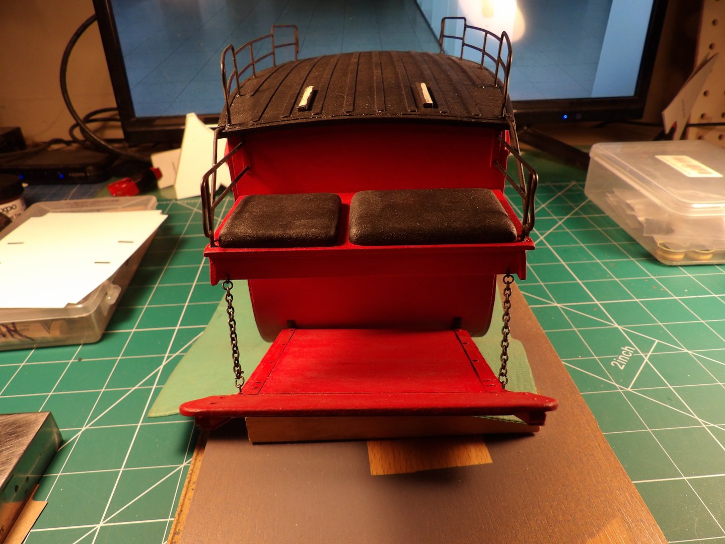 I've not been good about updating this log. Jumping around a lot, as I do- but shaping all of the seat and side cushions took quite a while. . . Today I joined the sides to the bottom, which took a certain amount of swearing, but I'm happy enough with the results: Was hoping to make the doors operable, but after many tries, was happy enough just to get them in as fixed in place. The compound curves make this very tricky indeed. Work will continue on the undercarriage, which is very complex considering this time period, but for now I am enjoying the coach body more. . .